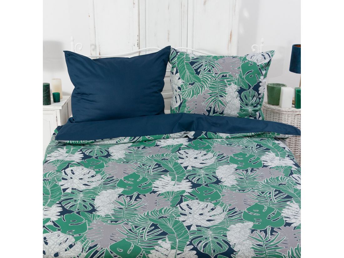 Pościel dwustronna z jednej strony kwiatowy wzór liści monstery z drugiej strony magiczny granatowy kolor, to wyjście z monotonii oraz obiekt pożądania wszystkich ceniących luksus i elegancja w swojej sypialni.