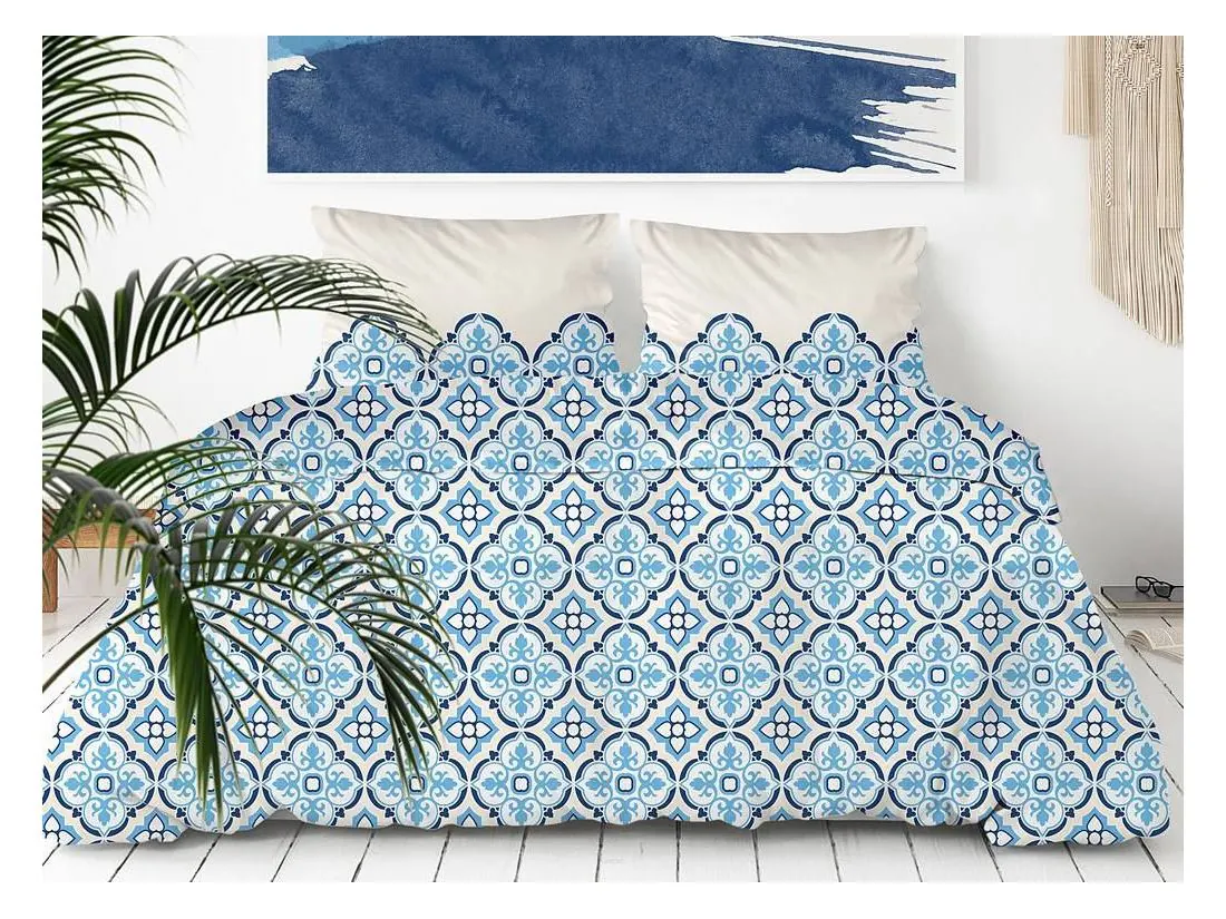 Modny wzór pościeli satynowej znakomicie wkomponowany w modną kolorystykę biało niebieskiej z fantazyjnym wzorem intryguje oraz przyciąga wzrok. Stylistyka pościeli Gold Line to połączenie tradycji z nowoczesnością tworząca niezwykłą elegancką kompozycje która nada niecodzienny charakter oraz wyjątkowy urok każdej sypialni.