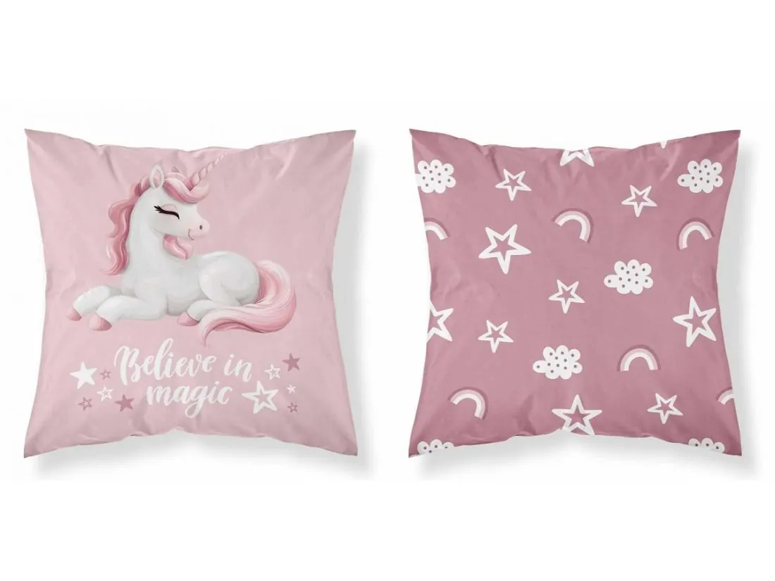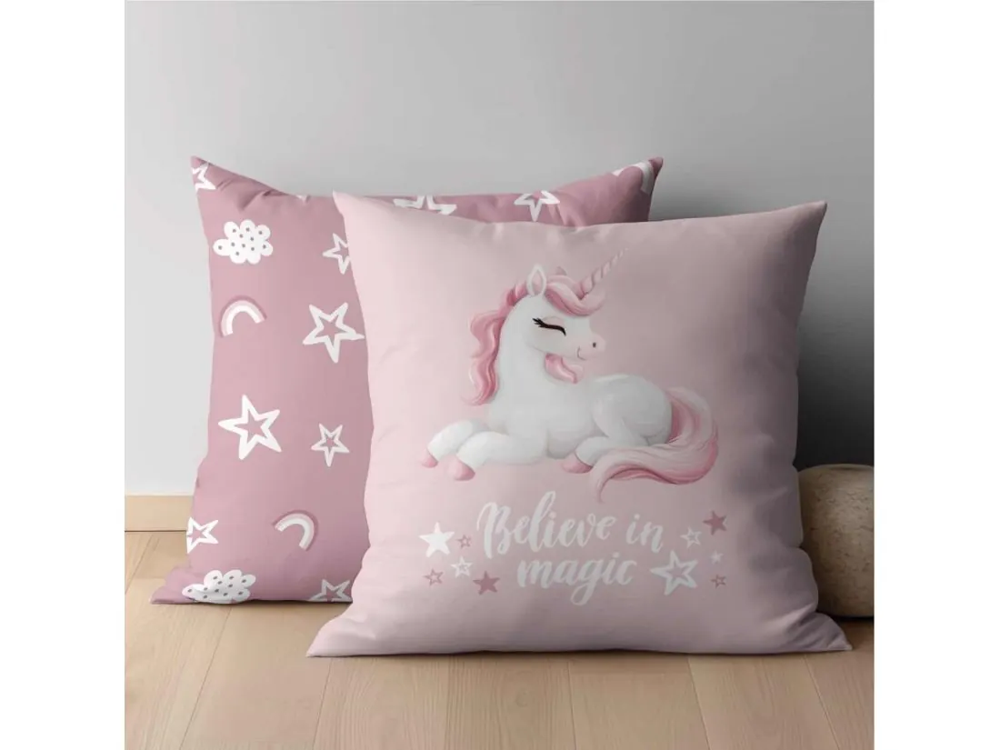 Dwustronna poszewka dziecięca z kolekcji Magiczny Przyjaciel – Jednorożec – pełna uroku, fantazji i kolorów, stworzona z myślą o małych miłośnikach baśniowych przygód.