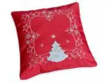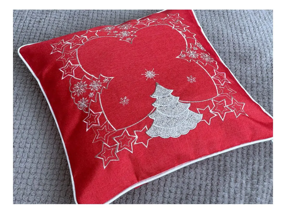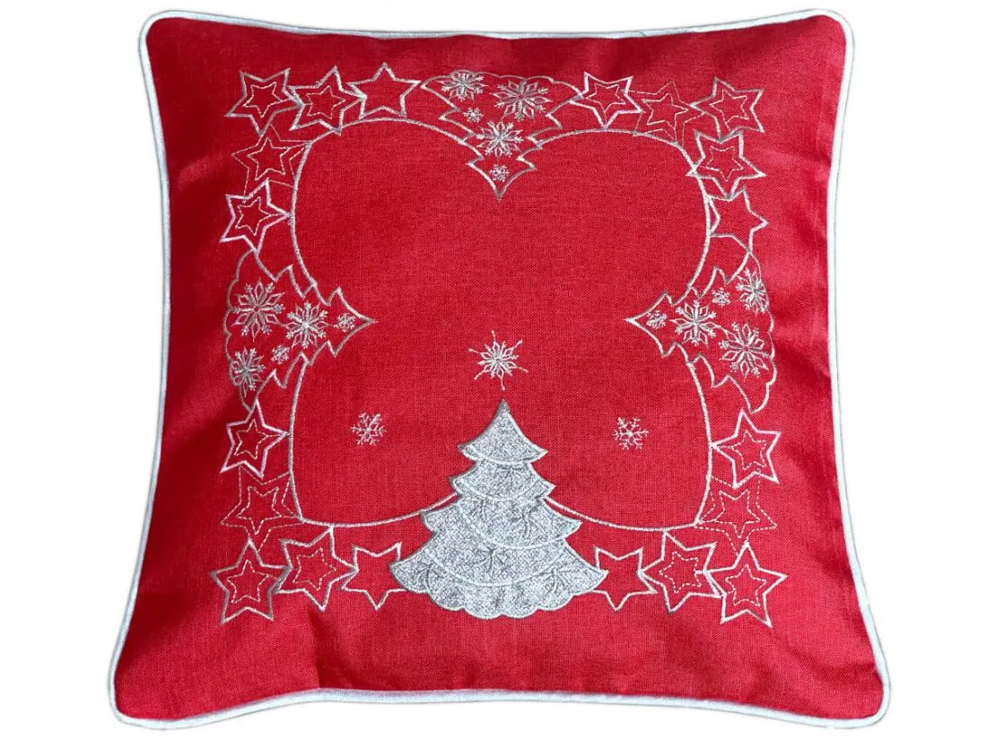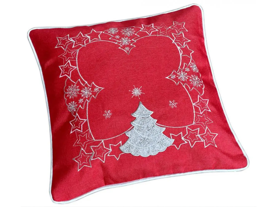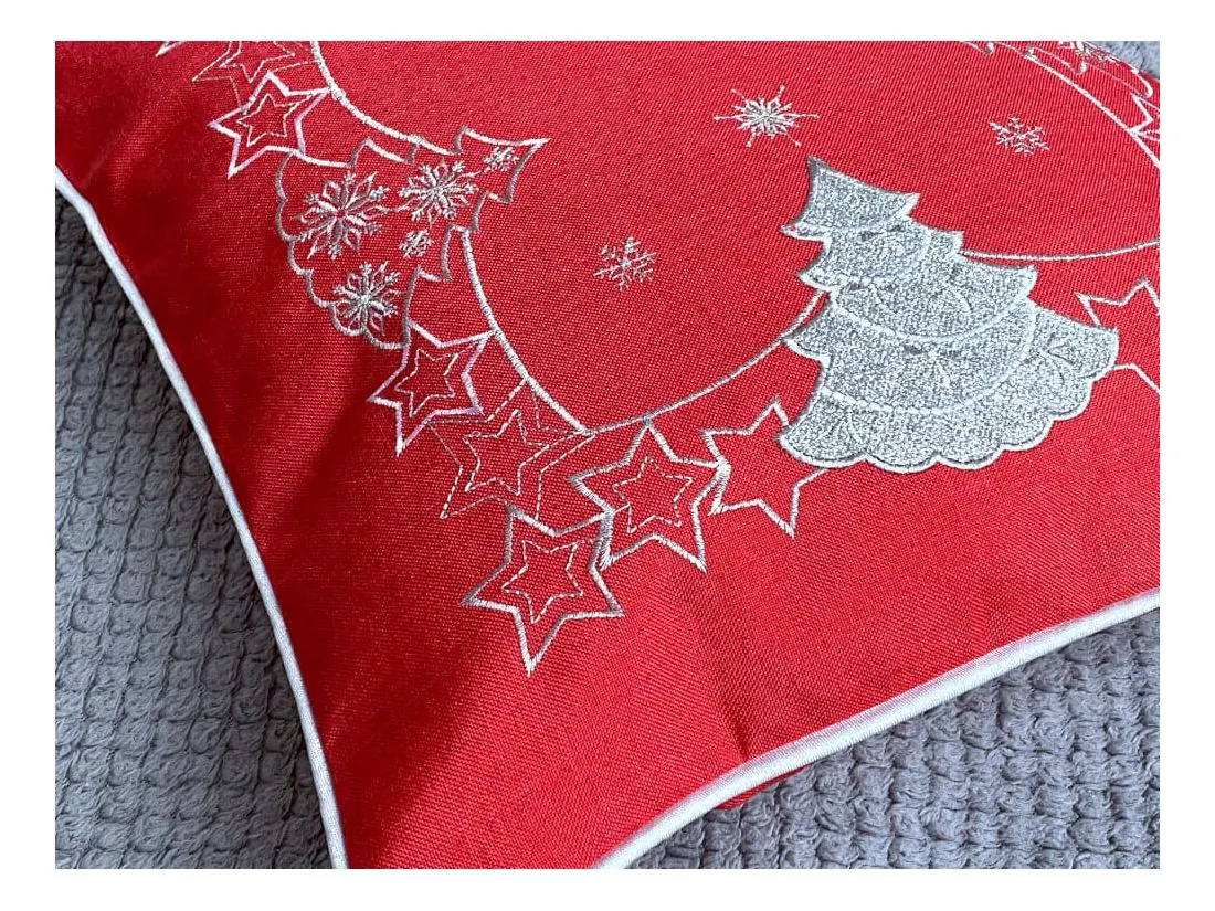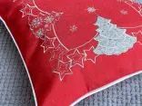 Dekoracyjna poszewka w rozmiarze 40x40 cm w kolorze czerwonym została wykonana na tkaninie 100 % poliester, charakteryzuje się świątecznym wzorem oraz modnym kolorem z precyzyjnie naszytej srebrno brokatowej choinki w otoczeniu magicznych gwiazdek, która magicznie podkreśli klimat Świąt Bożego Narodzenia. Brzegi poszewki otacza srebrna lamówka.