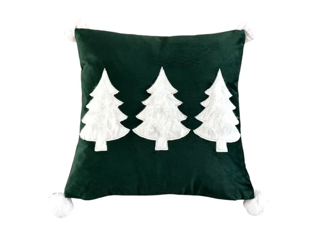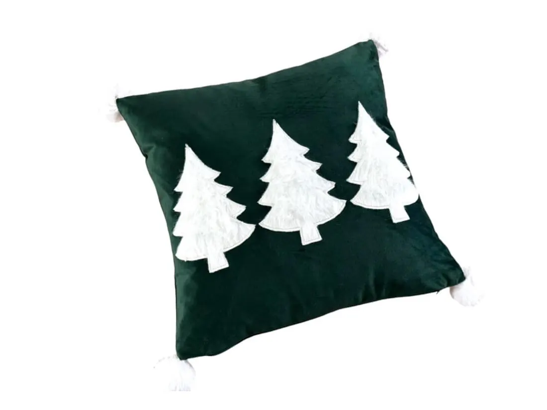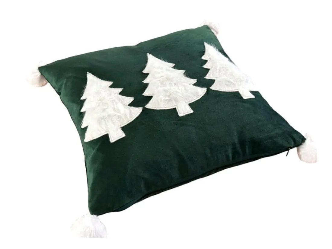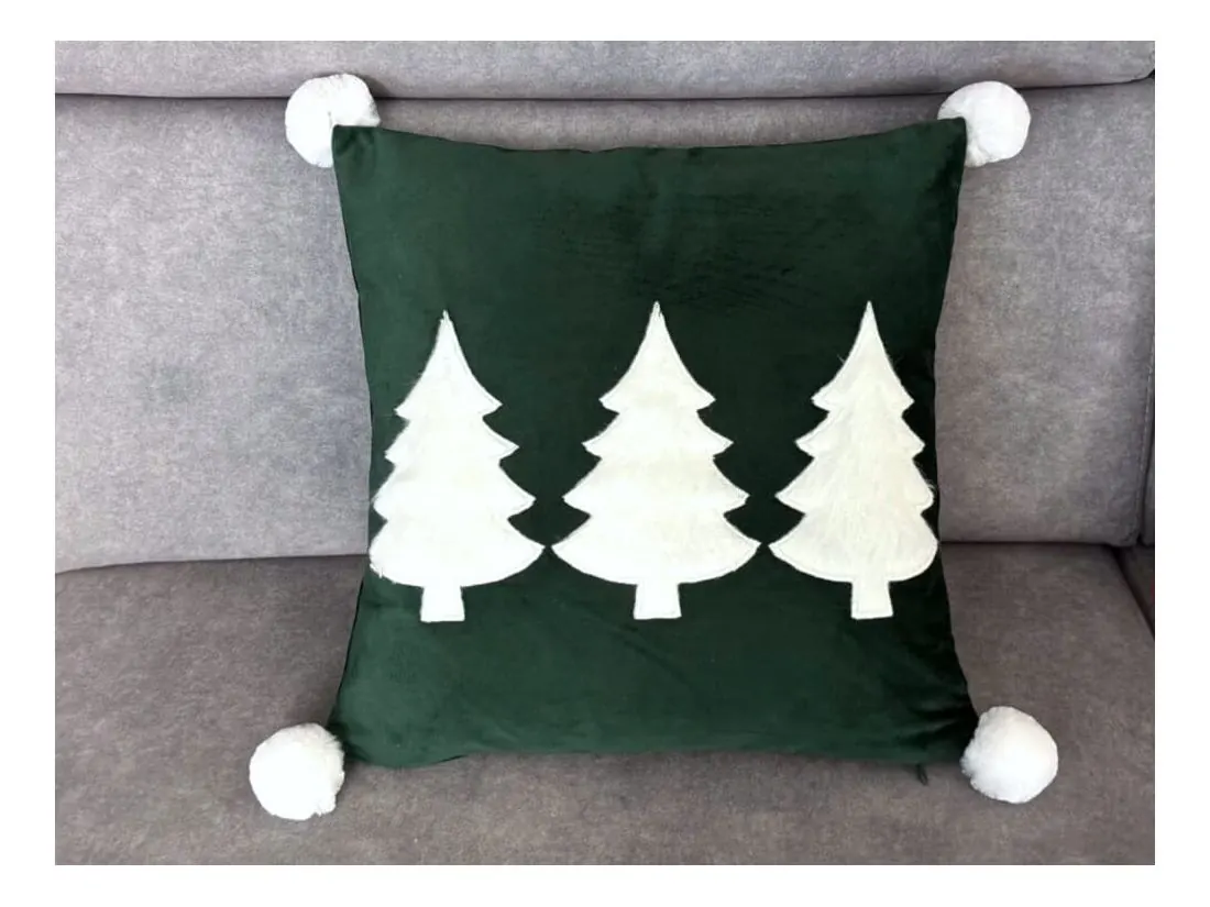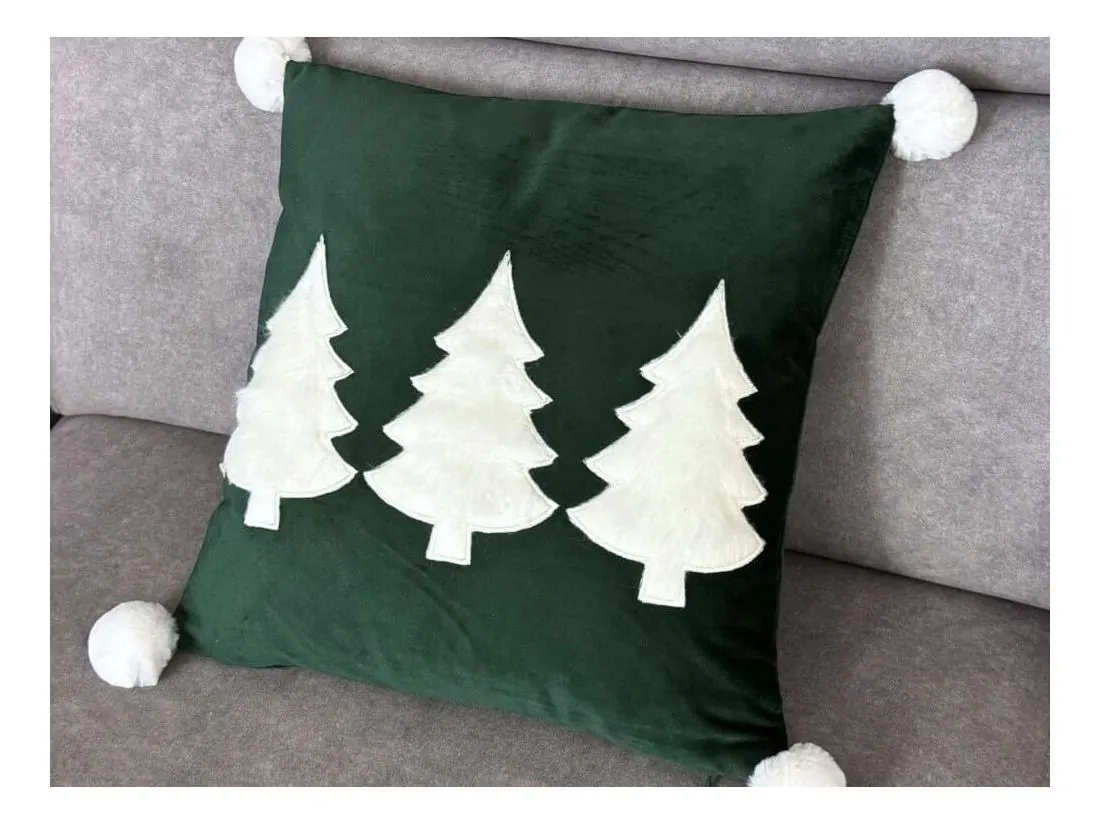 Wprowadź świąteczny nastrój do swojego domu dzięki welwetowej poszewce w eleganckim odcieniu ciemnej zieleni. Wykonana w 100% z wysokiej jakości poliestru, poszewka o wymiarach 40x40 cm łączy estetykę z trwałością, co czyni ją idealnym wyborem na wiele sezonów.Poszewkę zdobią subtelne, futerkowe choinki w kolorze białym, które efektownie kontrastują z tłem, tworząc delikatny, zimowy wzór. Przy każdym rogu znajdują się mięciutkie, białe pompony, dodające całości lekkości i odrobiny świątecznej magii. Pompony te przyciągają wzrok i tworzą atmosferę pełną ciepła i przytulności.