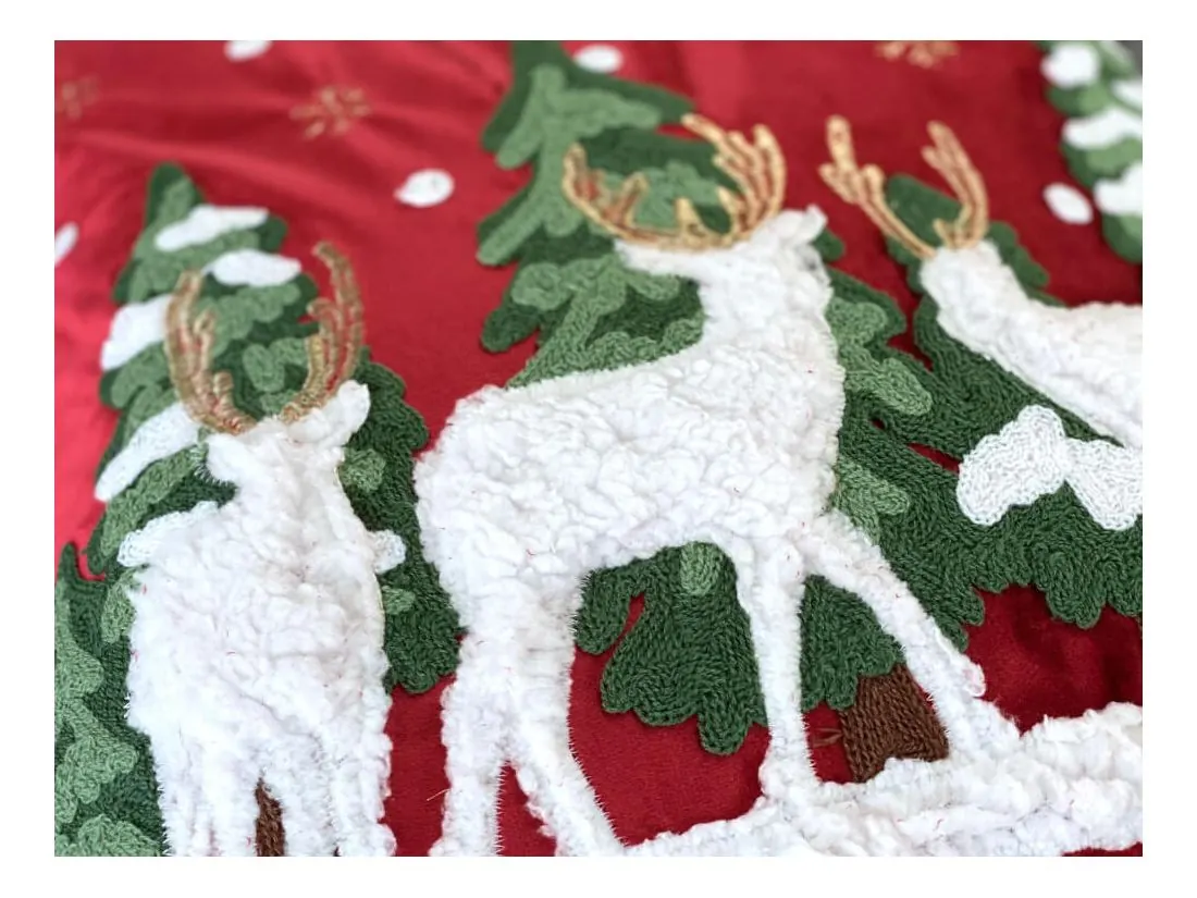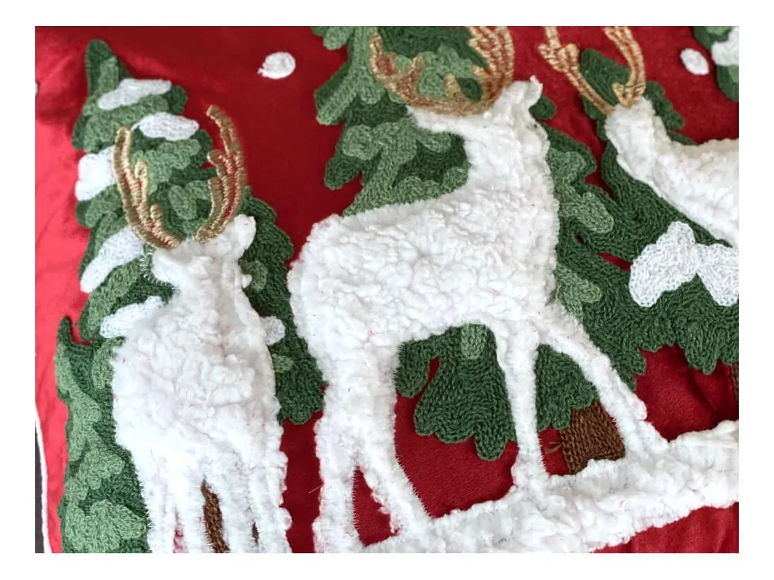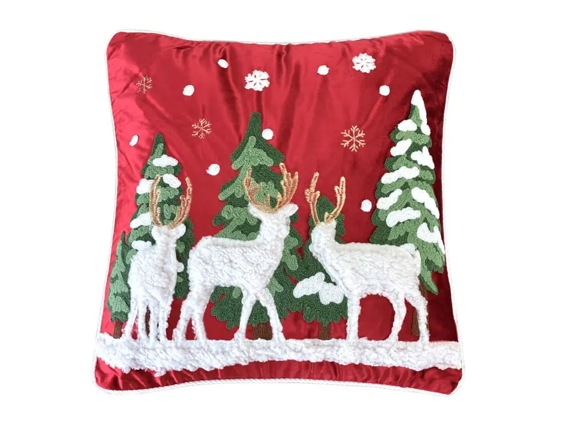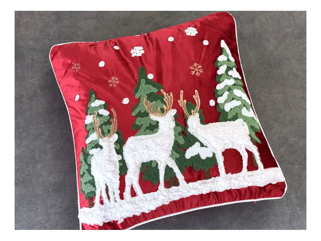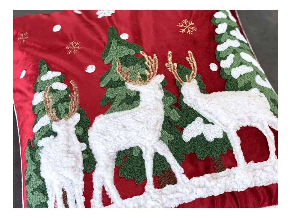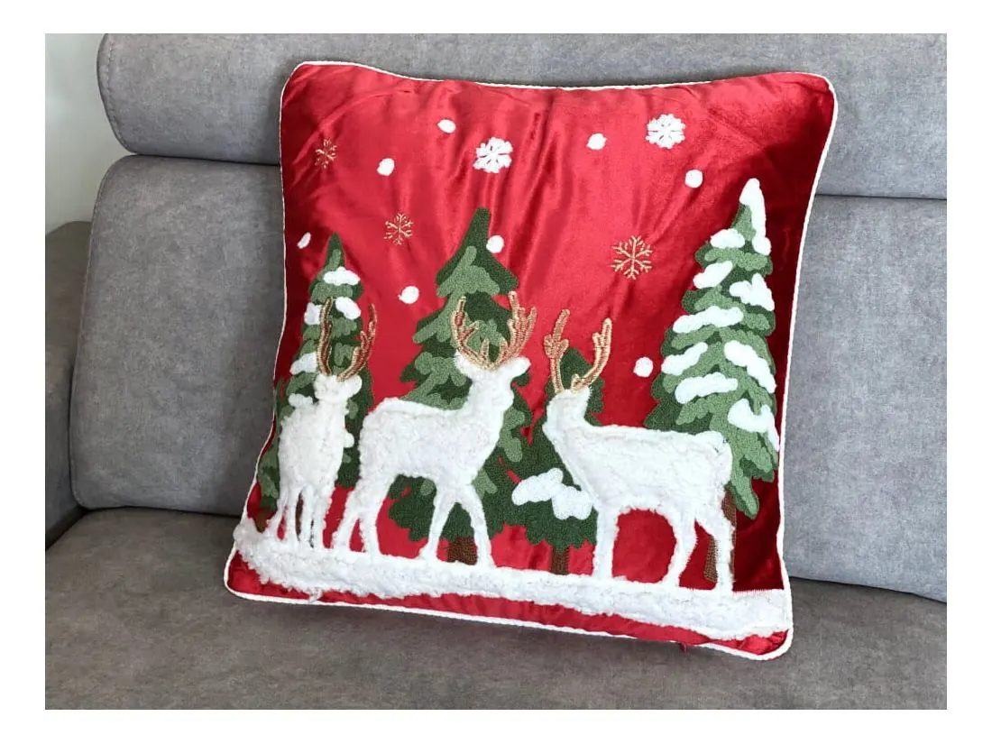 Ta świąteczna, welwetowa poszewka to idealny wybór na zimowy czas, wprowadzający do wnętrza elegancję i magię świąt. Wykonana w całości z miękkiego, wysokiej jakości poliestru, poszewka o wymiarach 45x45 cm przyciąga wzrok głęboką, świąteczną czerwienią i subtelnym połyskiem materiału. Jej aksamitna, gładka struktura tworzy efekt przytulności i klasy, który doskonale uzupełnia każde wnętrze, od klasycznych po nowoczesne.Poszewka wyposażona jest w niewidoczny zamek błyskawiczny, który zapewnia jej wygodne użytkowanie oraz schludny wygląd. Świąteczny nastrój podkreślają wyraziste detale w postaci haftowanych choinek i uroczych reniferów, które zdobią powierzchnię poszewki. Aplikacje z miękkiego pluszu dodają jej trójwymiarowego efektu, a bogaty, gruby haft łańcuszkowy przyciąga wzrok i nadaje ozdobie wyjątkowego charakteru.
