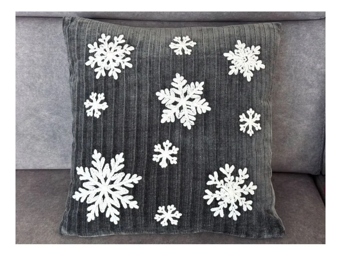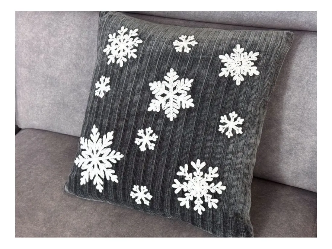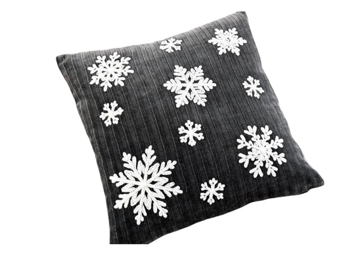Świąteczna poszewka dekoracyjna o wymiarach 40x40 cm to idealny wybór na sezon świąteczny , który doda przytulności i magii każdemu wnętrzu. Wykonana z wysokiej jakości dzianiny w modnym, intensywnie szarym kolorze, poszewka przyciąga wzrok i doskonale komponuje się z innymi świątecznymi dekoracjami. Jej powierzchnię zdobią misternie haftowane, białe śnieżynki, które wnoszą do wnętrza delikatny, zimowy klimat i odrobinę elegancji.Materiał to 100% poliester, co zapewnia jej odporność na zagniecenia, łatwość w pielęgnacji i wytrzymałość – będzie cieszyć oko przez wiele sezonów. Praktyczne zapięcie na zamek błyskawiczny, umiejscowione na dolnej krawędzi, nie tylko ułatwia wkładanie poduszki, ale też jest dyskretne, dzięki czemu zachowuje estetyczny wygląd.