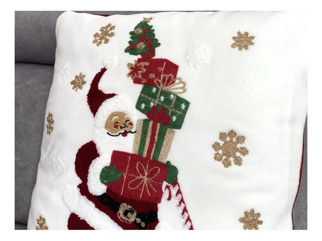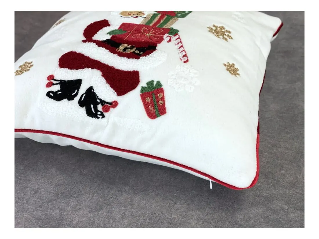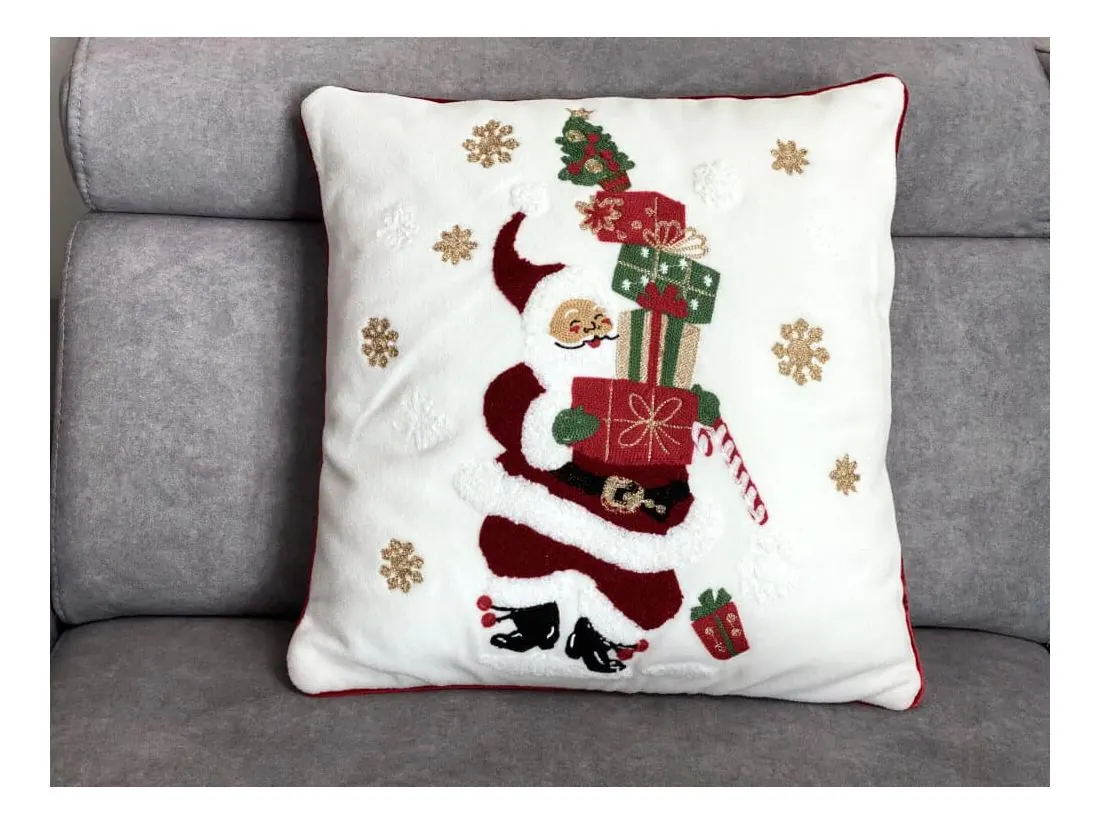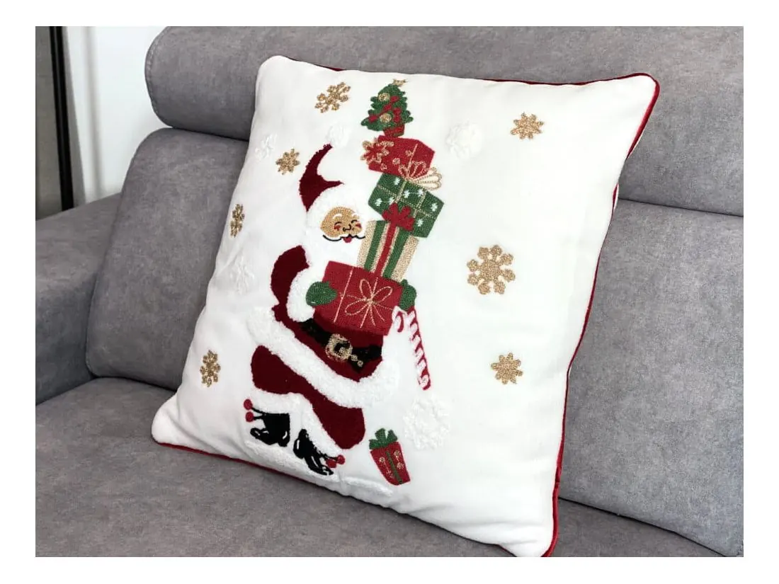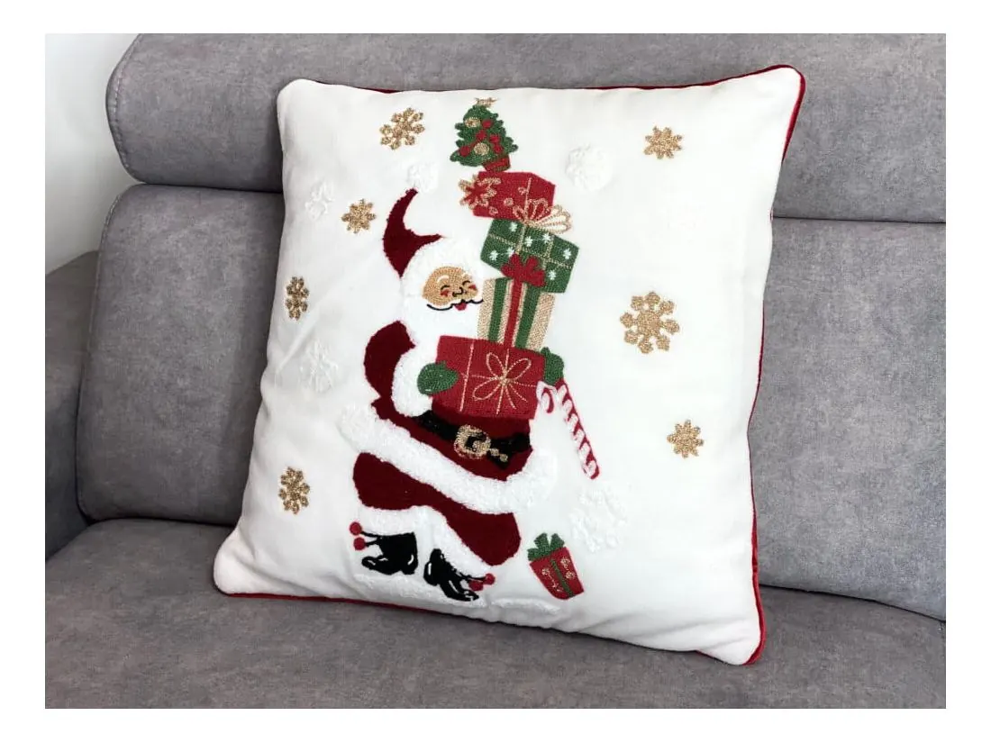 Otaczające Mikołaja delikatne, haftowane śnieżynki subtelnie dopełniają zimowy nastrój, przypominając o mroźnych, świątecznych dniach. Dodatkowo, całość została wykończona intensywnie czerwoną lamówką, która biegnie wzdłuż całego obwodu poszewki, tworząc wyrazisty akcent i dodając jej świątecznej elegancji.