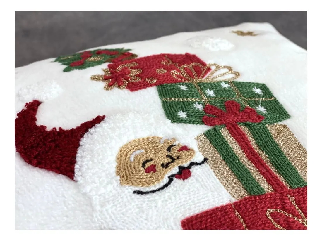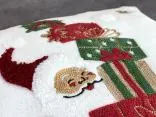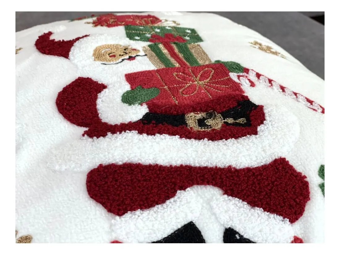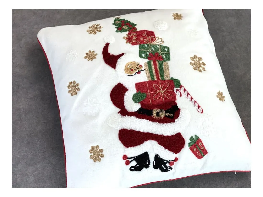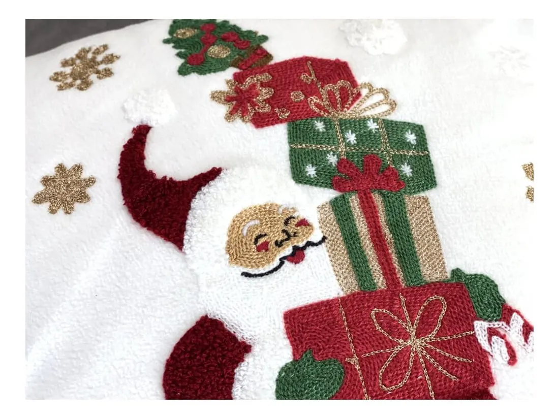 Otaczające Mikołaja delikatne, haftowane śnieżynki subtelnie dopełniają zimowy nastrój, przypominając o mroźnych, świątecznych dniach. Dodatkowo, całość została wykończona intensywnie czerwoną lamówką, która biegnie wzdłuż całego obwodu poszewki, tworząc wyrazisty akcent i dodając jej świątecznej elegancji.