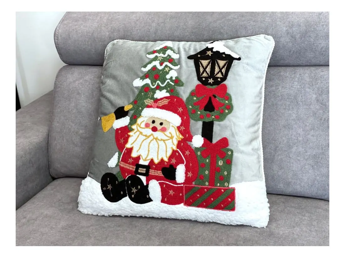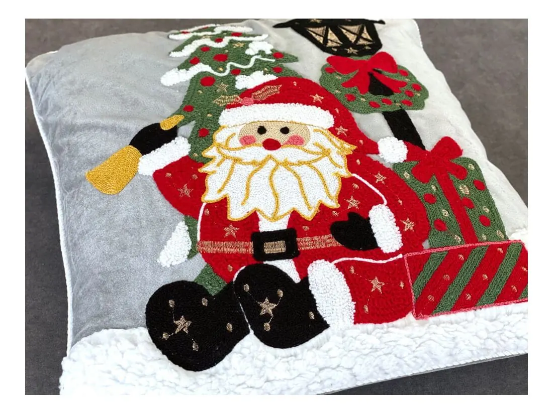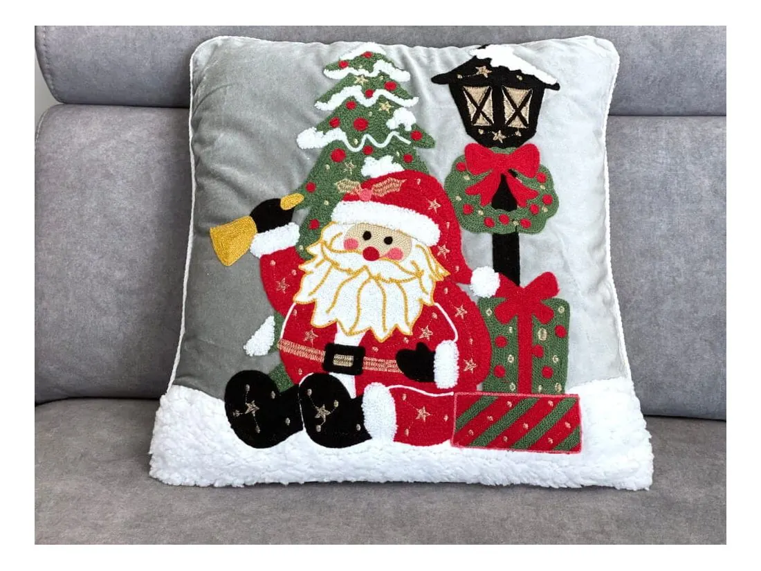 Przywitaj świąteczny czas z elegancką poszewką na poduszkę, która doda wyjątkowego uroku każdemu wnętrzu. Wykonana w 100% z poliestru, zachwyca gładkim i połyskującym welwetem w stylowym odcieniu szarości. Materiał delikatnie odbija światło, wprowadzając subtelny blask, który idealnie komponuje się z bożonarodzeniową dekoracją.Na centralnym miejscu znajduje się pięknie wykonany w technice haftu łańcuszkowego Mikołaj z workiem pełnym prezentów. Postać jest mocno zaakcentowana i osadzona na tle delikatnego "śniegu" wykonanego z materiału o fakturze przypominającej miękkiego baranka, co nadaje poszewce głębi i przytulności. Cała poszewka została obszyta białym sznurkiem wzdłuż krawędzi, co stylowo podkreśla jej kształt i dodaje elegancji.