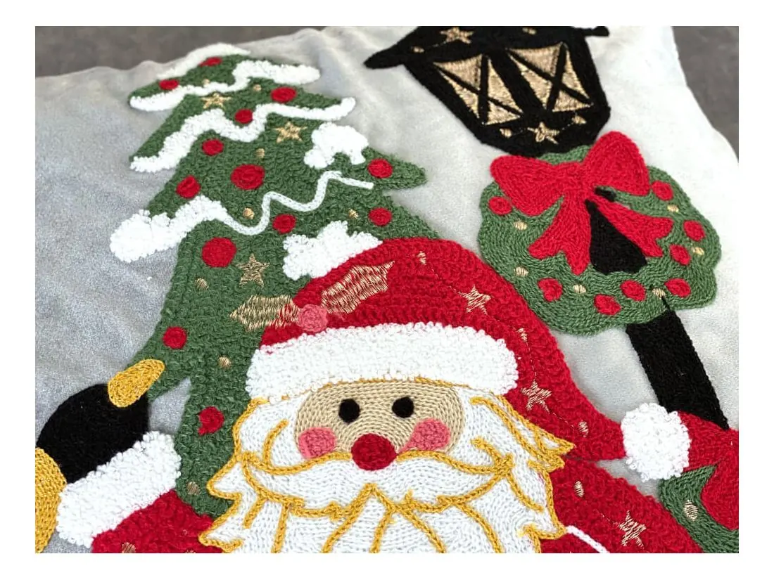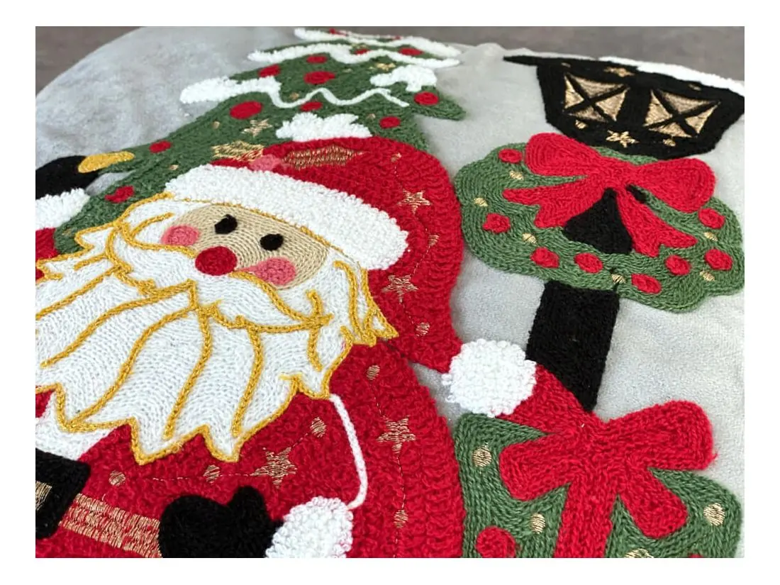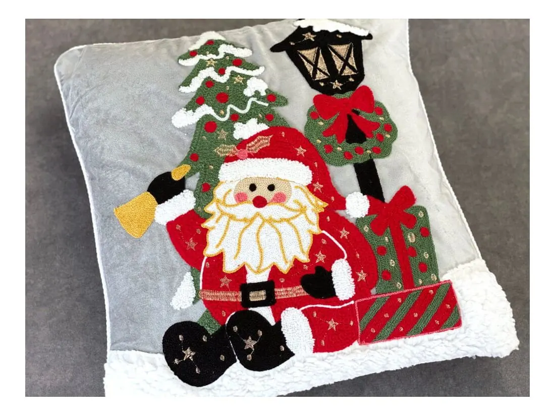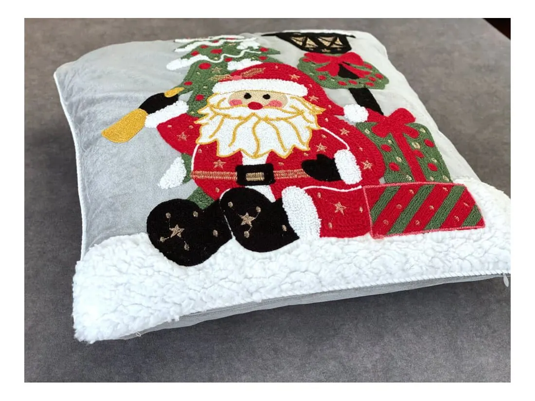 Przywitaj świąteczny czas z elegancką poszewką na poduszkę, która doda wyjątkowego uroku każdemu wnętrzu. Wykonana w 100% z poliestru, zachwyca gładkim i połyskującym welwetem w stylowym odcieniu szarości. Materiał delikatnie odbija światło, wprowadzając subtelny blask, który idealnie komponuje się z bożonarodzeniową dekoracją.Na centralnym miejscu znajduje się pięknie wykonany w technice haftu łańcuszkowego Mikołaj z workiem pełnym prezentów. Postać jest mocno zaakcentowana i osadzona na tle delikatnego "śniegu" wykonanego z materiału o fakturze przypominającej miękkiego baranka, co nadaje poszewce głębi i przytulności. Cała poszewka została obszyta białym sznurkiem wzdłuż krawędzi, co stylowo podkreśla jej kształt i dodaje elegancji.