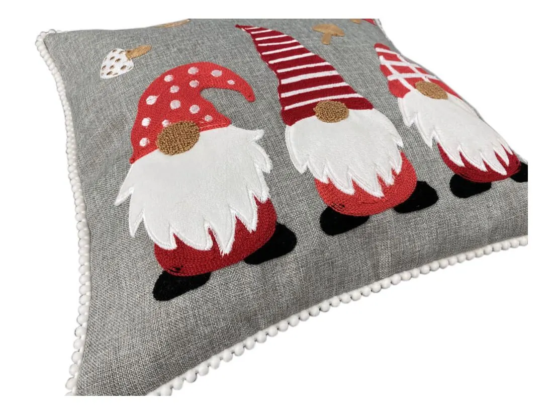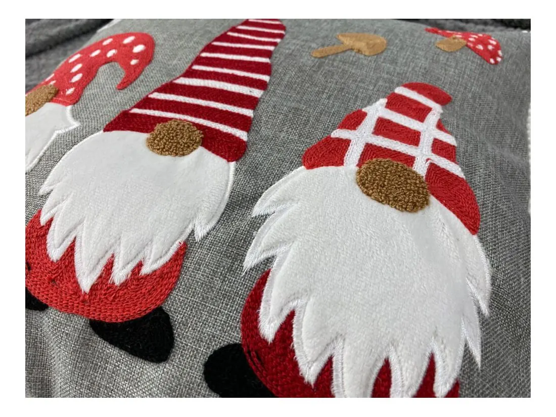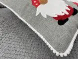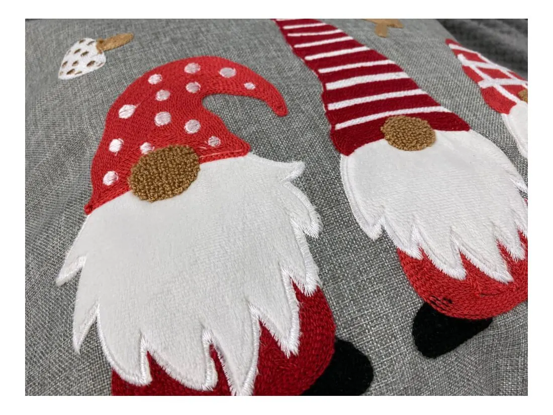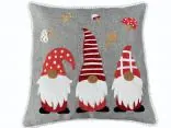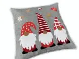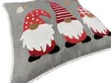 Dekoracyjna poszewka w rozmiarze 40x40 cm w kolorze szarym została wykonana na tkaninie 100 % poliester, charakteryzuje się świątecznym wzorem oraz modnym kolorem z precyzyjnie naszytym motywem trzech skrzatów w biało czerwonych czapeczkach, która magicznie podkreśli klimat Świąt Bożego Narodzenia. Brody skrzatów jest z miłej w dotyku białej tkaniny, skrzaty zostały wykonane haftem łańcuszkowym. Brzegi poszewki otacza biała taśma z kuleczkami.