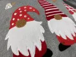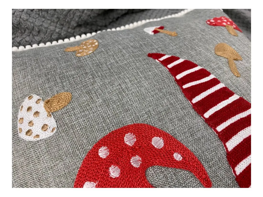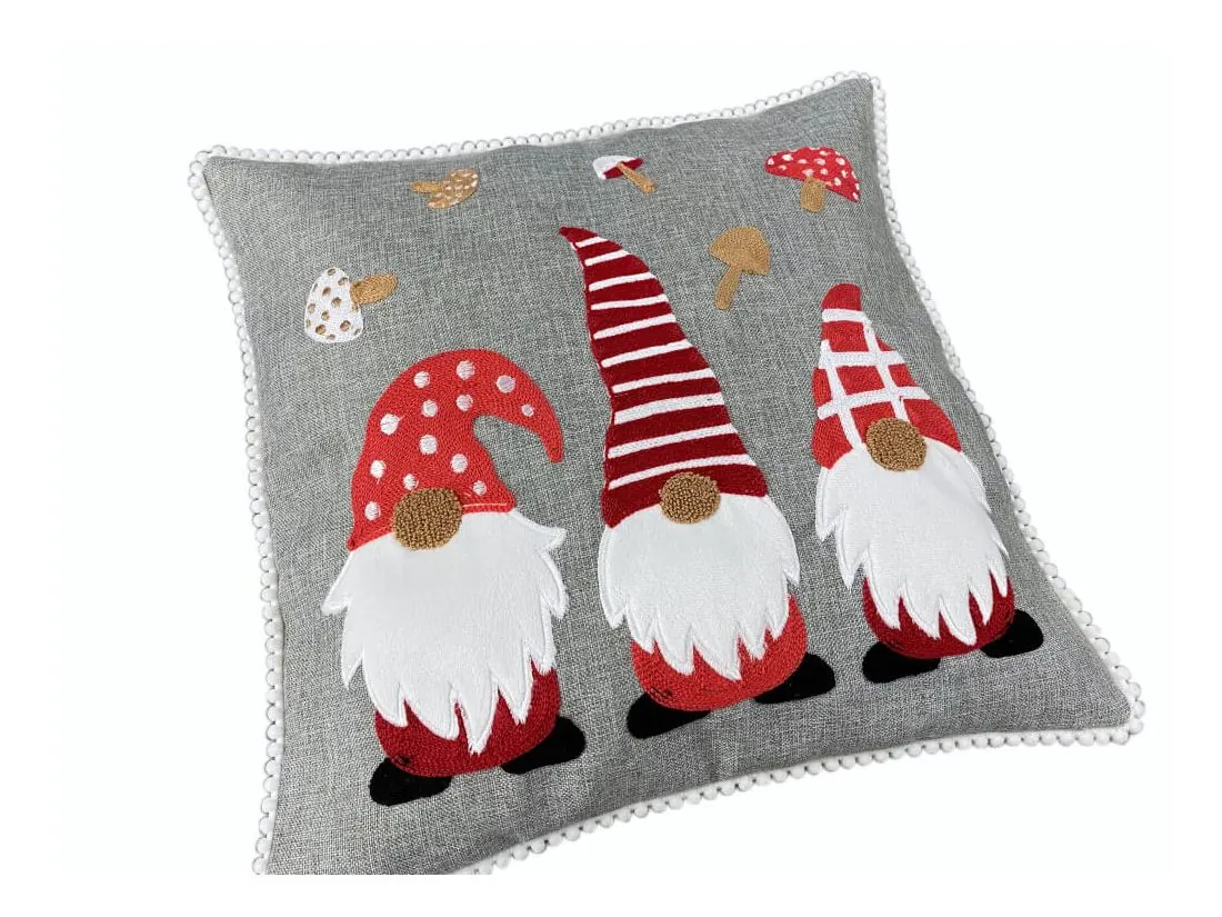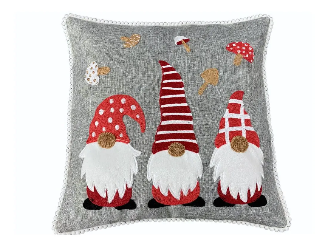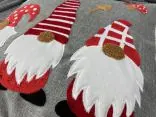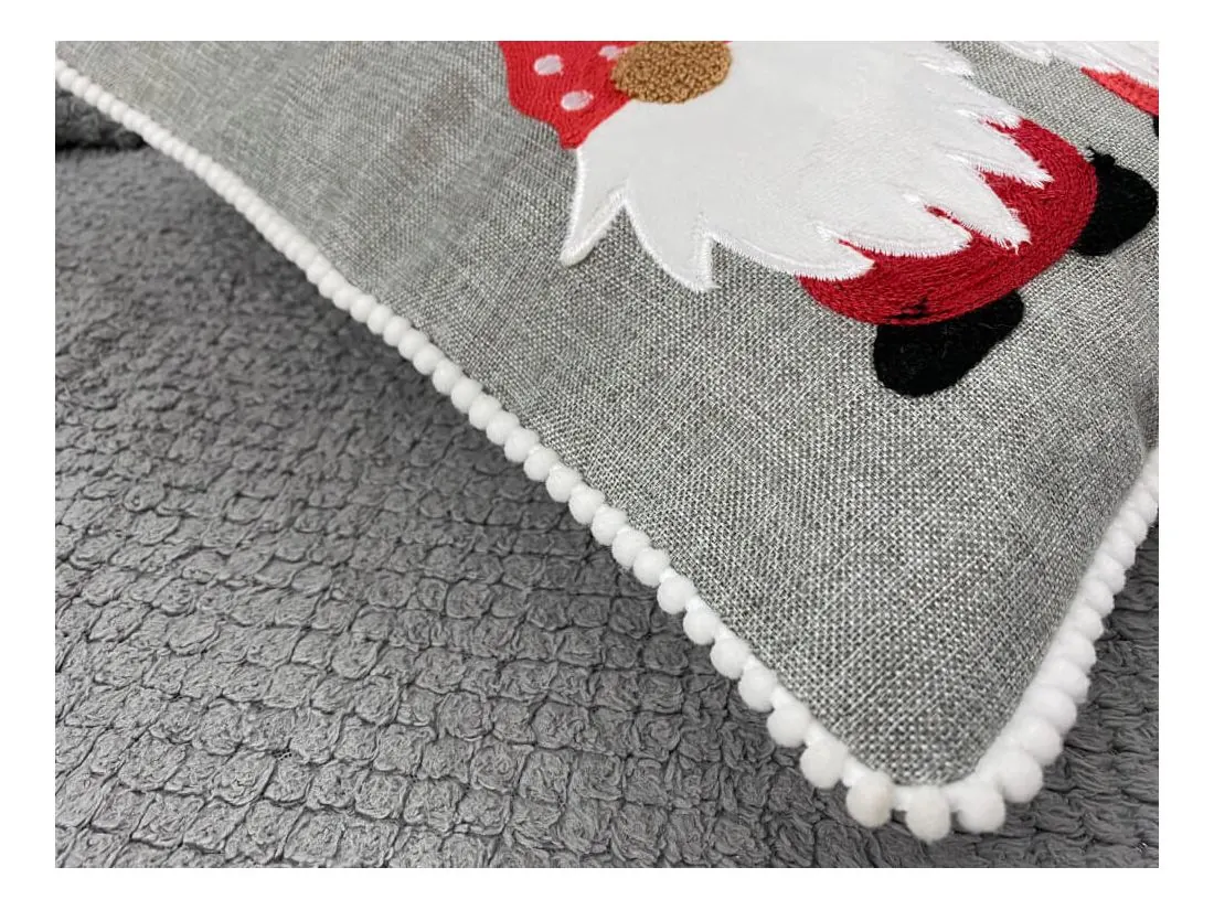 Dekoracyjna poszewka w rozmiarze 40x40 cm w kolorze szarym została wykonana na tkaninie 100 % poliester, charakteryzuje się świątecznym wzorem oraz modnym kolorem z precyzyjnie naszytym motywem trzech skrzatów w biało czerwonych czapeczkach, która magicznie podkreśli klimat Świąt Bożego Narodzenia. Brody skrzatów jest z miłej w dotyku białej tkaniny, skrzaty zostały wykonane haftem łańcuszkowym. Brzegi poszewki otacza biała taśma z kuleczkami.