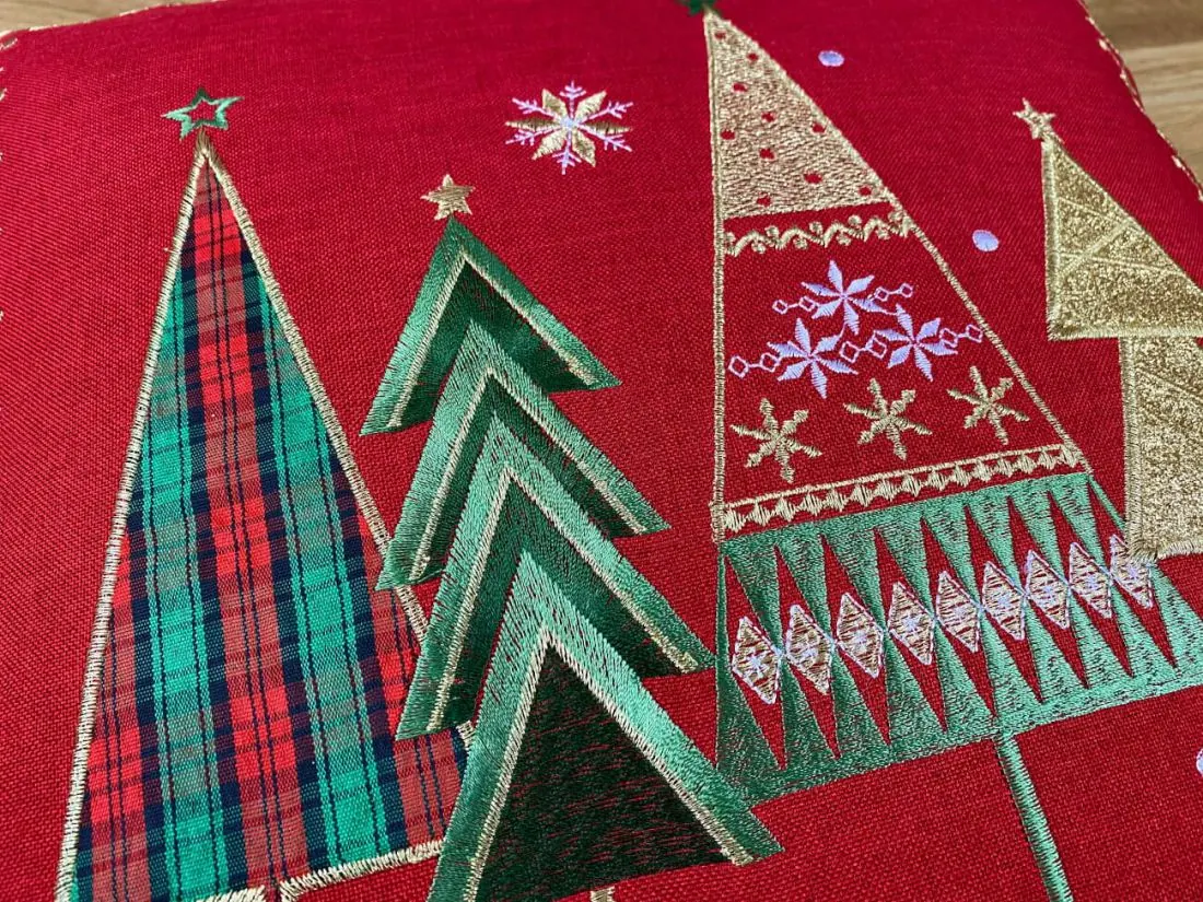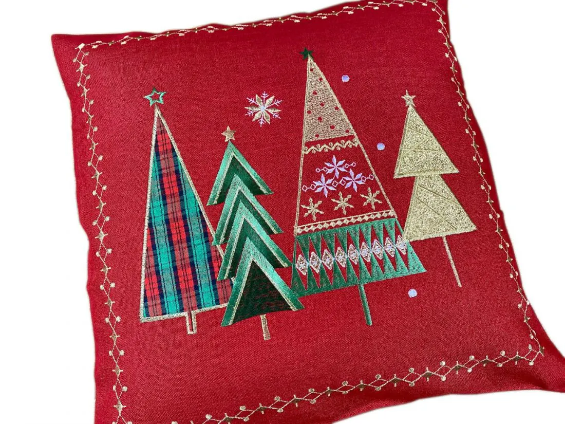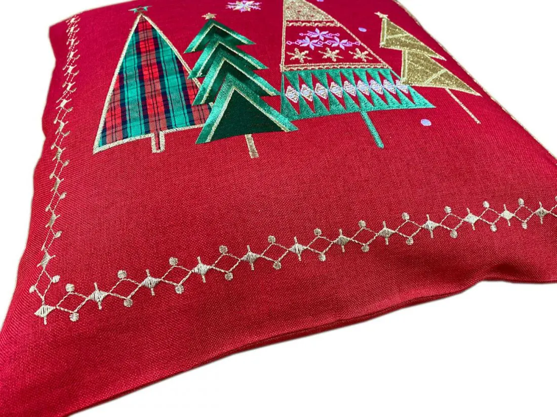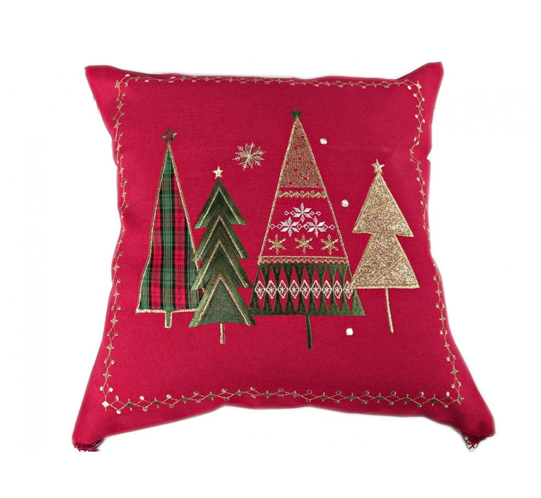 Dekoracyjna haftowana Poszewka w rozmiarze 40 x 40 cm w kolorze czerwono złotym z aplikacja haftowanej choinki. Ozdobna poszewka haftowana charakteryzuje się nowoczesnym, klimatycznym Bożenarodzeniowym wzorem oraz modnym kolorem. Poszewka jest w kolorze czerwono złotym z precyzyjnie wyhaftowanym motywem choinek które magicznie podkreślą klimat Świąt Bożego Narodzenia. To drobna wizytówka każdego domowego ogniska oraz dodatek do każdego wnętrza na specjalne uroczyste okazje jakim jest okres Świat Bożego Narodzenia.