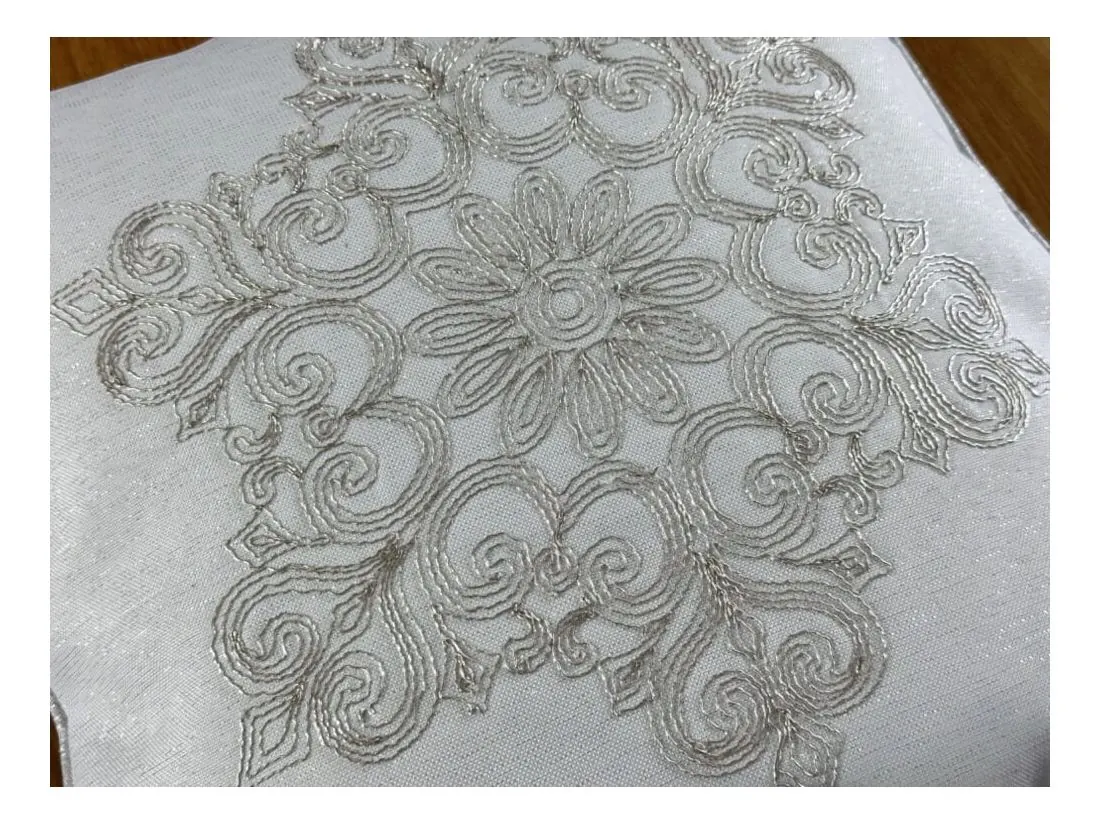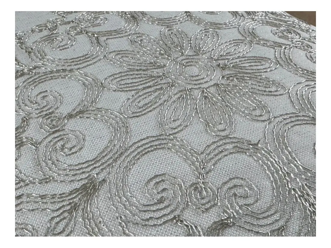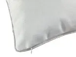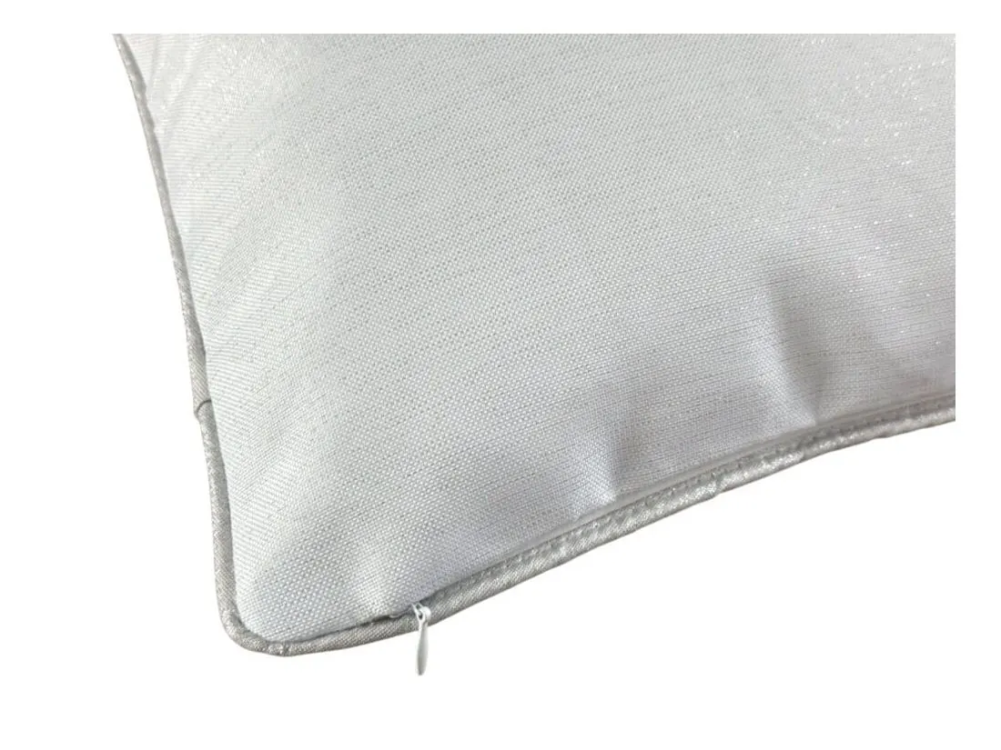 Największym atutem poszewki jest jednak tkanina lurex, w której srebrne nici zostały wplecione w biały materiał, tworząc efekt delikatnego, świetlistego połysku. Wzór haftowany na tkaninie w srebrzystym kolorze dodatkowo podkreśla świąteczny charakter poszewki. Dzięki lurexowi materiał odbija światło, przypominając iskrzący się w promieniach brokat, co wprowadza do wnętrza subtelne, migoczące refleksy, zwłaszcza przy ciepłym świetle lampek choinkowych. Poszewka wyróżnia się piękną srebrną lamówką, która otacza jej brzegi, subtelnie podkreślając kontur poduszki i dodając całości elegancji. Srebrna lamówka przyciąga wzrok i sprawia, że poszewka od razu wygląda bardziej szykownie i odświętnie.