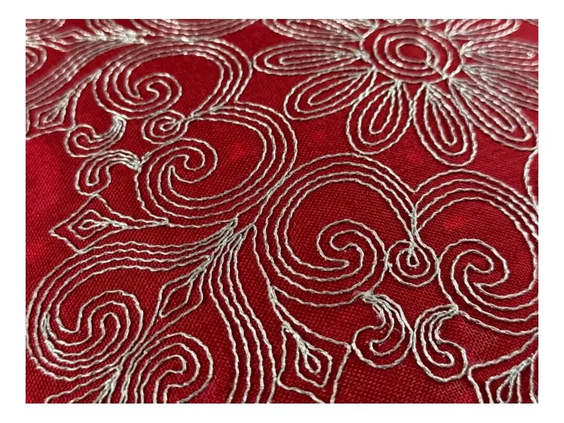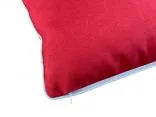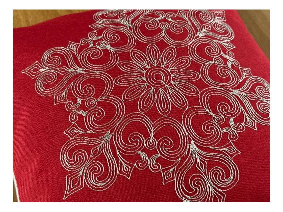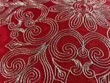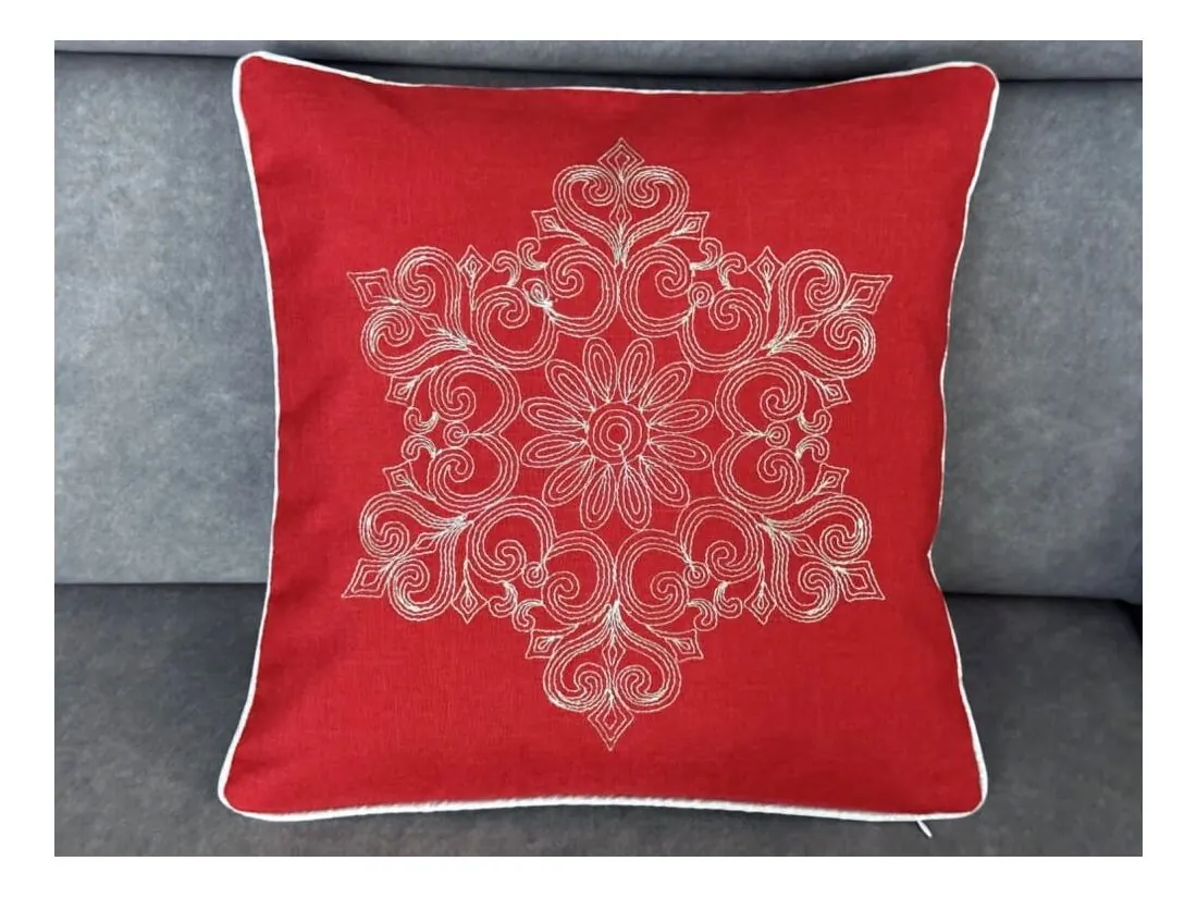 Najbardziej wyróżniającym elementem jest jednak zastosowanie tkaniny lurex, w której wpleciono srebrne nici, tworzące subtelny, połyskujący efekt. Dzięki temu materiał delikatnie odbija światło, przypominając iskrzący się brokat i wprowadzając do wnętrza ciepłe, migoczące refleksy. Z tkaniny lurex wyhaftowany został piękny wzór w srebrzystym kolorze, który doskonale kontrastuje z głęboką czerwienią poszewki, nadając jej wyrafinowany, świąteczny wygląd. Poszewkę zdobi srebrna lamówka, która elegancko okala brzegi i dodaje całości wyjątkowego charakteru. To detale, które przyciągają wzrok i podkreślają staranność wykonania, nadając poduszce luksusowy wygląd.
