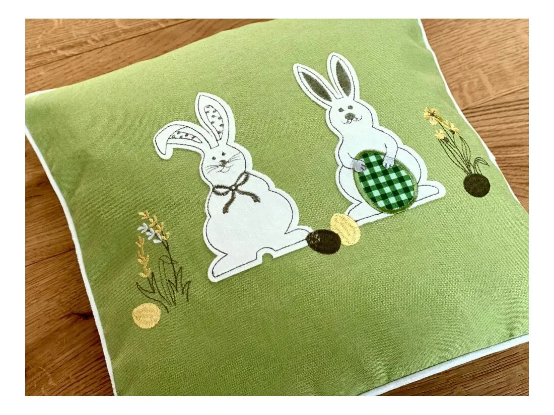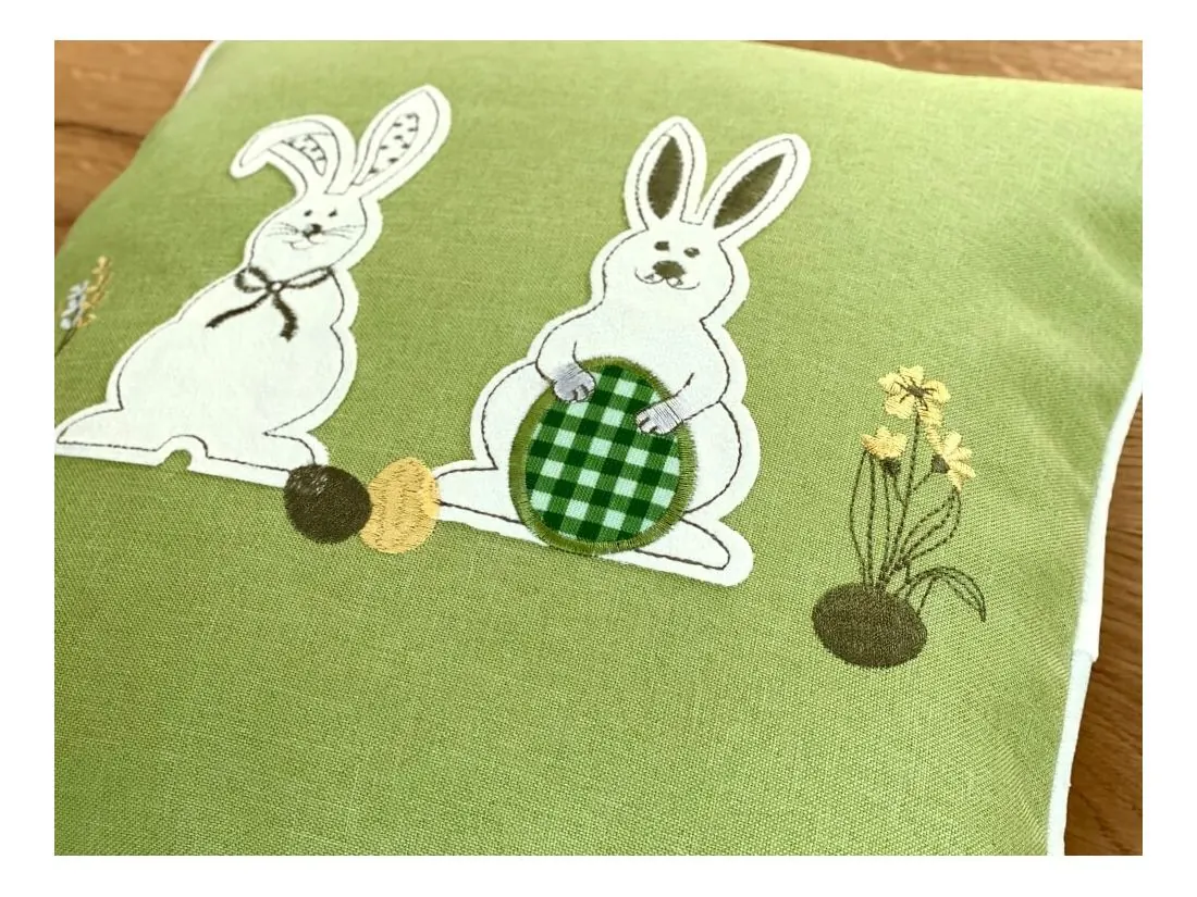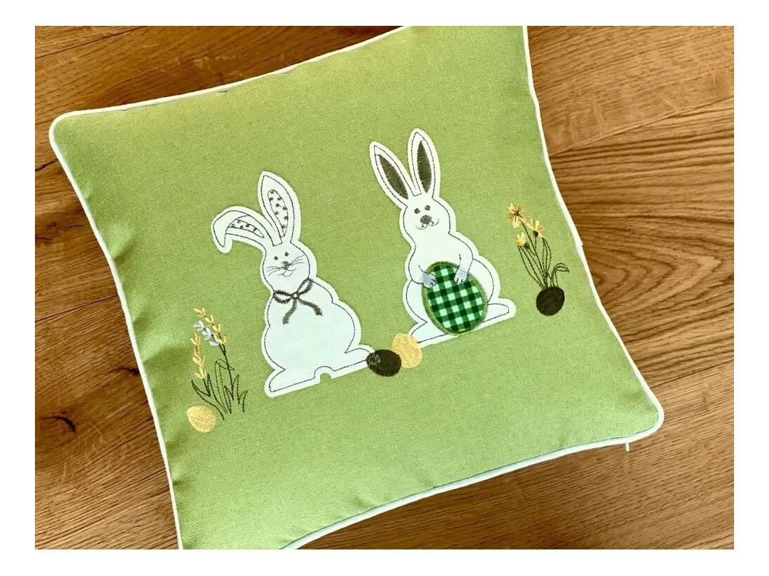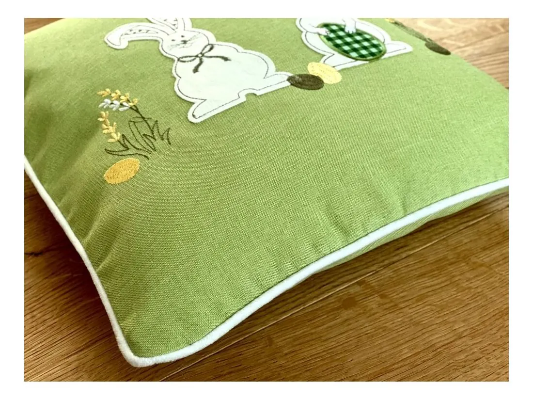 Dekoracyjna poszewka świąteczna w rozmiarze 40x40 cm w kolorze zielonym z aplikacją dwóch zajączków, została wykonana na tkaninie 100% poliester . Charakteryzuje się nowoczesnym designem, ciekawym wzorem oraz modnym kolorem.