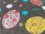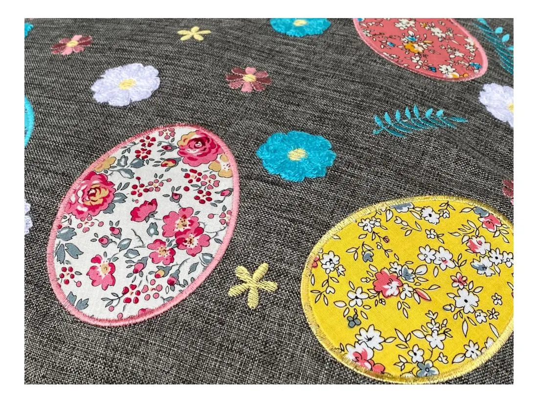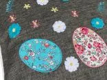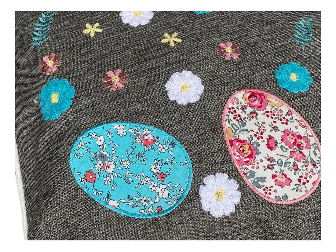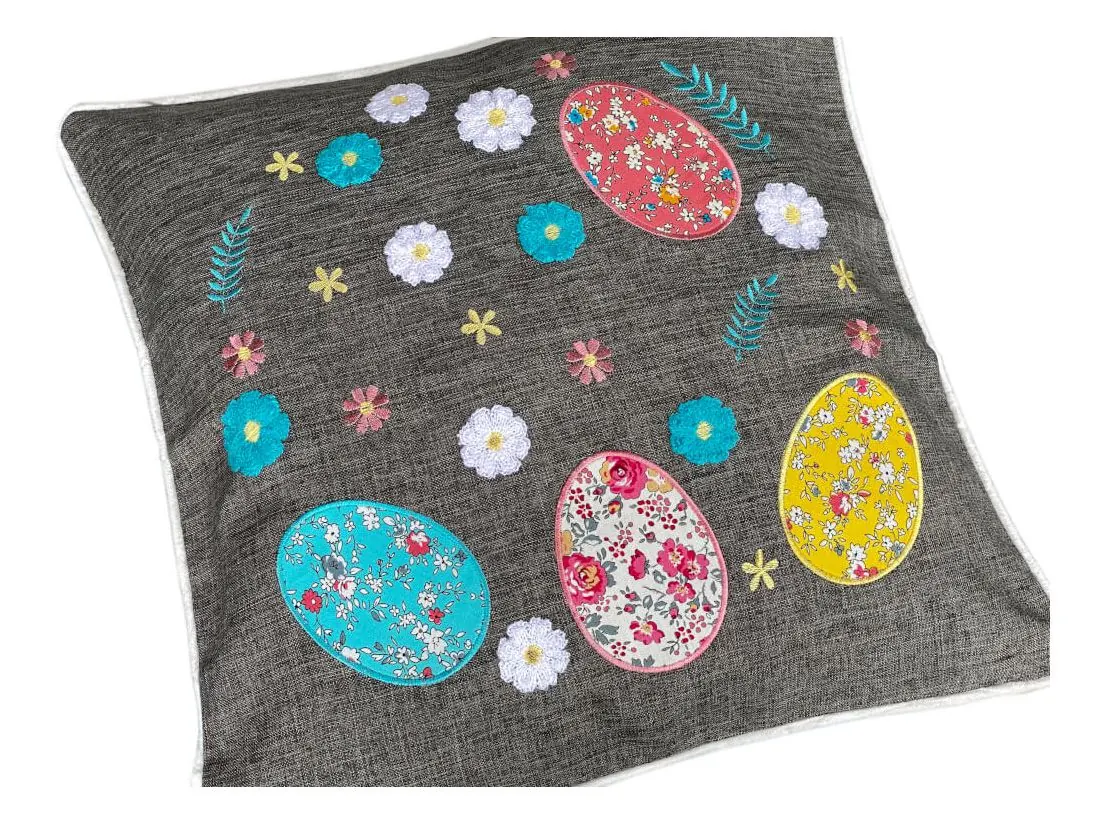 Dekoracyjna poszewka świąteczna w rozmiarze 40 x 40 cm w kolorze grafitowym z aplikacja kolorowych pisanek, została wykonana na tkaninie 100% poliester. Charakteryzuje się nowoczesnym designem, ciekawym wzorem oraz modnym kolorem. Pisanki zostały naszytę na tkaninie w otoczeniu haftowanych kwiatuszków. Poszewka została wykończona mięciutką lamówką.