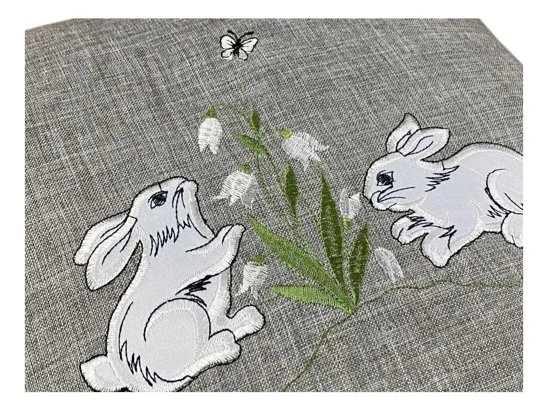 Dekoracyjna poszewka świąteczna w rozmiarze 40 x 40 cm w kolorze popielaty z aplikacją dwóch zajączków, została wykonana na tkaninie 100% poliester . Charakteryzuje się nowoczesnym designem, ciekawym wzorem oraz modnym kolorem.