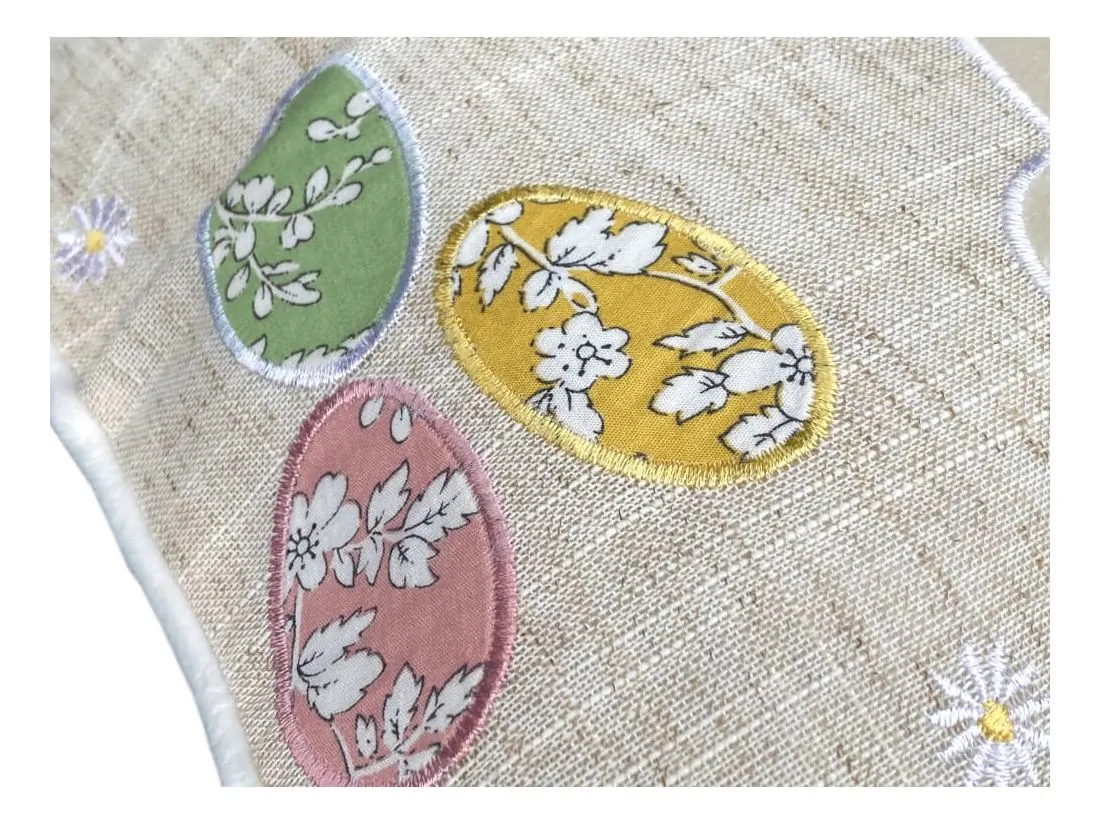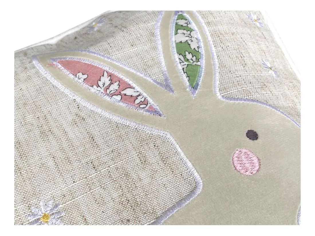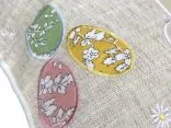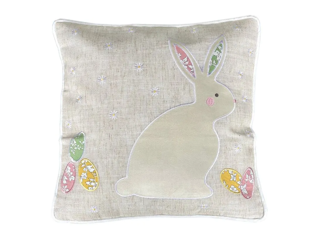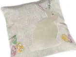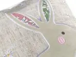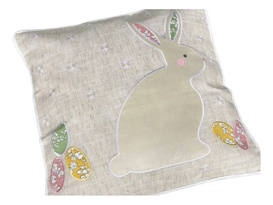 Dekoracyjna poszewka świąteczna w rozmiarze 40 x 40 cm w kolorze lnianym z aplikacja zajączka wielkanocnego została wykonana na tkaninie o składzie 20 % len, 80 % poliester. Charakteryzuje się nowoczesnym designem, ciekawym wzorem oraz modnym kolorem. Zajączek z tkaniny imitującej tkaninę welurową został naszyty na poszewkę w otoczeniu kolorowych pisanek oraz drobnych kwiatuszków. Poszewka została wykończona mięciutką lamówką.