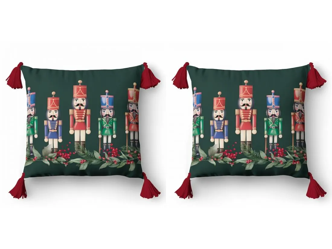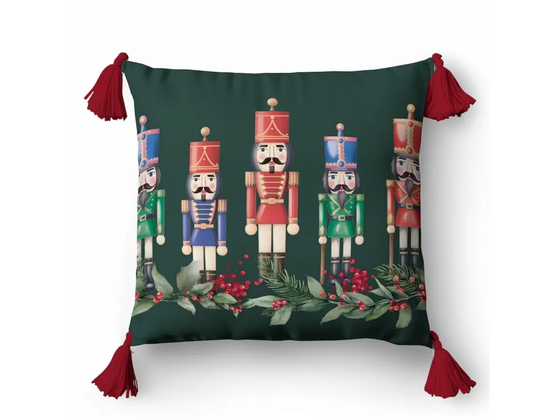 Wzór przedstawia klasycznego dziadka do orzechów w stylu vintage, umieszczonego na głębokim, zielonym tle, które podkreśla świąteczny charakter dekoracji. Centralna postać ozdobiona jest bogatymi detalami – czerwono-złotym mundurem, wysoką czapką i wyrazistymi rysami twarzy, co przywołuje tradycyjny klimat Bożego Narodzenia. Całość dopełniają czerwone pompony umieszczone na rogach poszewki, dodające jej uroku i przytulności. Ten dekoracyjny akcent idealnie wpisuje się w świąteczny wystrój wnętrza, wprowadzając ciepło, radość i nutę nostalgii.