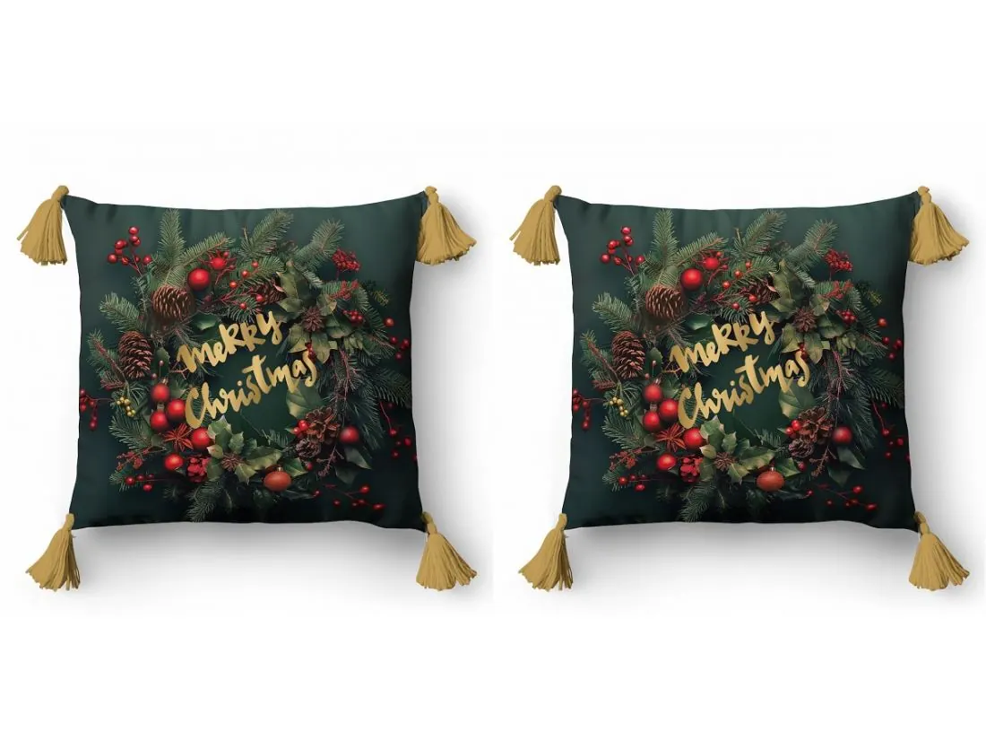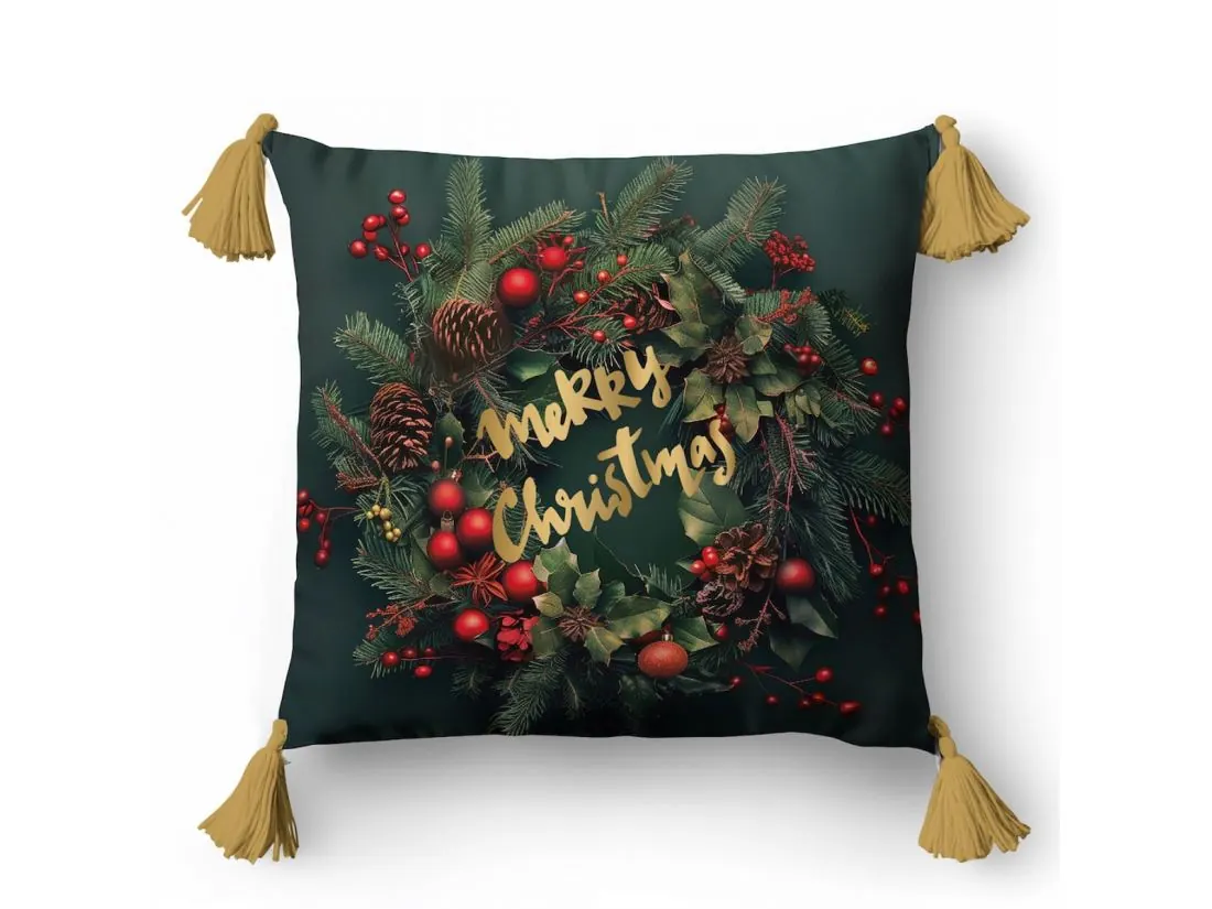 Wzór przedstawia napis „Merry Christmas” otoczony świątecznym stroikiem, który wprowadzi do wnętrza ciepłą, radosną atmosferę Bożego Narodzenia. Dodatkowo poszewka została wykończona dekoracyjnymi pomponami w kolorze miedzianym na rogach, co nadaje jej jeszcze bardziej przytulny i świąteczny charakter.