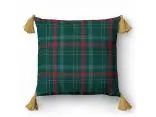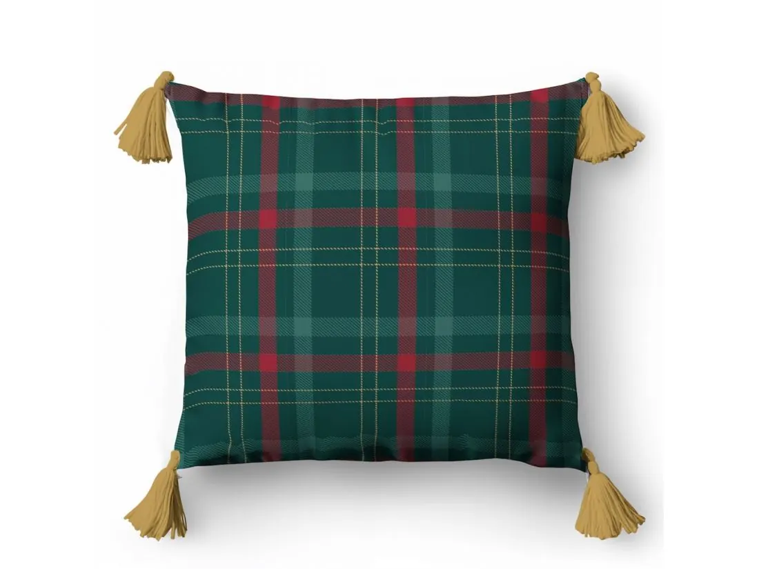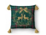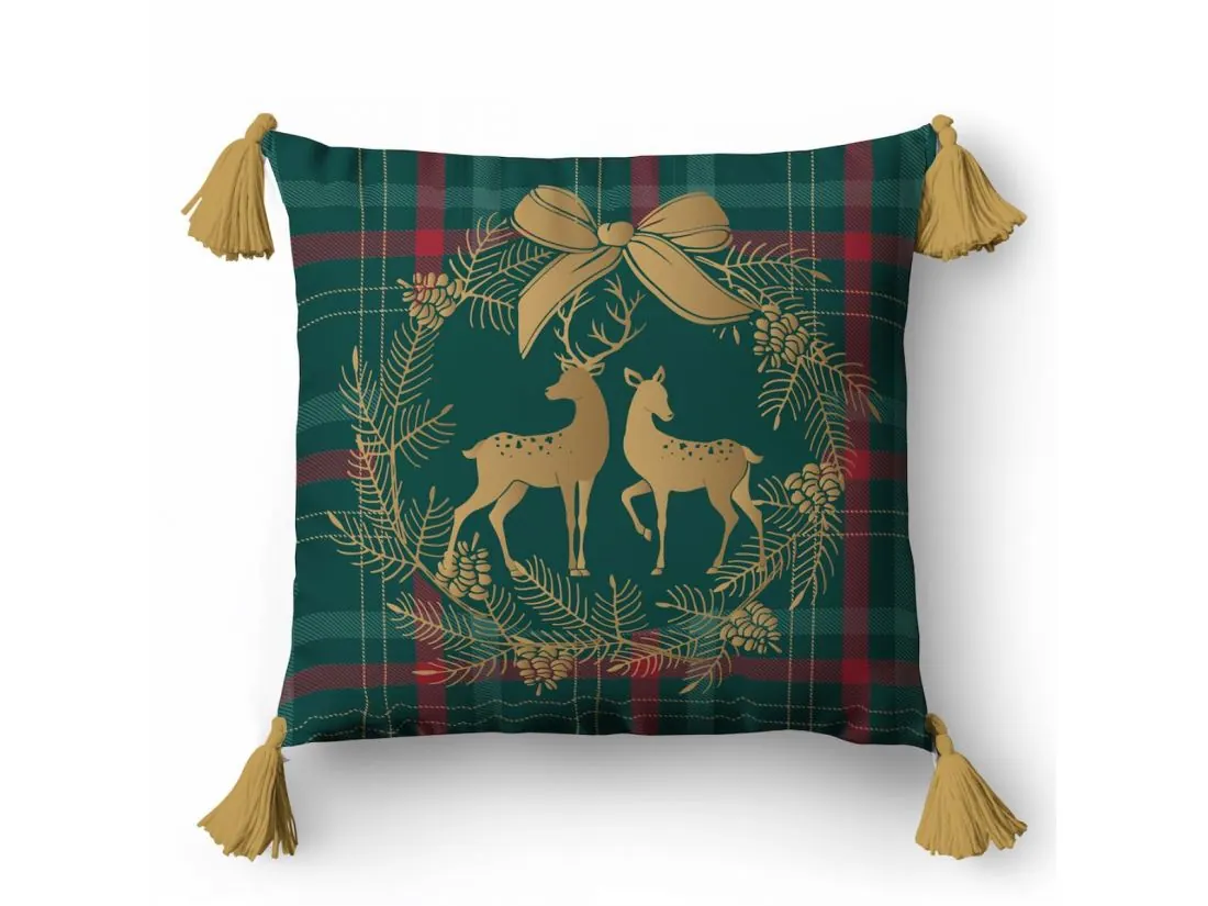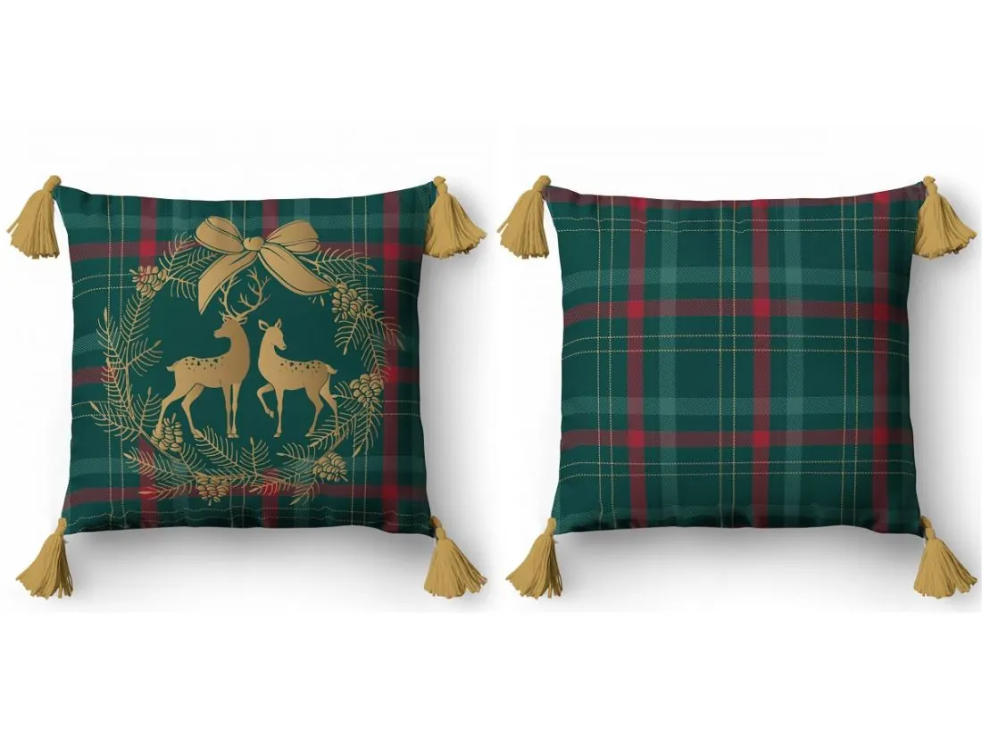 Świąteczny wzór dwustronny, który łączy elegancję z tradycją. Pierwsza strona przedstawia jelenia i sarnę w otoczeniu stroika bożonarodzeniowego. Druga strona to klasyczna kratka w barwach zieleni i czerwieni, przełamana przytulnym charakterem złoto-miedzianych pomponów i frędzli. To idealna propozycja dla osób, które cenią świąteczną atmosferę w pięknym, dopracowanym stylu, które stanowią delikatny, ale efektowny akcent, podkreślając świąteczny charakter dekoracji i nadając jej wyjątkowej lekkości i oryginalności.