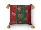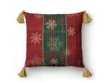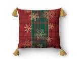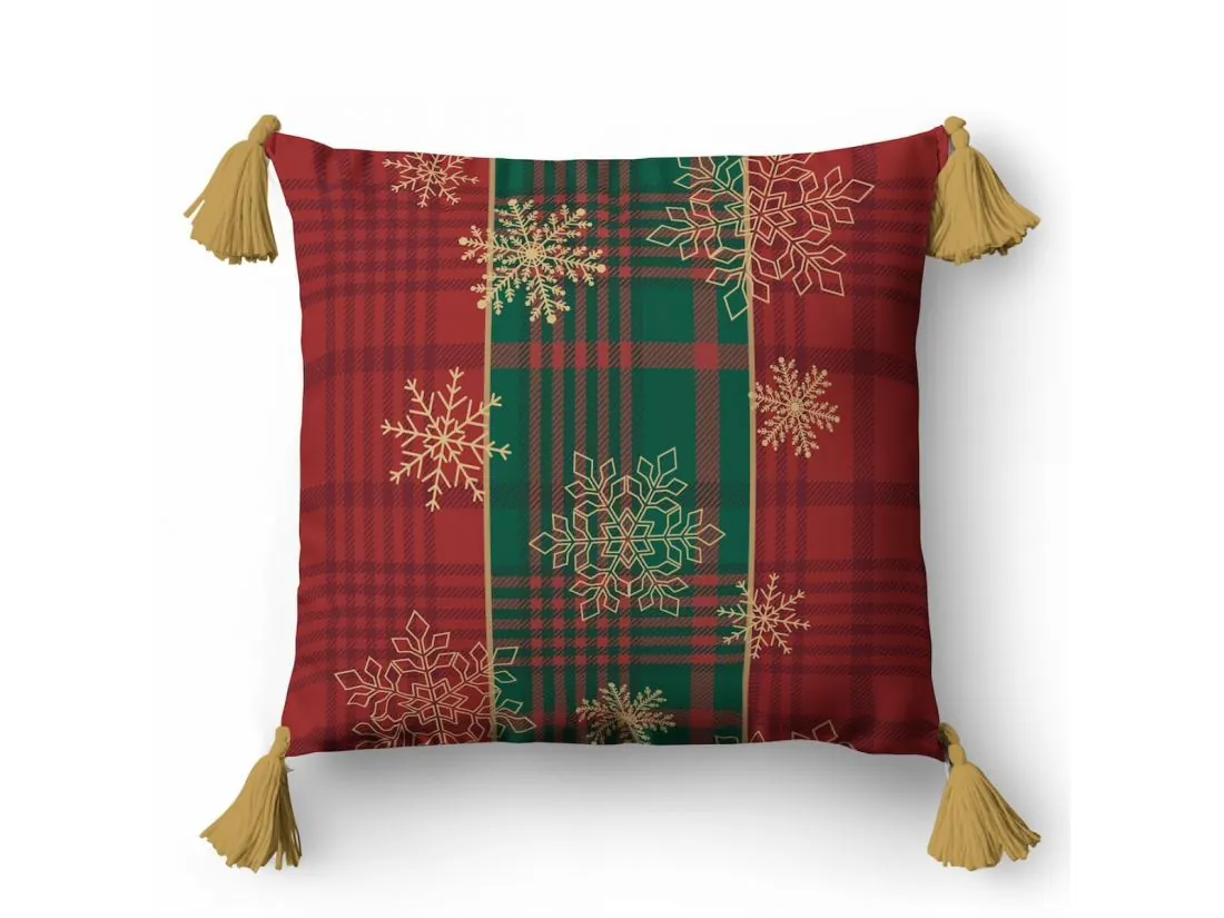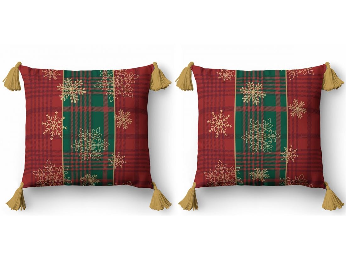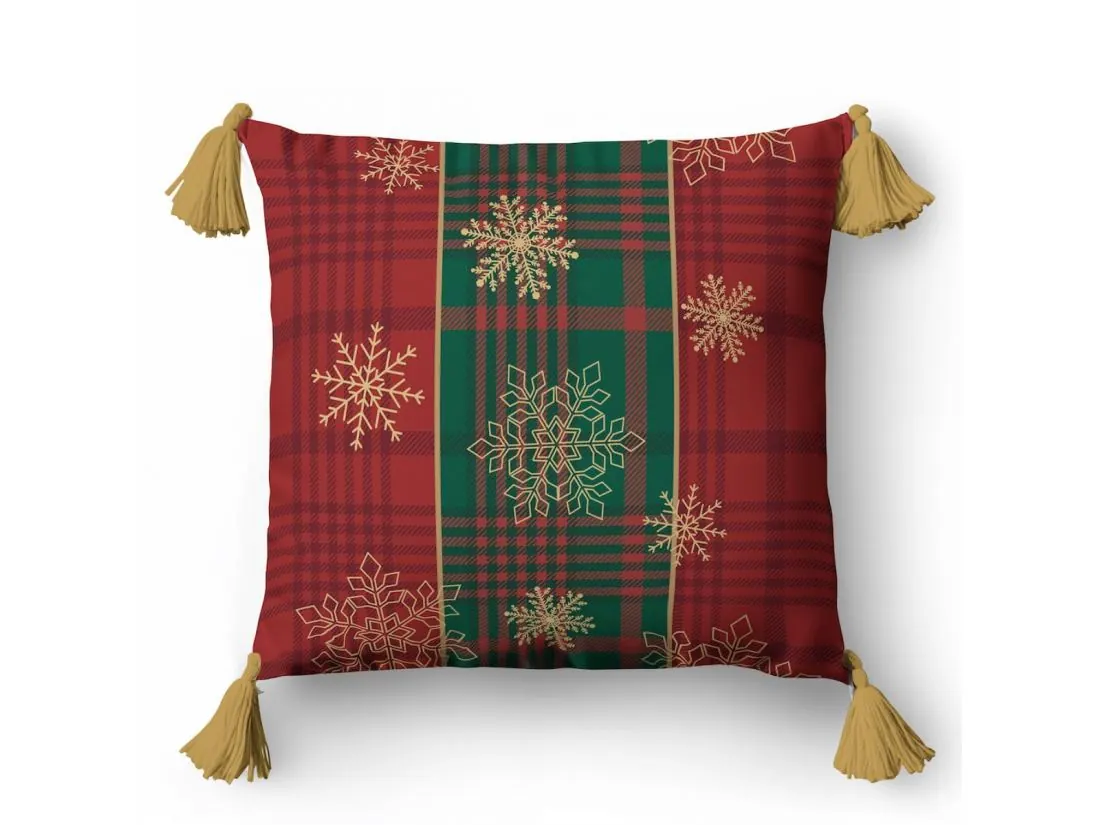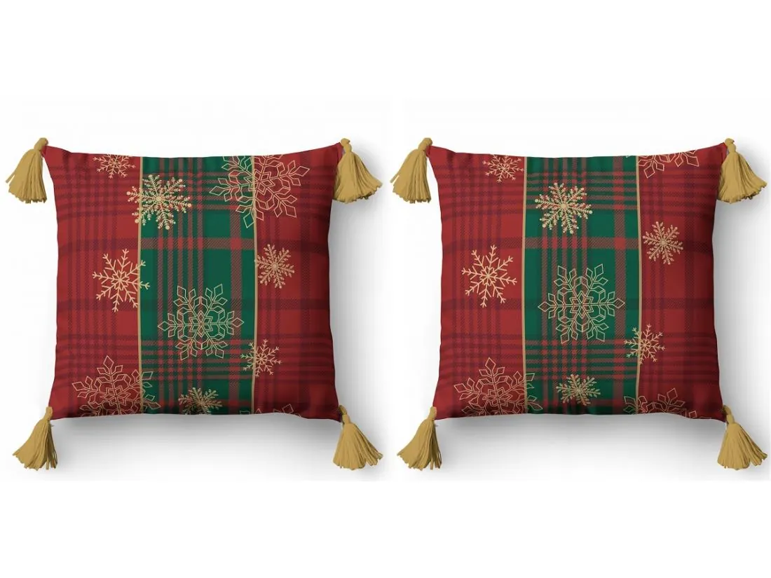 Jednostronny wzór świąteczny o klasycznym i eleganckim charakterze. Tło tworzy kratka w bordowych i zielonych odcieniach, przywodząca na myśl tradycyjne świąteczne motywy. Na tym tle delikatnie rozmieszczone są złote śnieżynki, które dodają lekkości i subtelnego blasku. Całość uzupełniają złote pompony, podkreślając świąteczny klimat i nadając wzorowi wyjątkowego, eleganckiego wykończenia.