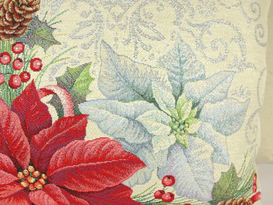 Dekoracyjna poszewka gobelinowa w rozmiarze 45x45 cm, została wykonana z tkaniny hiszpańskiej 25% bawełna, 70 % poliester, 5% poliakryl. Poszewka dwustronna - tkanina tkana żakardowa ze wzorem z jednej strony, druga strona jednobarwna, poszewka zapinana na zamek. Dodatkowym atutem poszewki jest srebrna nitka wpleciona w tkaninę gobelinową.