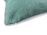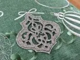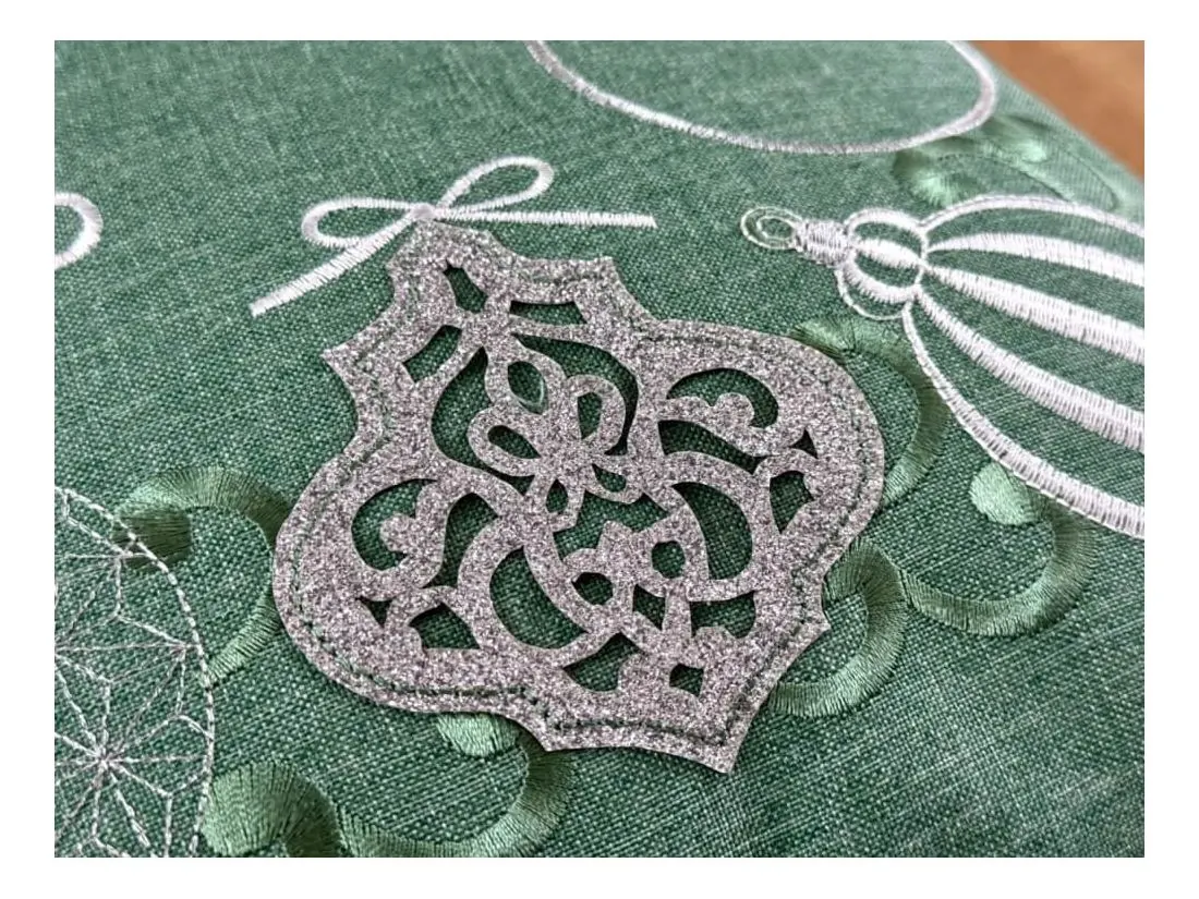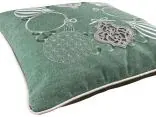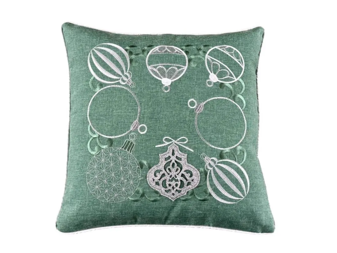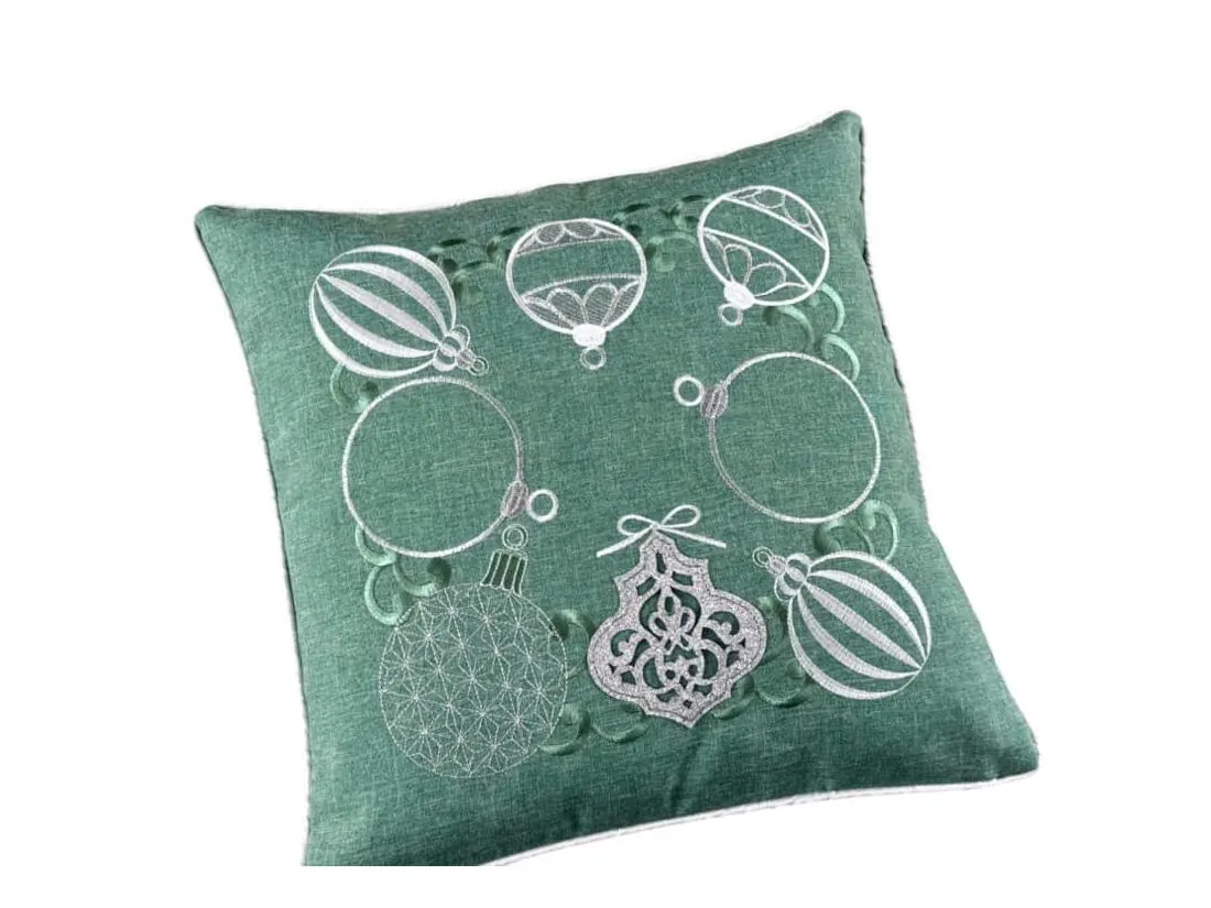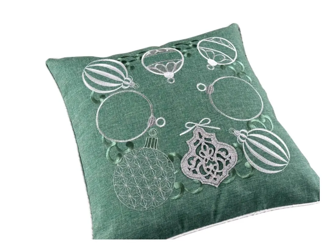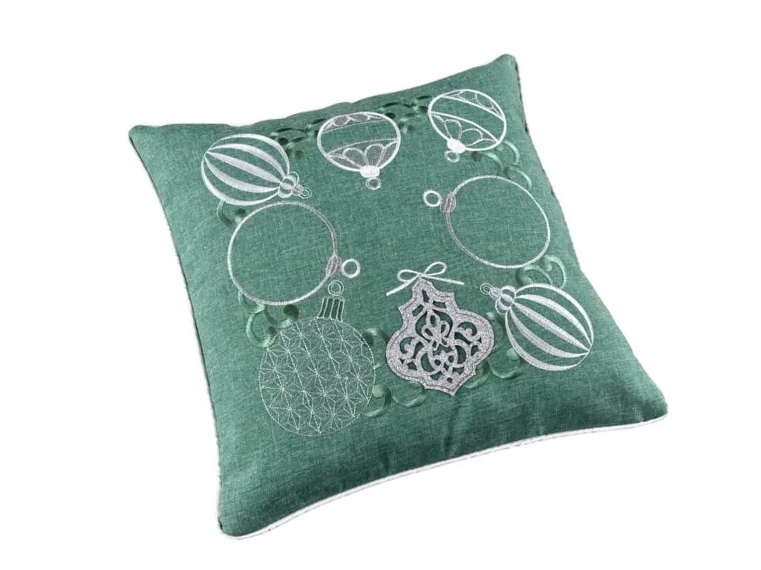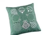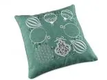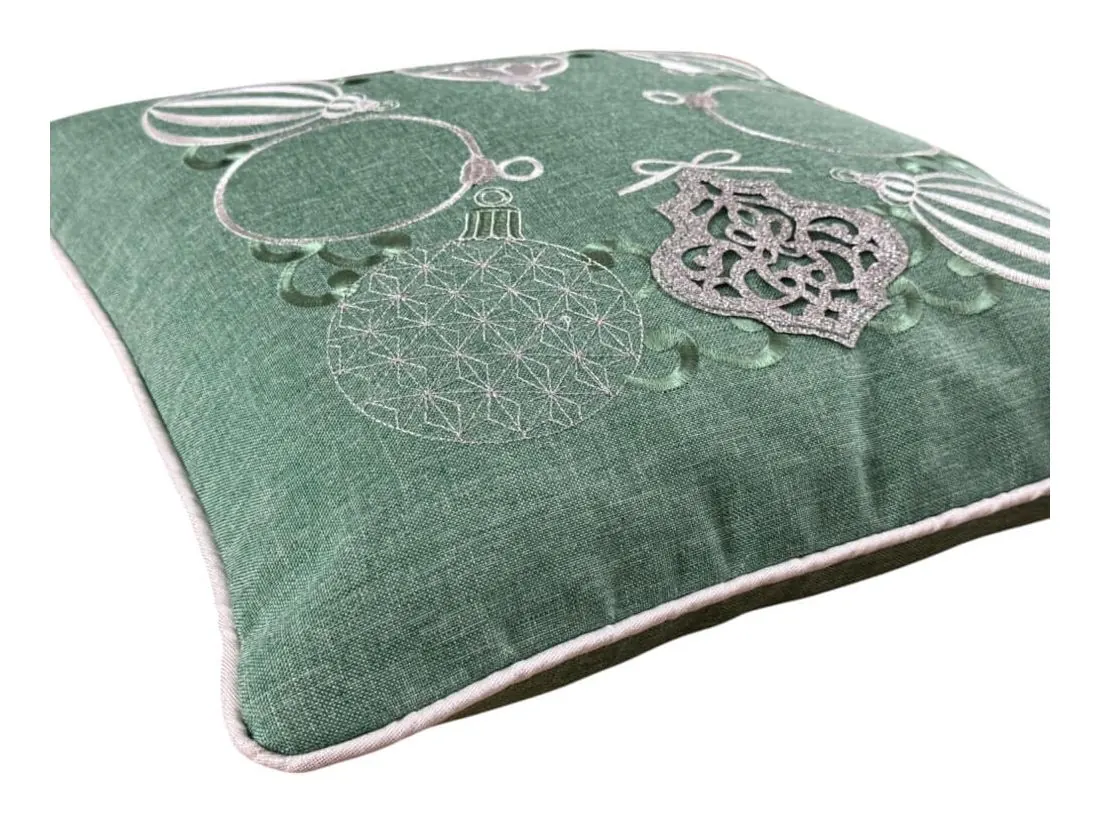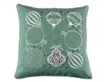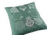 Poszewka ozdobiona jest pięknymi haftowanymi bombkami w odcieniach szarości, a niektóre z nich subtelnie połyskują dzięki srebrnej nici, co nadaje jej efektowny, ale delikatny blask. Każdy detal haftu został starannie wykonany, tworząc elegancką kompozycję na miętowym tle, która przyciąga wzrok i wprowadza radosną, świąteczną atmosferę.