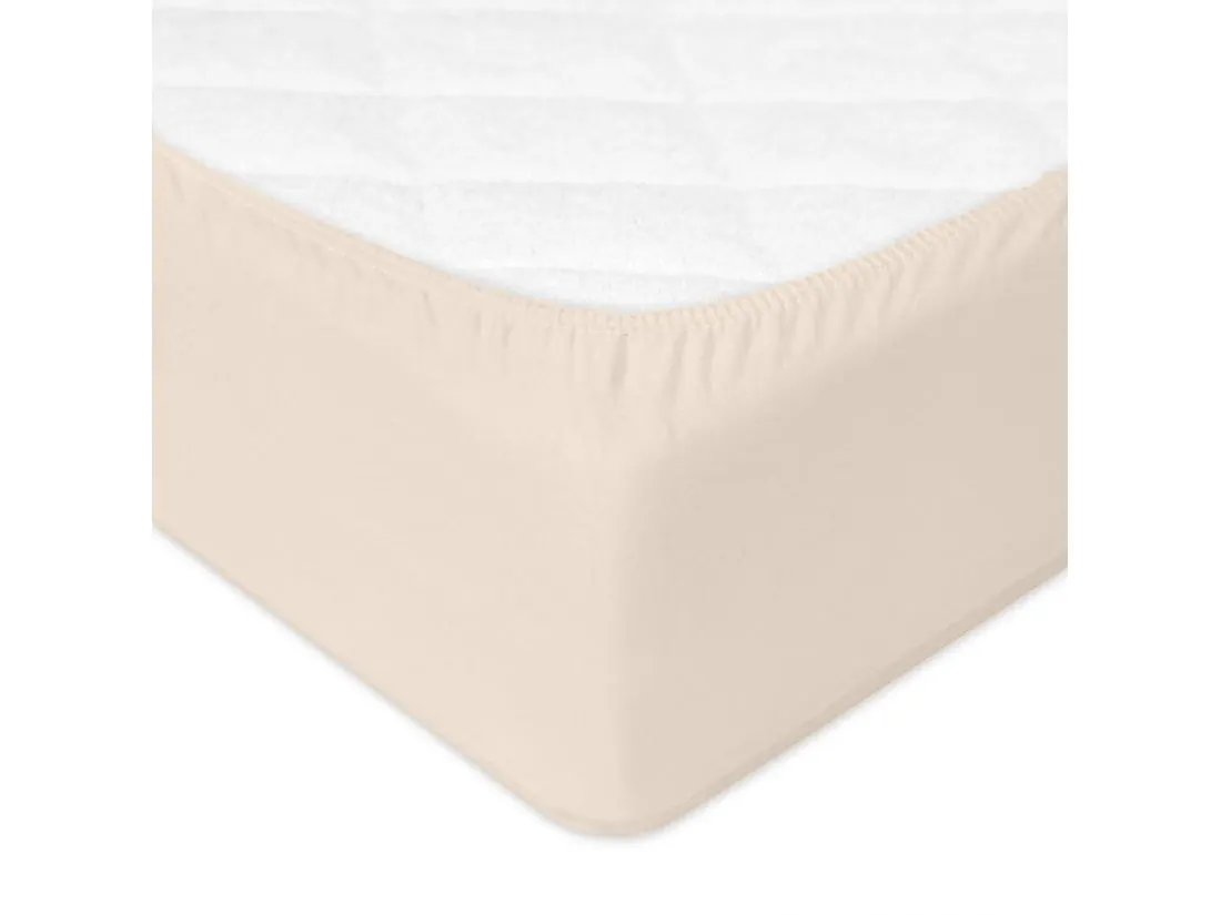 Prześcieradło w kolorze jasno beżowym, wykonane z bawełnianej dzianiny jersey, to doskonały wybór dla osób ceniących sobie komfort i wysoką jakość. Wykonane w 100% z naturalnej bawełny, zapewnia miękkość i oddychalność, co gwarantuje przyjemne użytkowanie. Elastyczna gumka wokół prześcieradła sprawia, że idealnie dopasowuje się do materaca, eliminując problem przesuwania się materiału podczas snu.