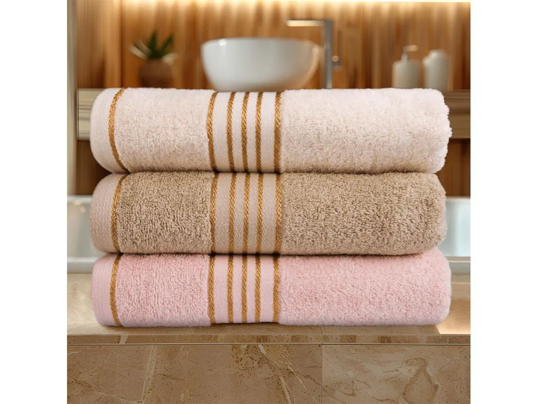 Elegancki kąpielowy ręcznik posiada optymalną gramaturę 500 g/m². Dzięki temu jest bardzo chłonny i jednocześnie szybko schnie, co jest kluczowe w przypadku akcesoriów intensywnie używanych. Eleganckie wykończenie złotą bordiurą podkreśla jego ekskluzywny charakter, sprawiając, że ten ręcznik to prawdziwa ozdoba.