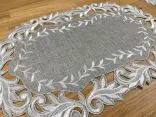 Dekoracyjna haftowana serwetka w rozmiarze 30x45 cm w kolorze popielatym bogato haftowana i wycinana na brzegach, została wykonana na tkaninie - 100 % poliestrowej, charakteryzuje się nowoczesnym desingiem, prostym wzorem oraz modnym kolorem.