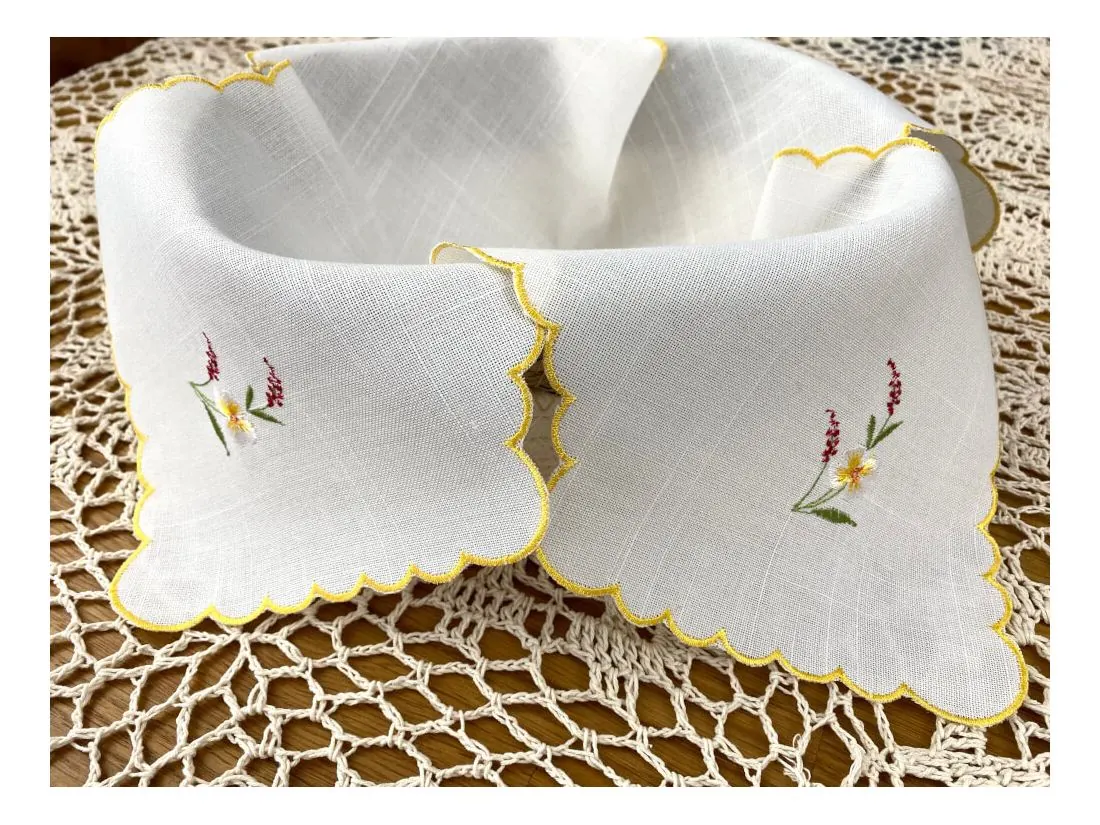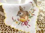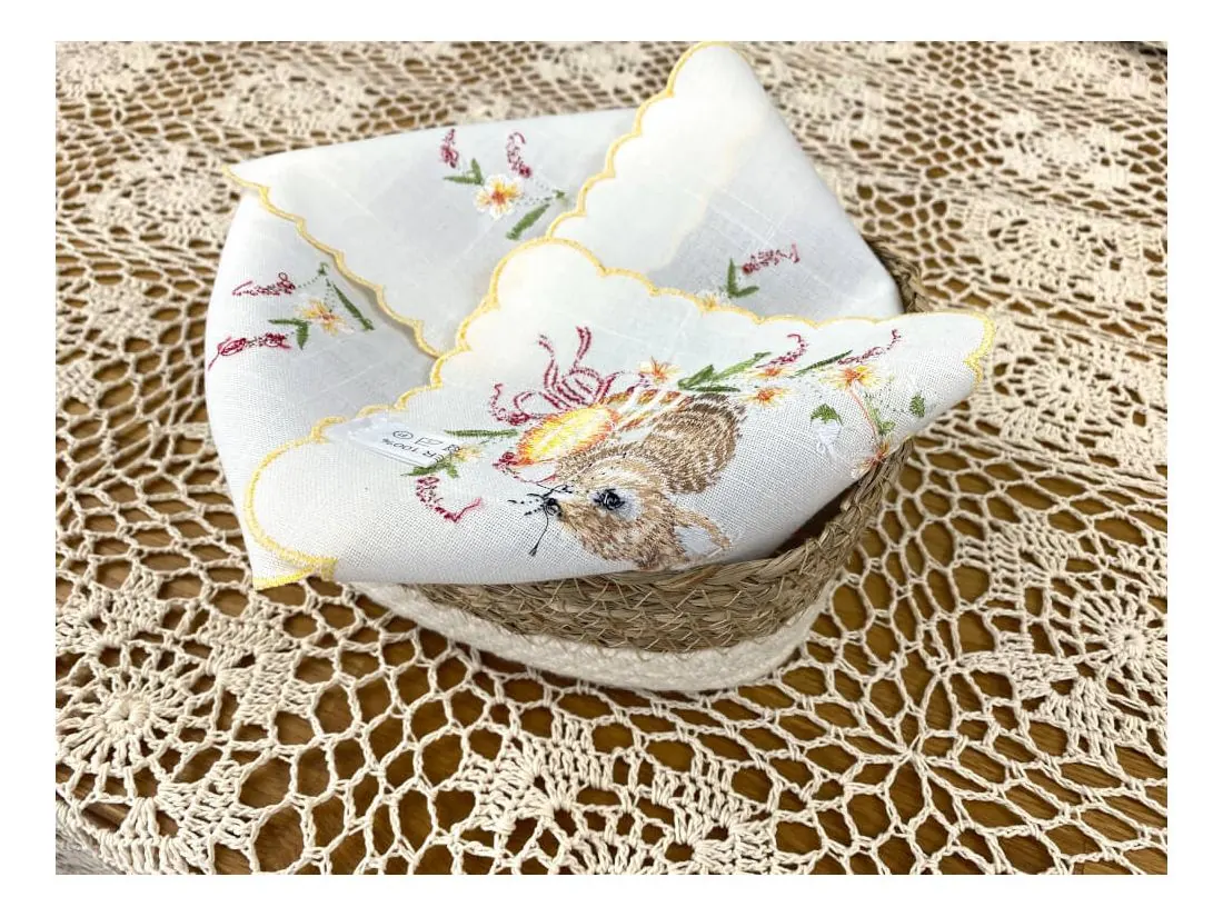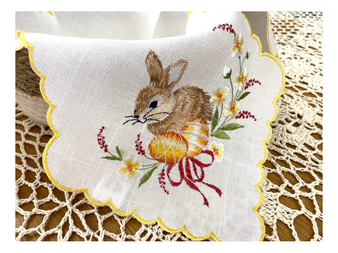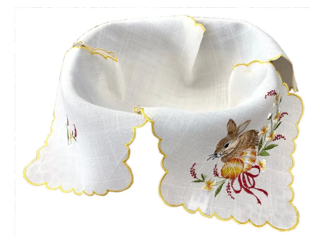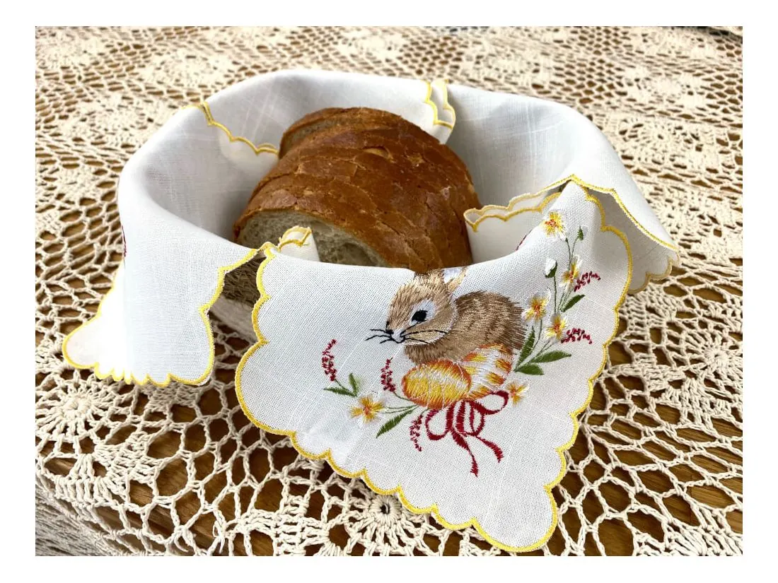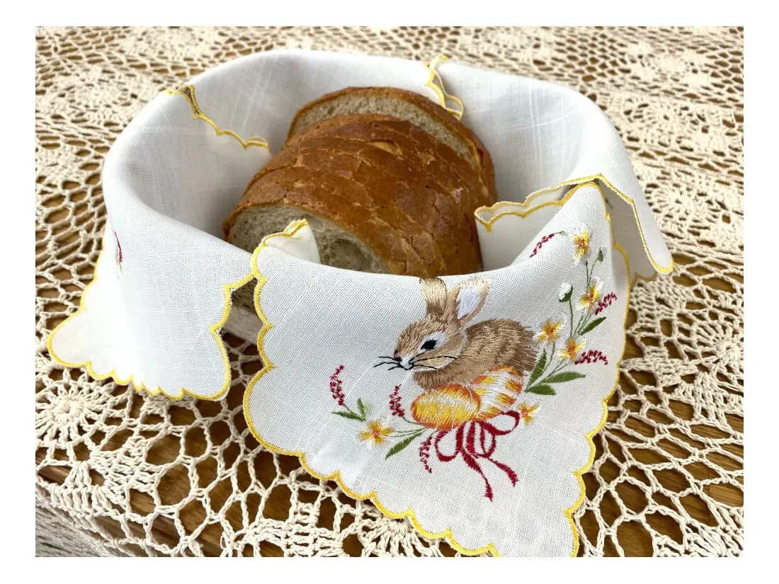 Specjalnie zaprojektowany kształt serwetki umożliwia jej wygodne ułożenie w koszyku, dzięki czemu pieczywo prezentuje się wyjątkowo i jest jednocześnie zabezpieczone. Haftowane zdobienia dodają serwetce subtelnej elegancji, idealnie wpisując się w wielkanocny klimat.