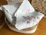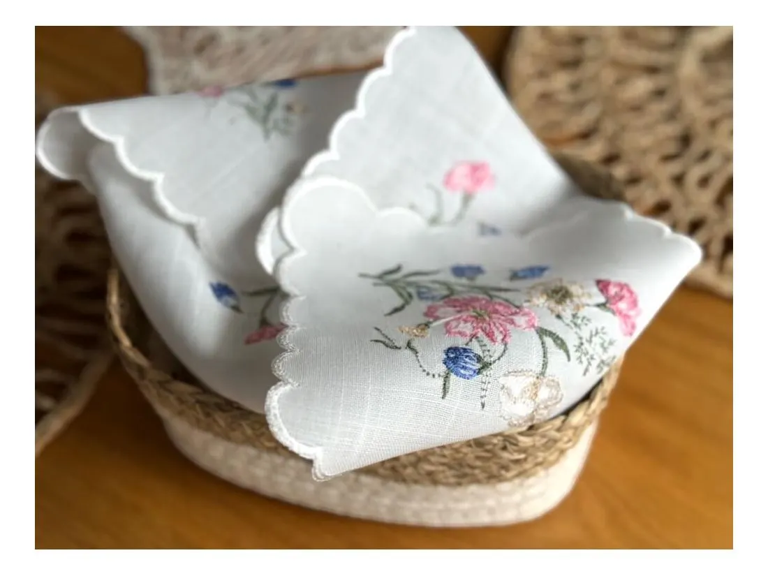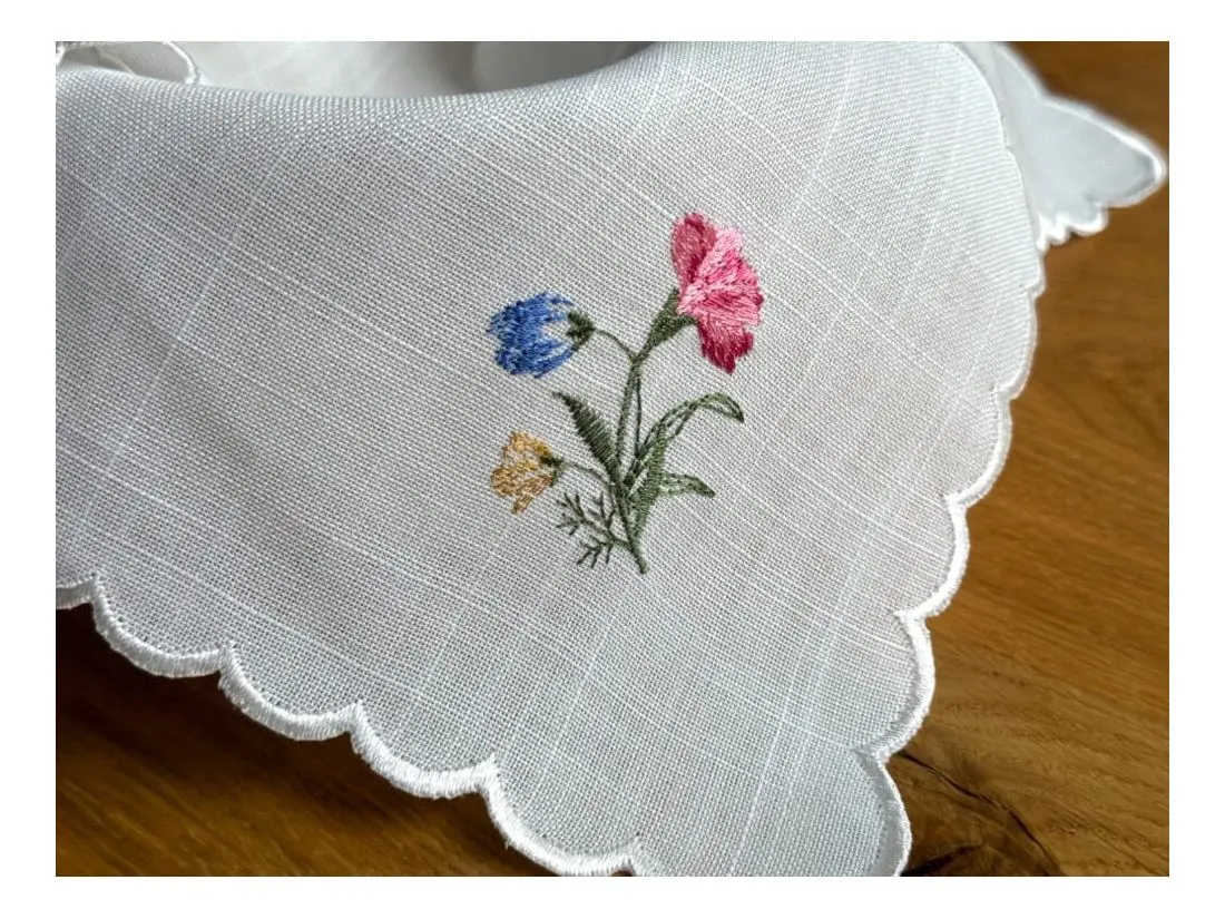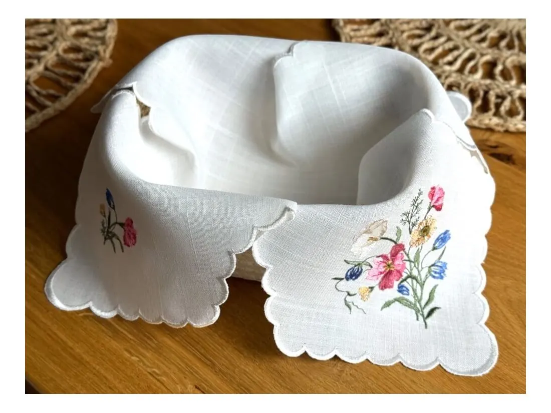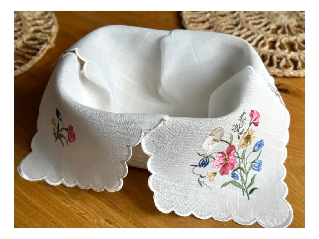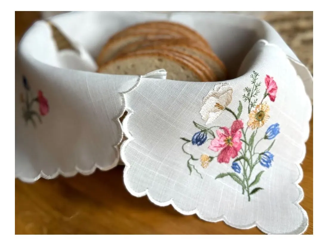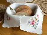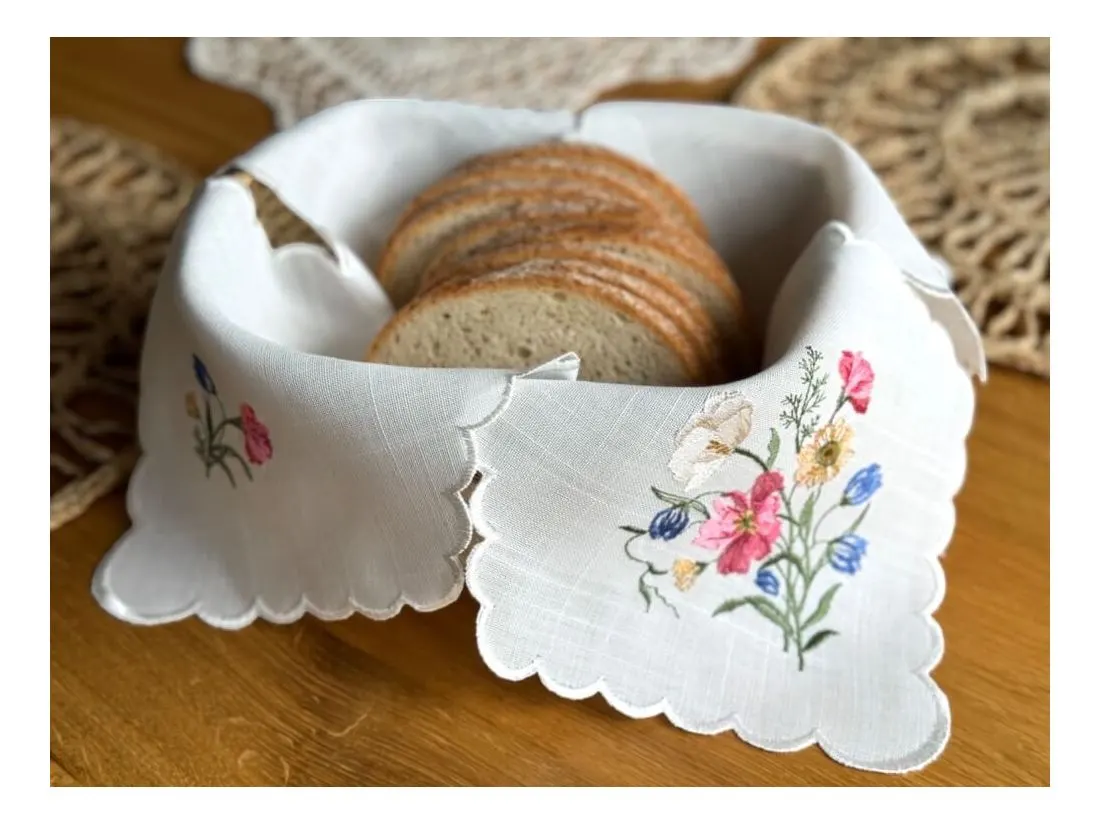 Specjalnie zaprojektowany kształt serwetki umożliwia jej wygodne ułożenie w koszyku, dzięki czemu pieczywo prezentuje się wyjątkowo i jest jednocześnie zabezpieczone. Haftowane zdobienia dodają serwetce subtelnej elegancji, idealnie wpisując się w wielkanocny klimat.