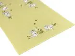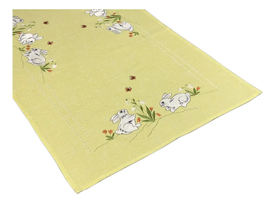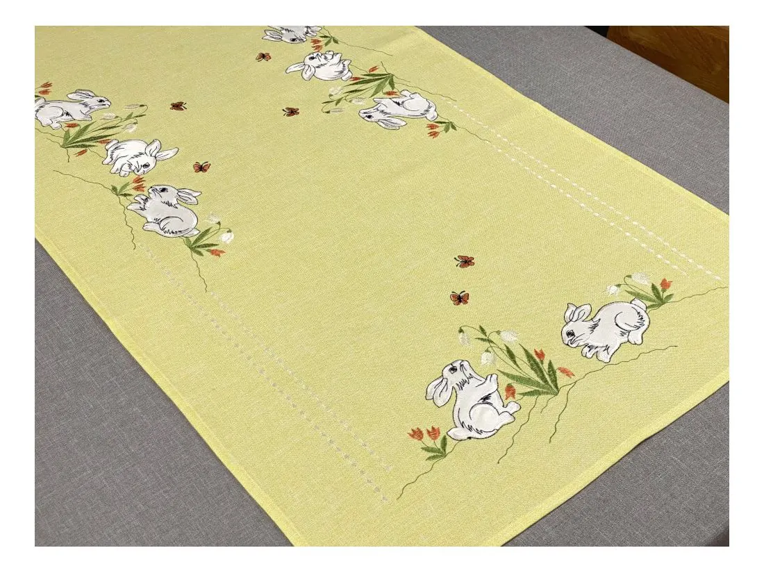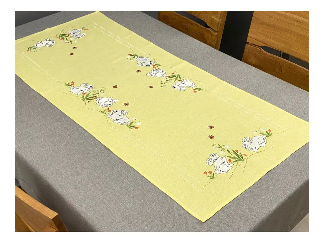 Nakładka świąteczna w rozmiarze 55x120 cm w kolorze żółtym z aplikacja wesołych dwóch zajączków, została wykonana z tkaniny 100 % poliestrowej, charakteryzuje się nowoczesnym designem, świątecznym nastrojowym wzorem oraz modnym kolorem dodatkową ozdobą jest haft wokół serwetki.