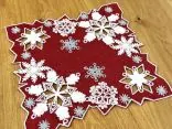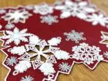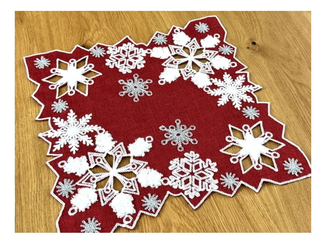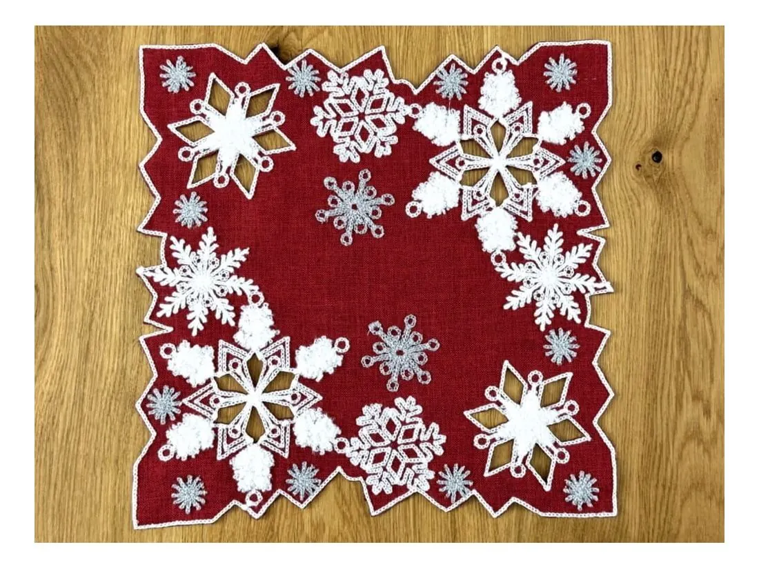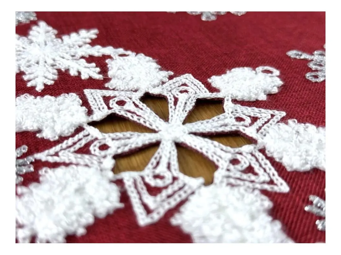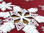Serwetkę zdobią subtelne, białe śnieżynki wykonane techniką haftu, które w piękny sposób symbolizują radosny czas świąteczny. Misternie haftowane śnieżynki tworzą elegancki wzór, wprowadzając do wnętrza atmosferę zimowej krainy.