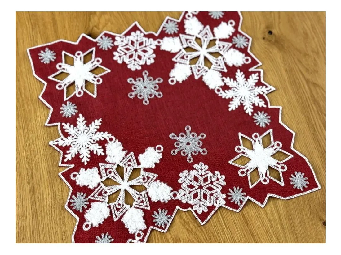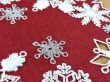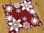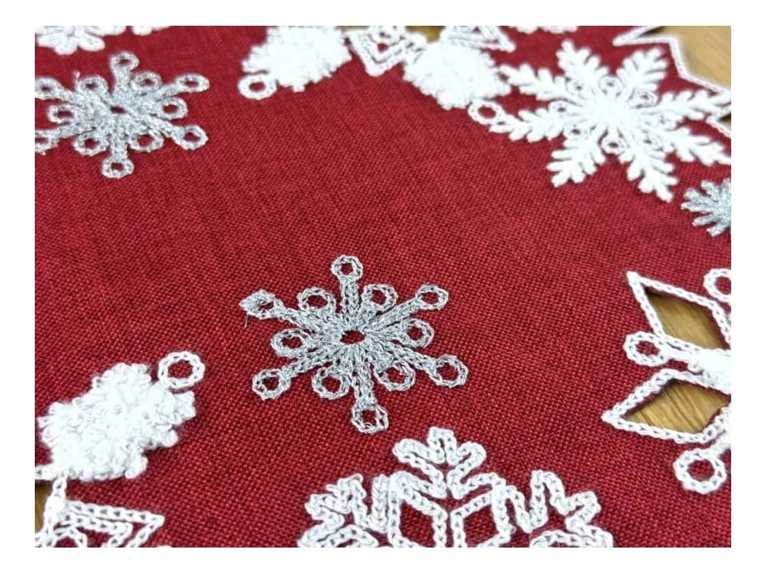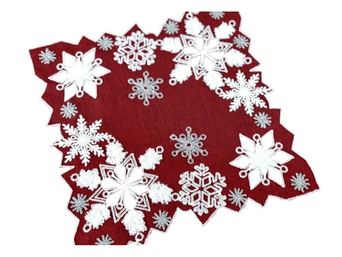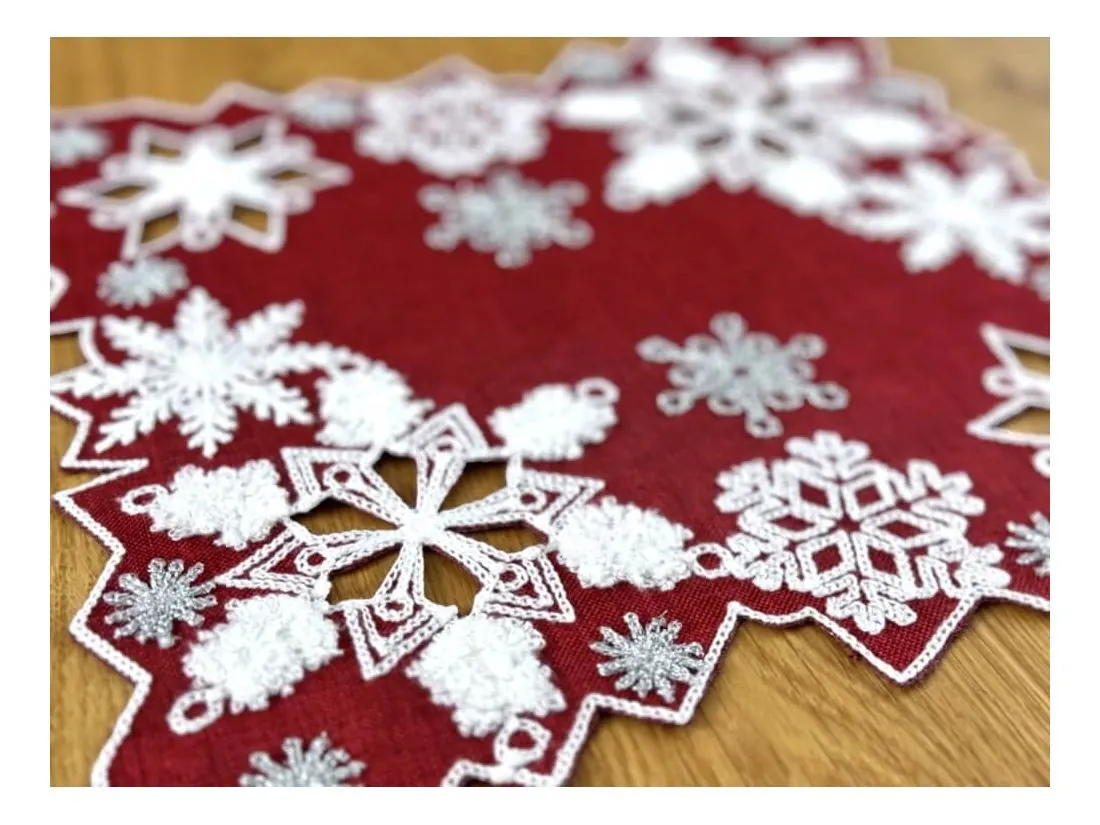 Serwetkę zdobią subtelne, białe śnieżynki wykonane techniką haftu, które w piękny sposób symbolizują radosny czas świąteczny. Misternie haftowane śnieżynki tworzą elegancki wzór, wprowadzając do wnętrza atmosferę zimowej krainy.