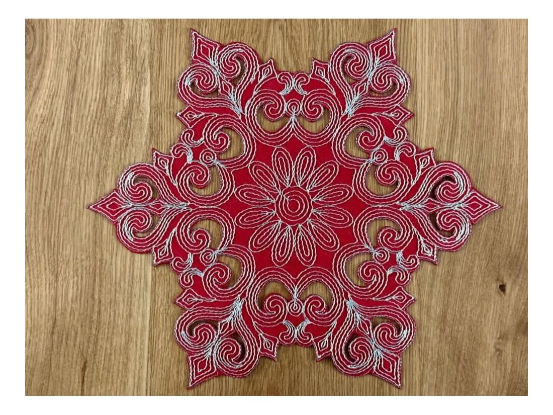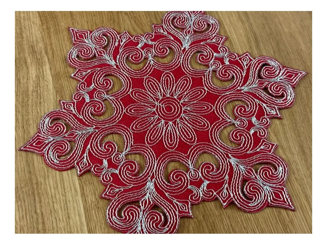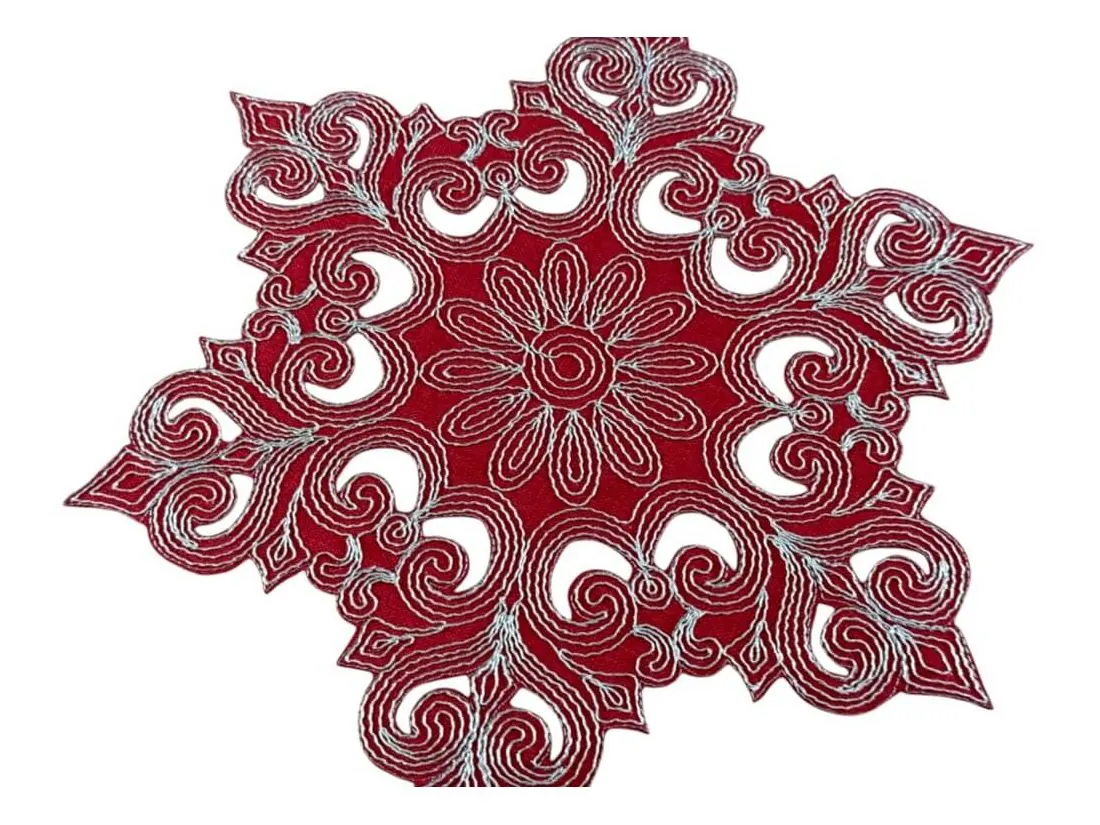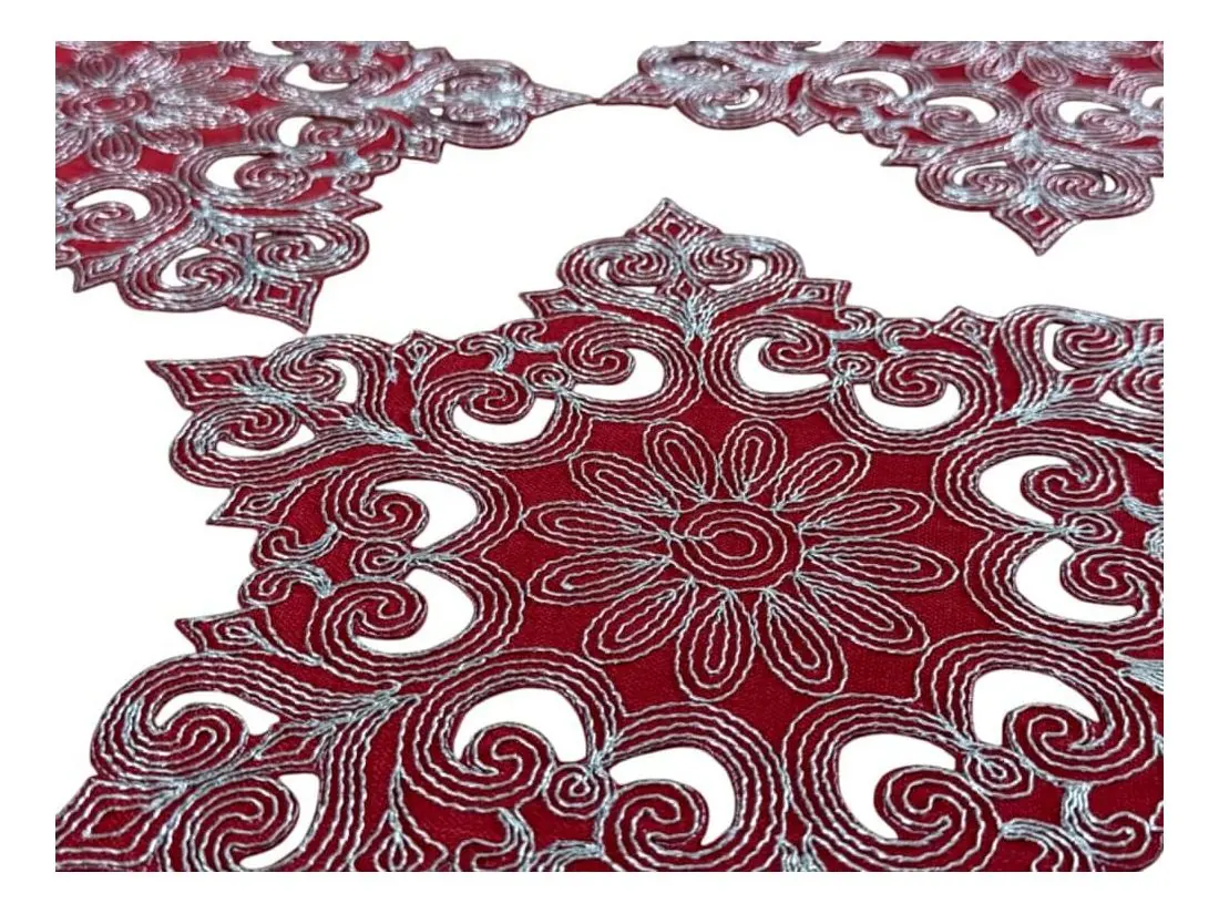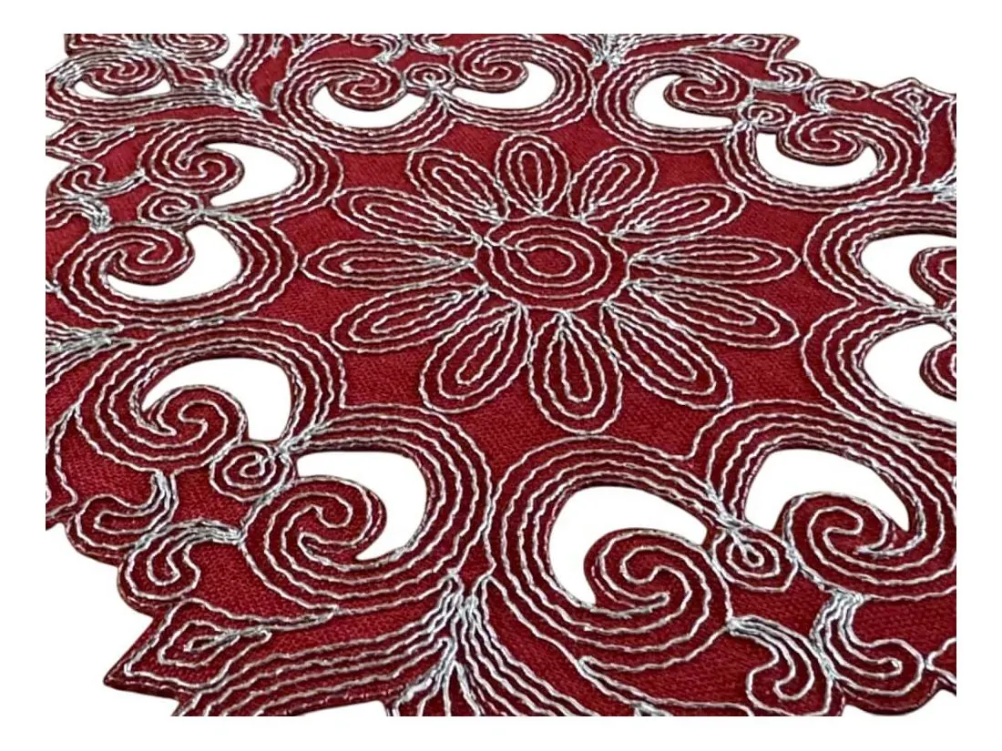 Starannie wyhaftowany srebrny wzór doskonale współgra z intensywną czerwienią materiału, tworząc stylowy akcent na stole. Ta serwetka to idealny wybór na czas Bożego Narodzenia, przyciągający wzrok i podkreślający wyjątkowy charakter świątecznych chwil.