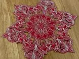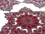 Czerwona serwetka świąteczna wykonana z poliestru, ozdobiony eleganckim srebrnym haftem, to wyjątkowy dodatek, który wprowadza do wnętrza świąteczną atmosferę. Tkanina z dodatkiem lurexu, z subtelnie wplecionymi srebrnymi nićmi, pięknie odbija światło, tworząc delikatny efekt brokatu i dodając blasku całej aranżacji.
