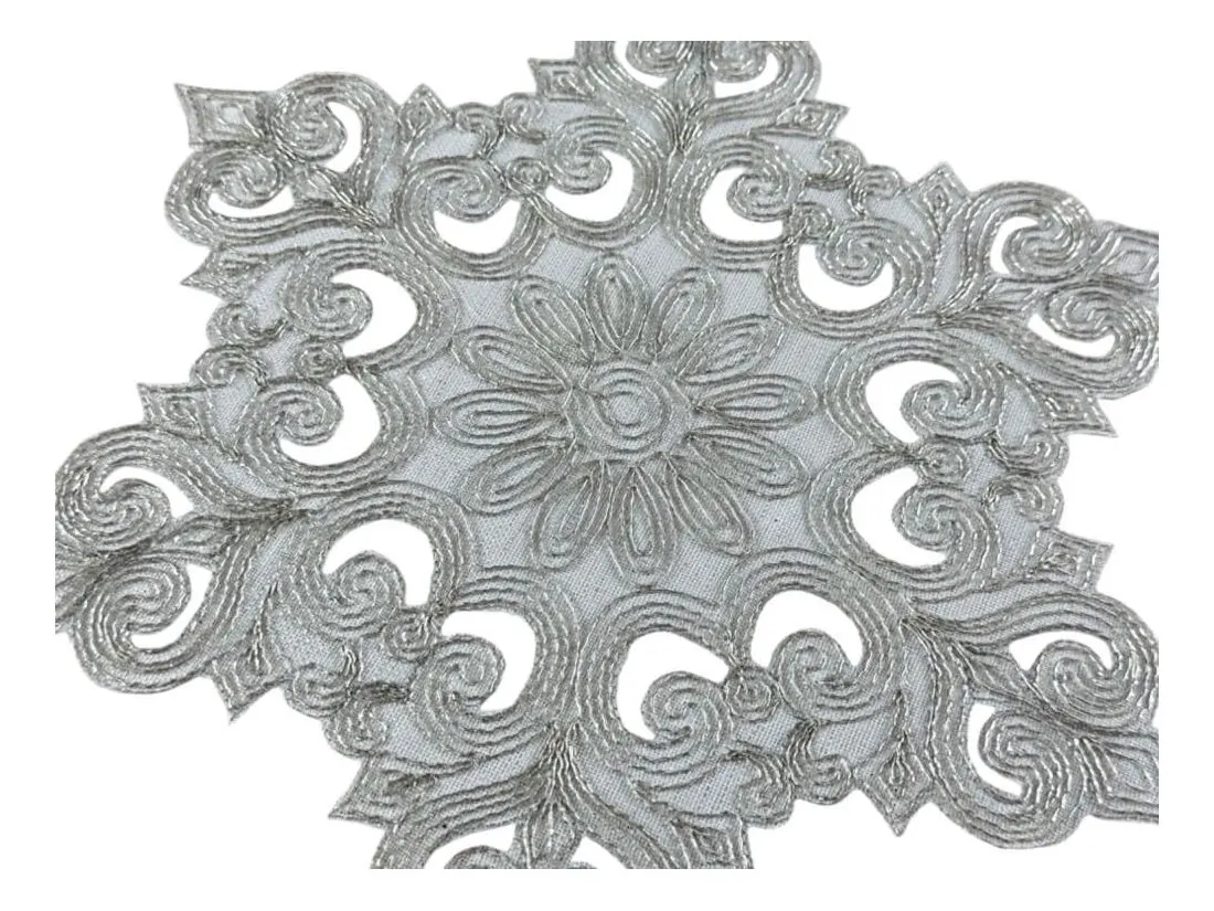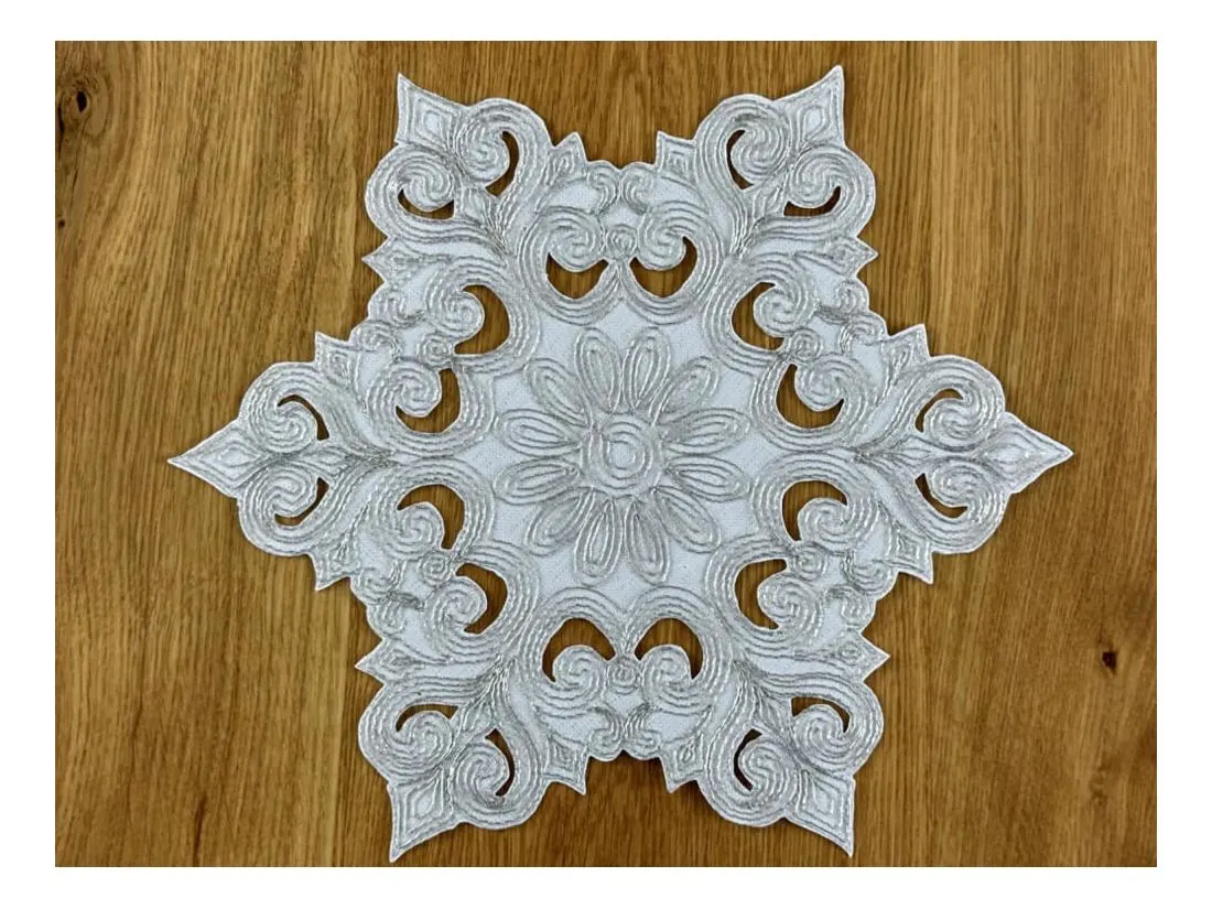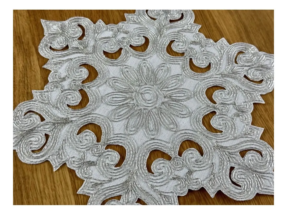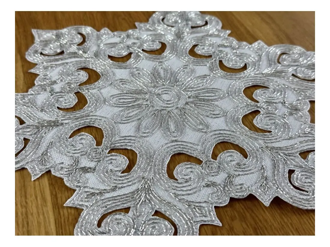 Precyzyjnie wyhaftowany srebrny wzór harmonijnie komponuje się z białym materiałem, tworząc elegancki akcent na świątecznym stole. Ta serwetka to doskonały wybór na czas Bożego Narodzenia, przyciągający uwagę i podkreślający magiczną atmosferę świąt.