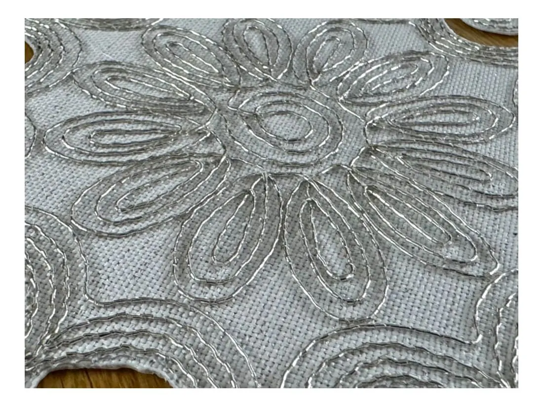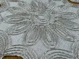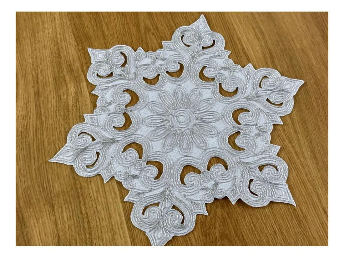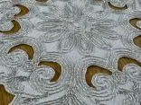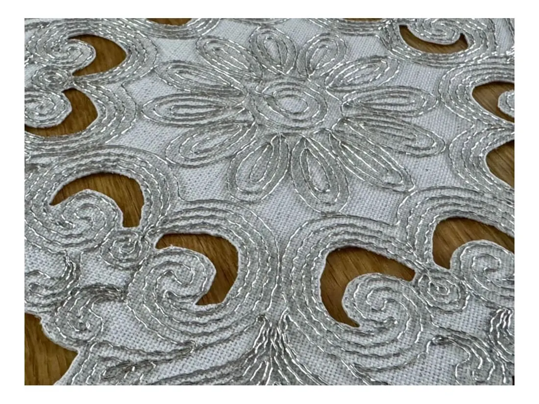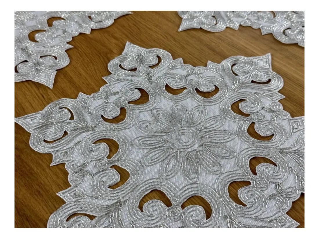 Precyzyjnie wyhaftowany srebrny wzór harmonijnie komponuje się z białym materiałem, tworząc elegancki akcent na świątecznym stole. Ta serwetka to doskonały wybór na czas Bożego Narodzenia, przyciągający uwagę i podkreślający magiczną atmosferę świąt.