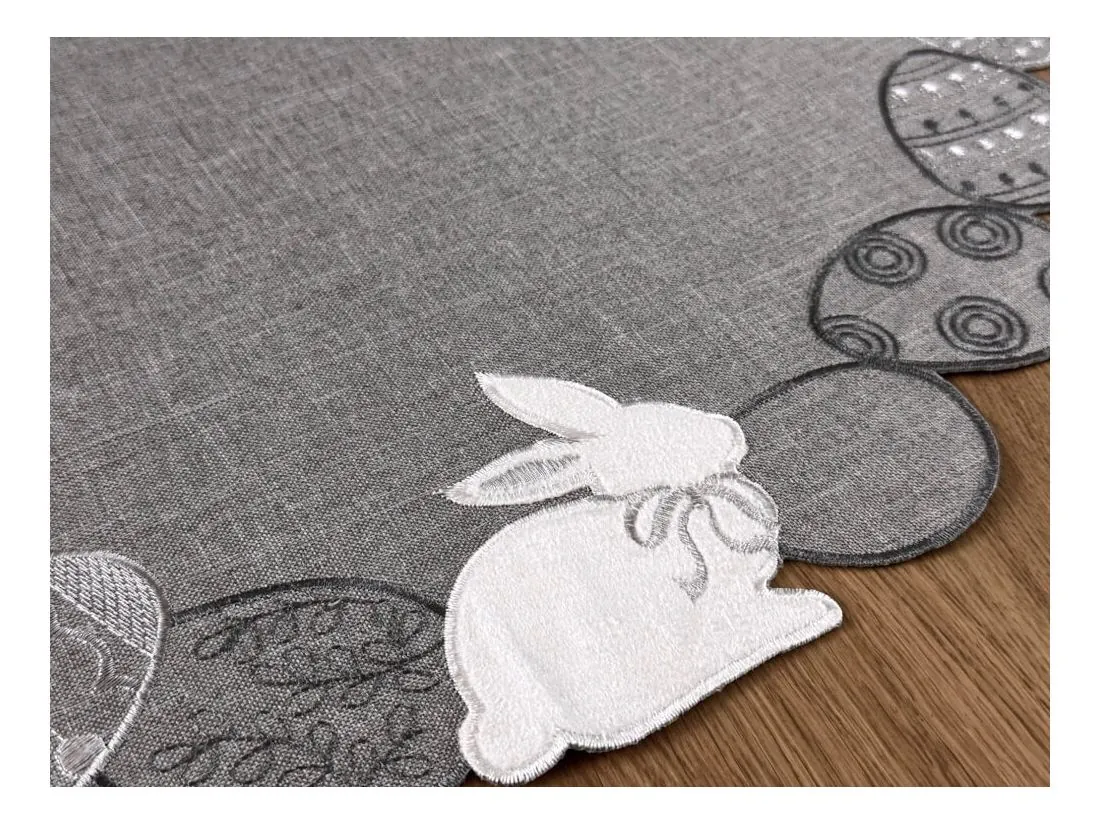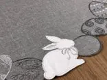 Brzegi serwetki zdobią urocze, welwetowe zajączki, które dodają przytulności i miękkiej, eleganckiej tekstury. Delikatne haftowane pisanki to wyjątkowy akcent podkreślający świąteczny charakter, nadający całości klasycznego uroku.