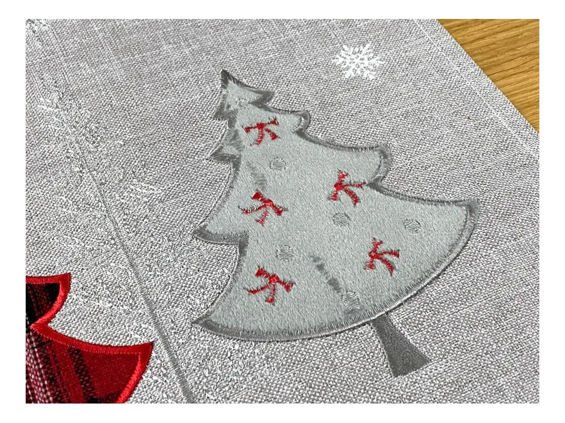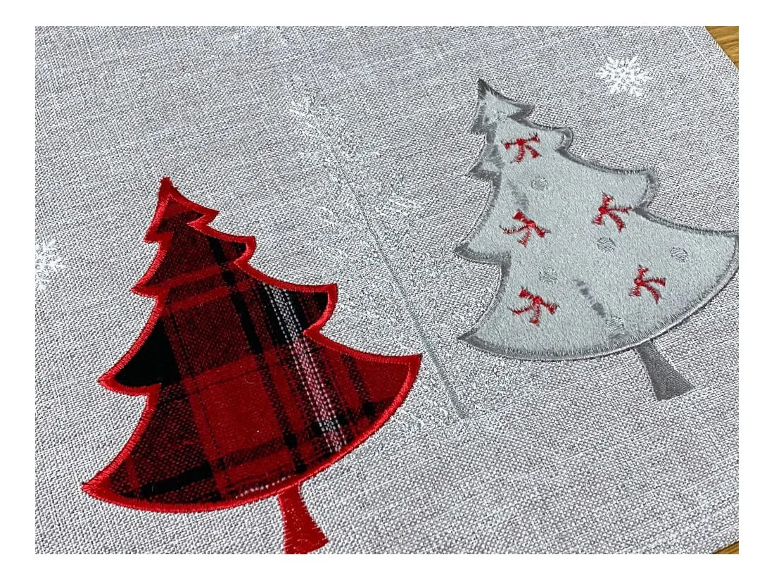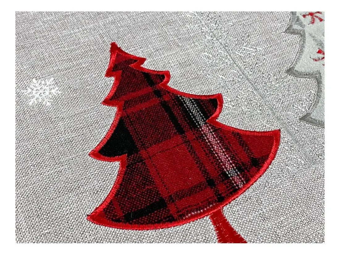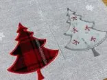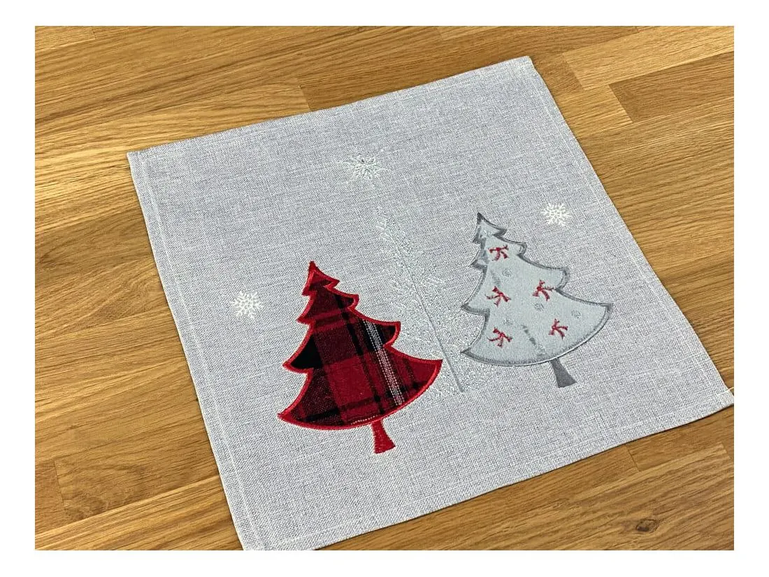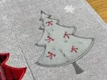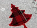 Serwetka świąteczna w rozmiarze 30x30 cm w kolorze szarym z bogato zdobioną aplikacją czerwono srebrnych choinek, została wykonana na tkaninie lurex 100 % poliestrowej, charakteryzuje się nowoczesnym designem, świątecznym wzorem oraz modnym kolorem. Dzięki zastosowanym srebrnym niciom w strukturze, tkanina lurex połyskuje.
