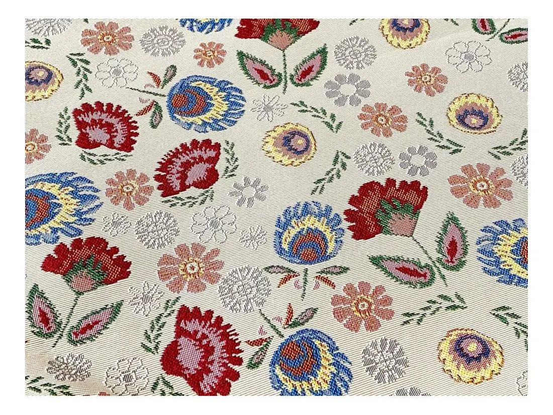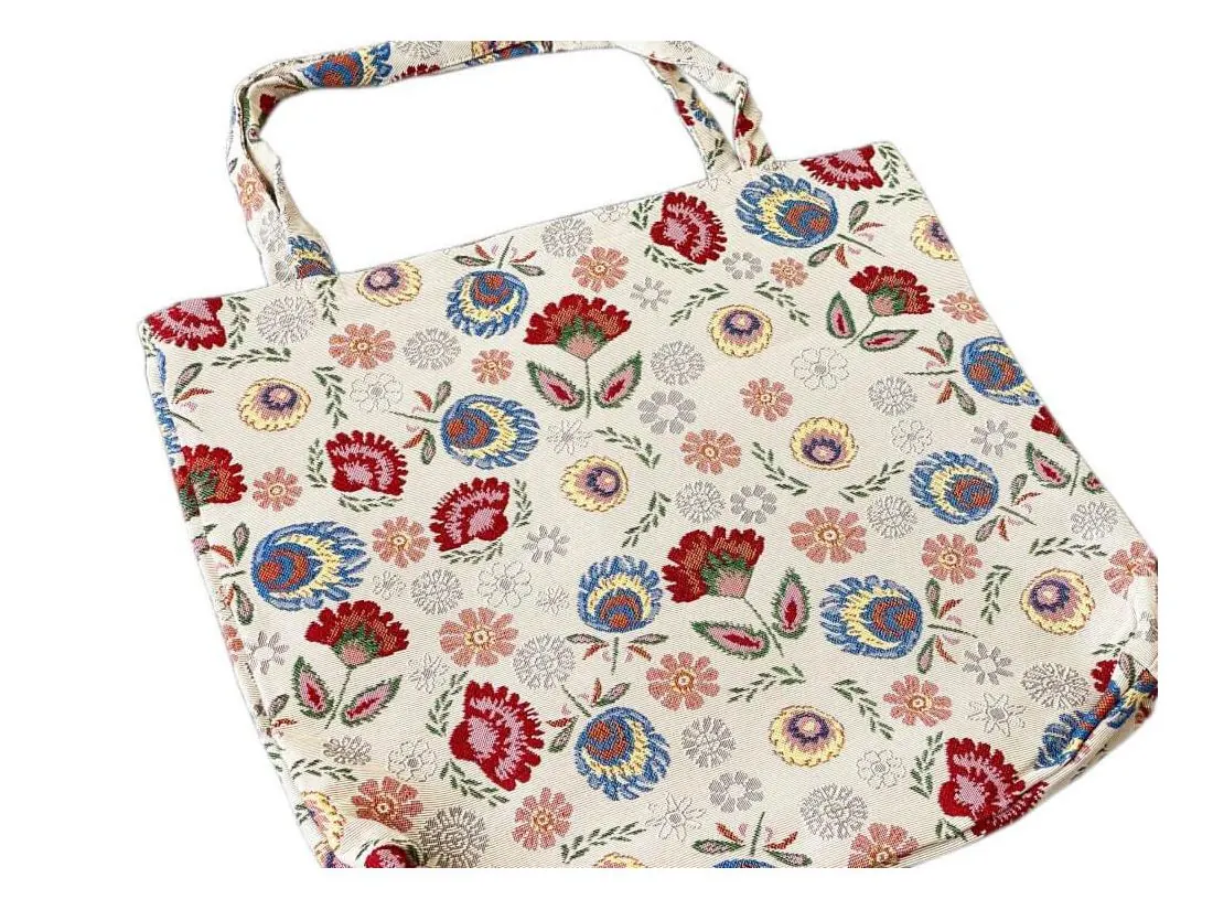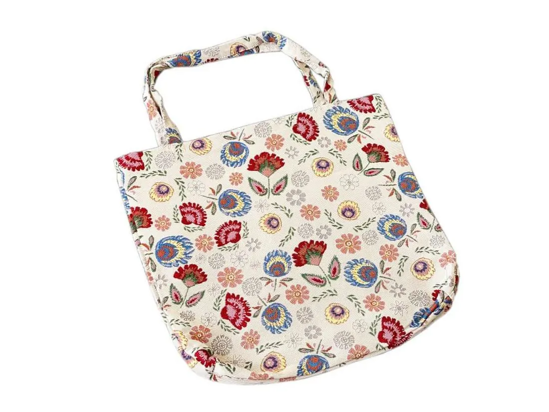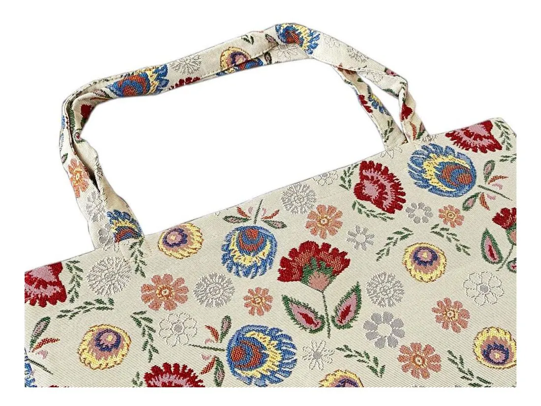 Torba gobelin duża ze wzorem łowickim na jasnym tle na zakupy i nie tylko. Torba została wykonana z wysokiej jakości grubej, mocnej tkaniny gobelinowej. Torba gobelinowa idealnie sprawdzi się podczas zakupów, na spacerze czy na dokumenty.