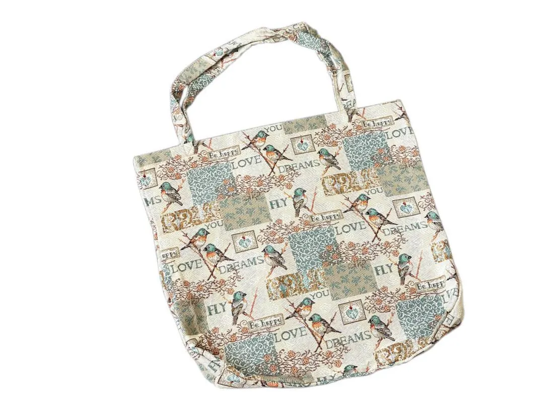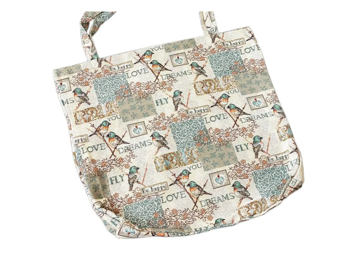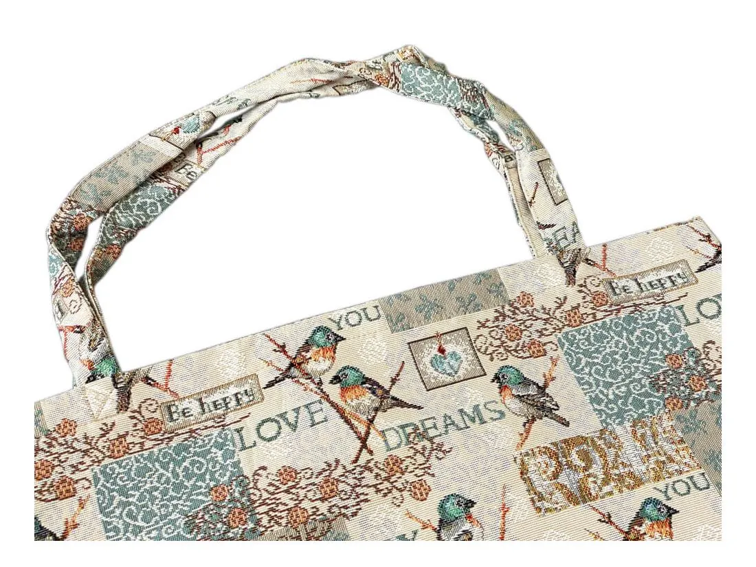 Torba gobelin duża z uroczymi ptaszkami na jasnym tle na zakupy i nie tylko. Torba została wykonana z wysokiej jakości grubej, mocnej tkaniny gobelinowej. Torba gobelinowa idealnie sprawdzi się podczas zakupów, na spacerze czy na dokumenty.