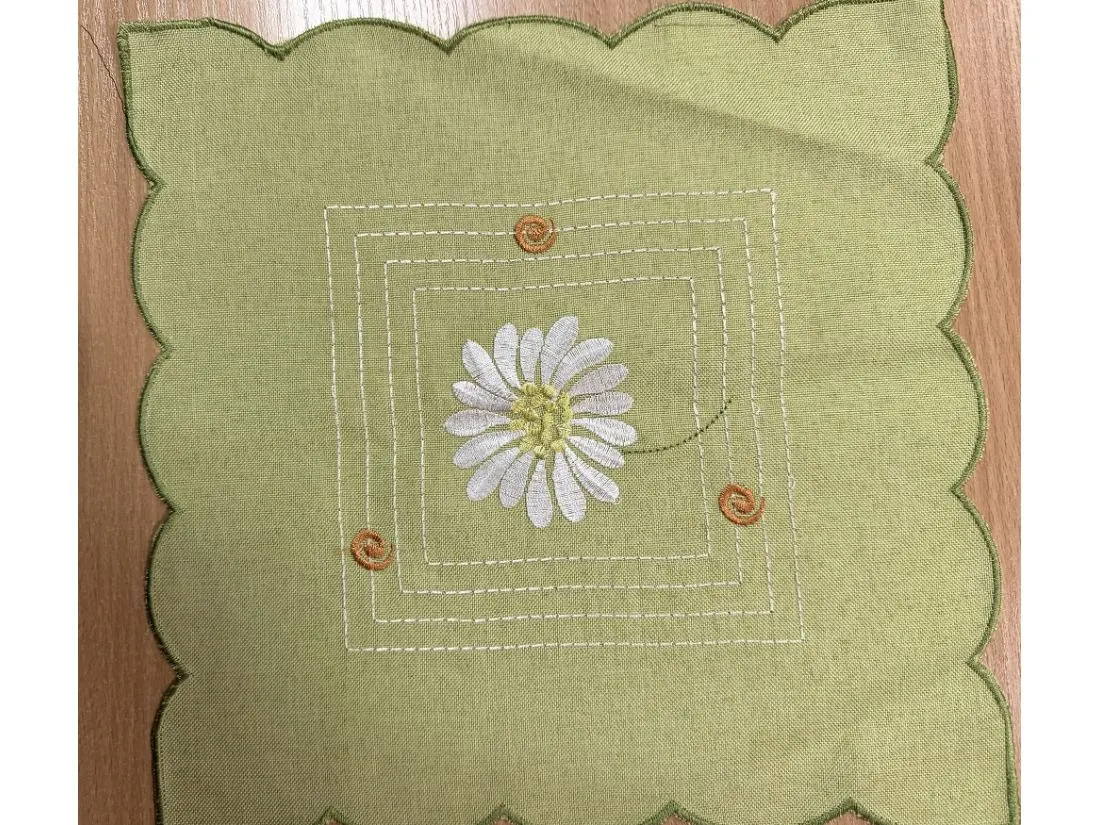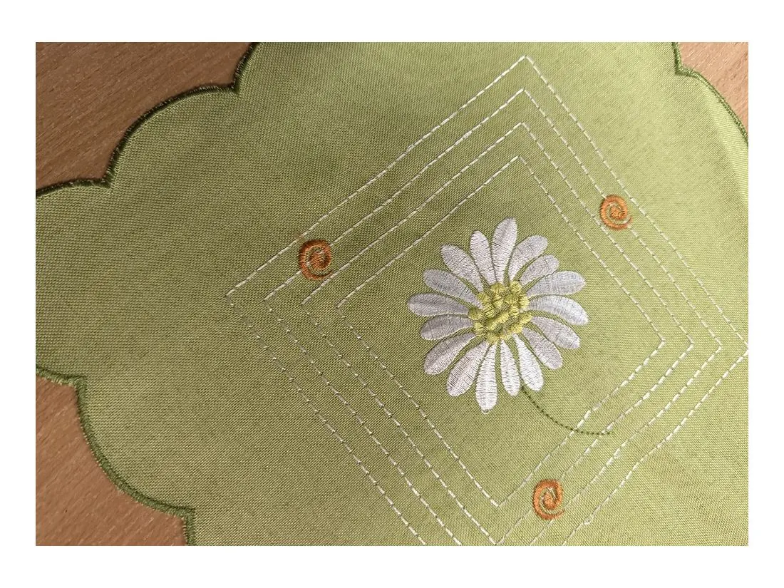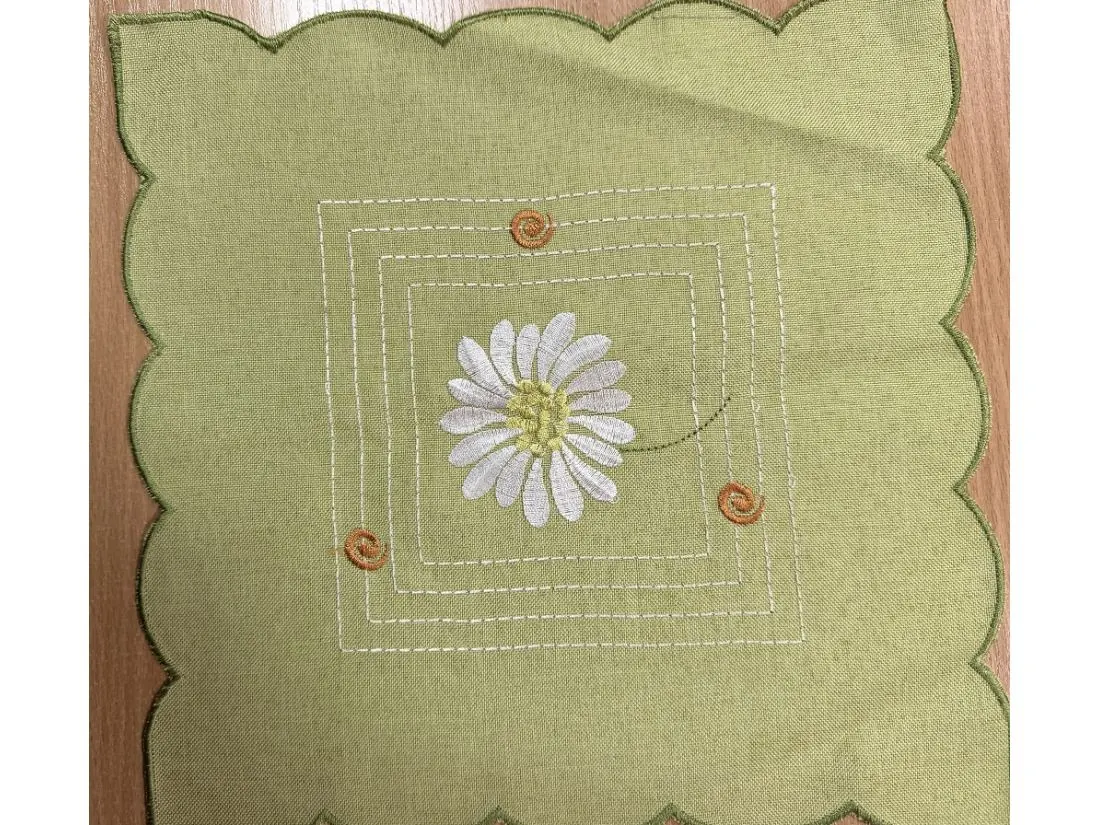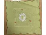 - Design: Intensywne, zielone tło stanowi bazę dla precyzyjnego haftu białych margaretek z charakterystycznym żółtym środkiem. Kwiatowy motyw nadaje serwetce radosnego, wiosennego charakteru.