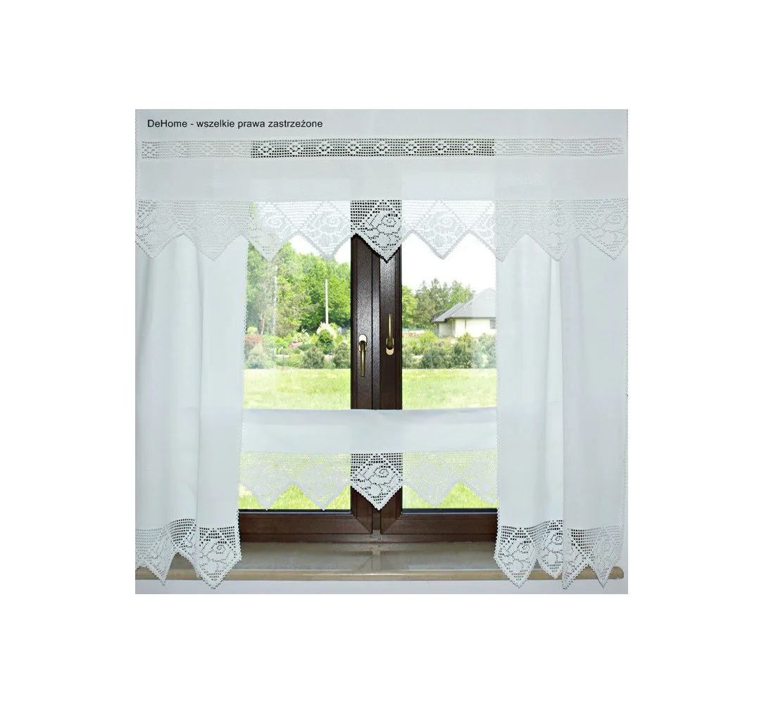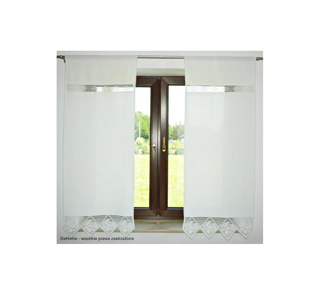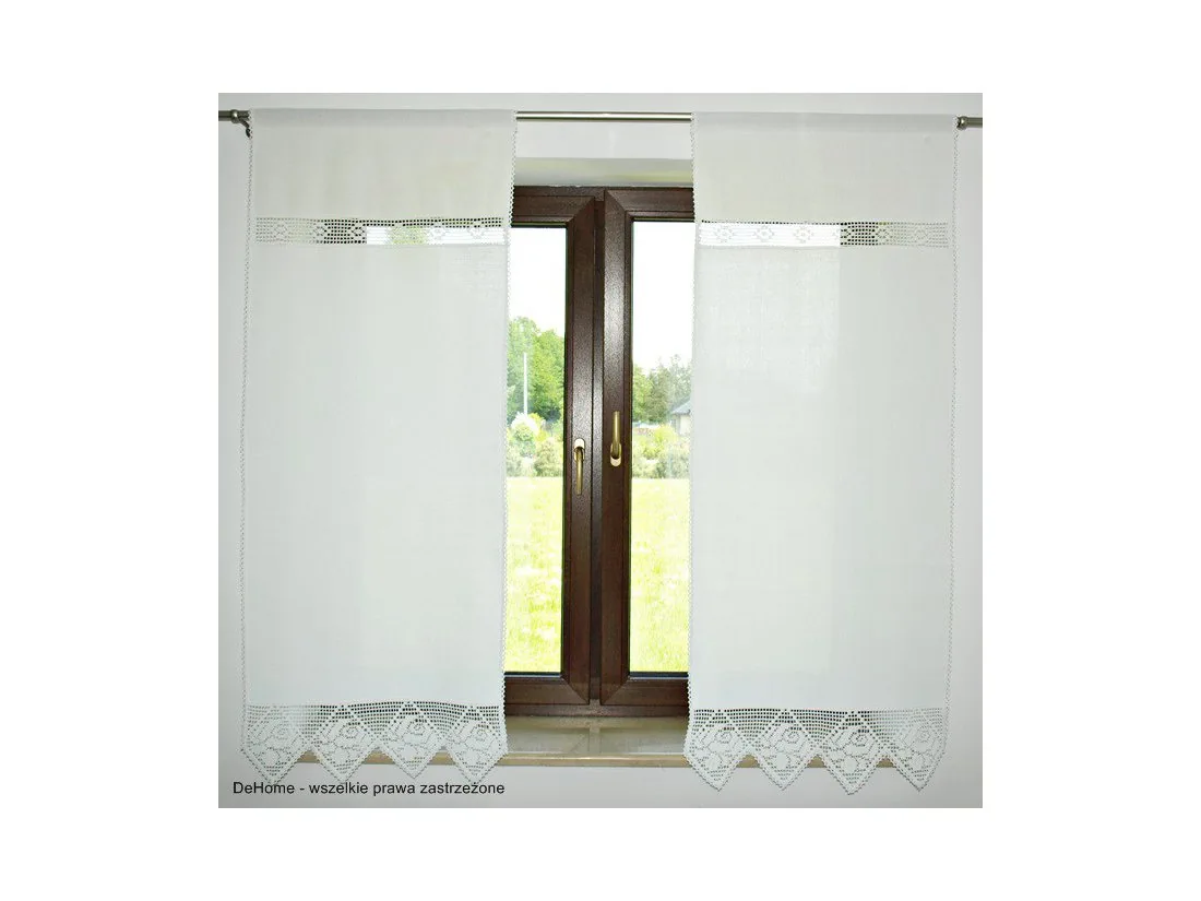 Dekoracyjna zasłona w rozmiarze 150 x 60 cm /wys/szer./ w kolorze białym wykończona ozdobną koronką nada niepowtarzalny klimat każdej jadalni, kuchni.
