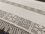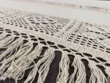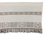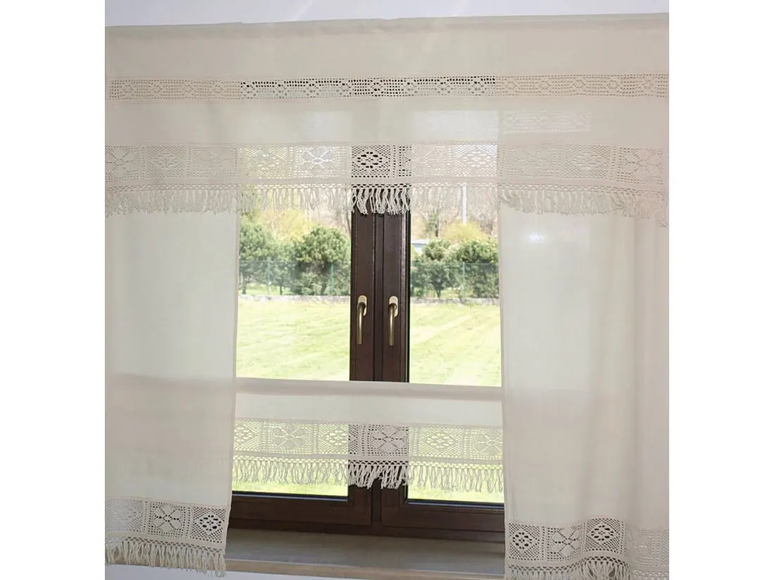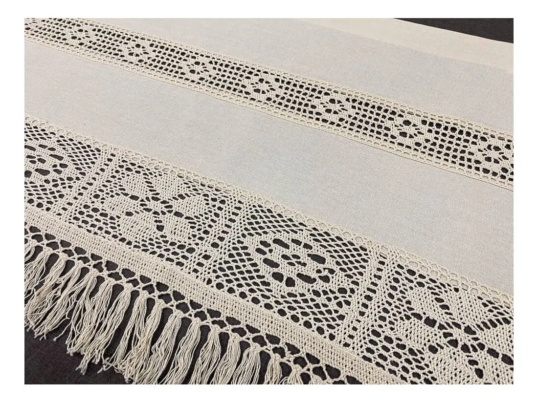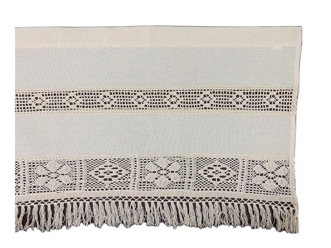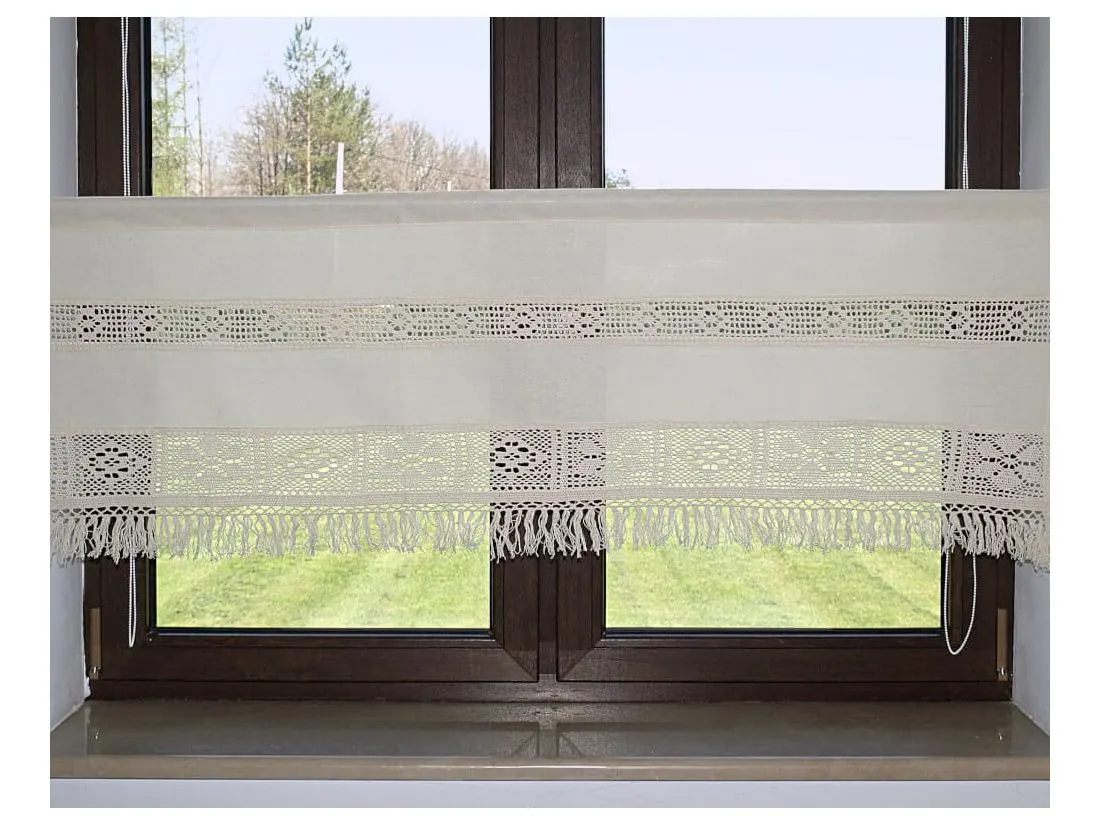 Dekoracyjna zazdrostka w rozmiarze 50 x 200 cm /wys/dł/ w kolorze beżowym została wykończona ozdobną koronką oraz frędzlami, nada niepowtarzalny klimat każdej jadalni, kuchni.