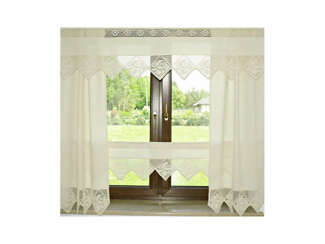 Do dekoracji okna z kolekcji Firan Idylla są dostępne zazdrostki, lambrekiny oraz zasłony.