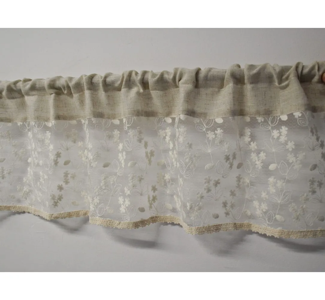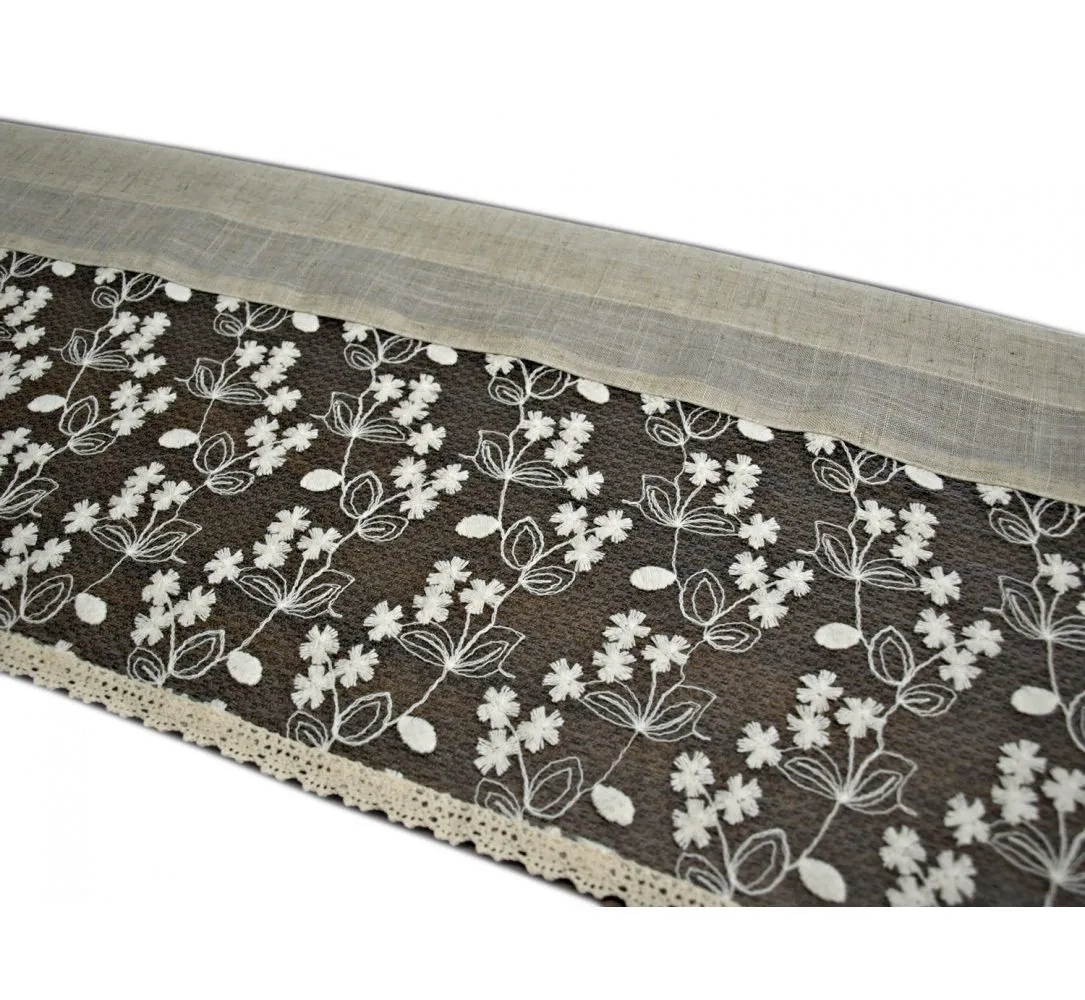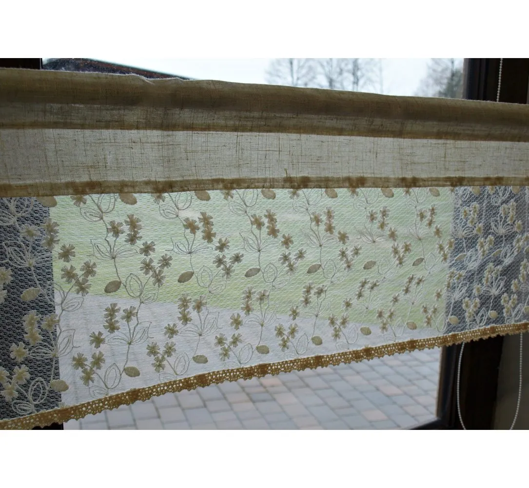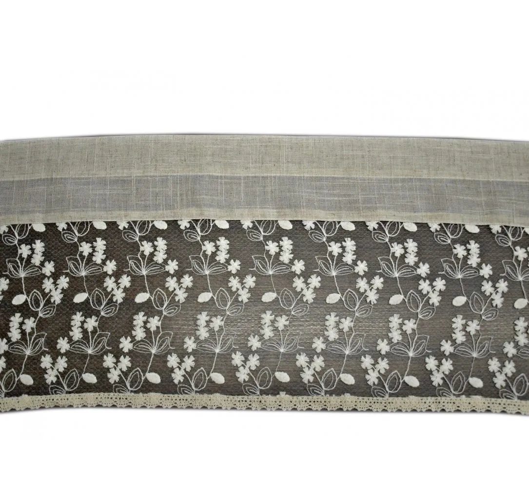 Kolekcja firan z organtyną to wyjątkowe połączenie tkaniny w kolorze lnu oraz dekoracyjnej organtyny z haftowanymi uroczymi kwiatkami, dół firanki zakończony delikatną koronką.