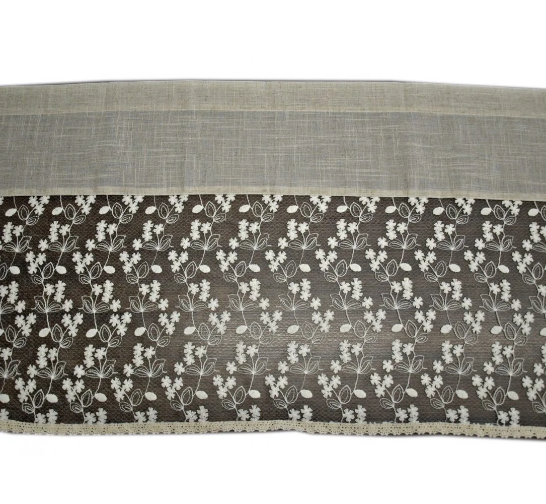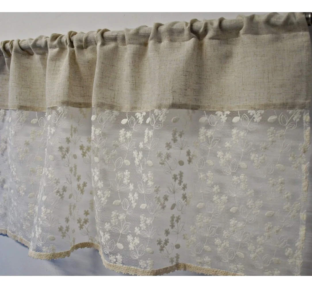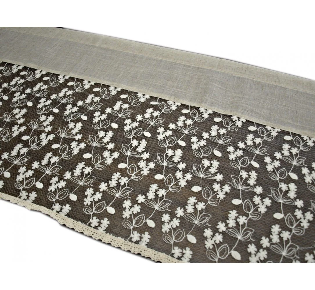 Kolekcja firan z organtyną to wyjątkowe połączenie tkaniny w kolorze lnu oraz dekoracyjnej organtyny z haftowanymi uroczymi kwiatkami, dół firanki zakończony delikatną koronką.