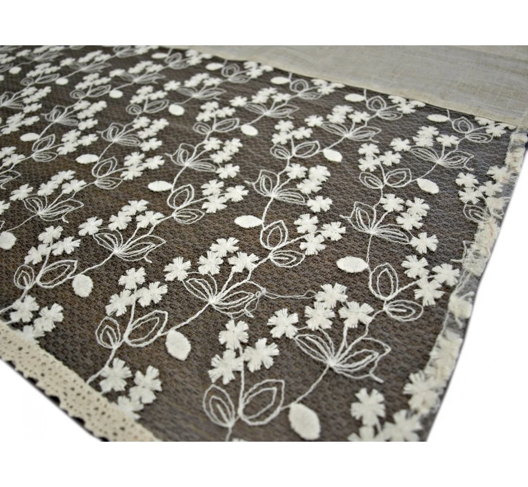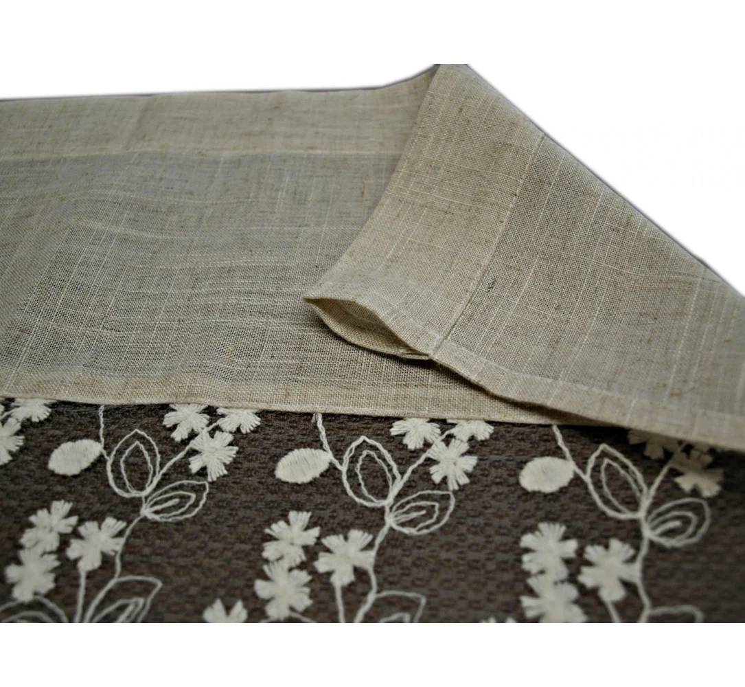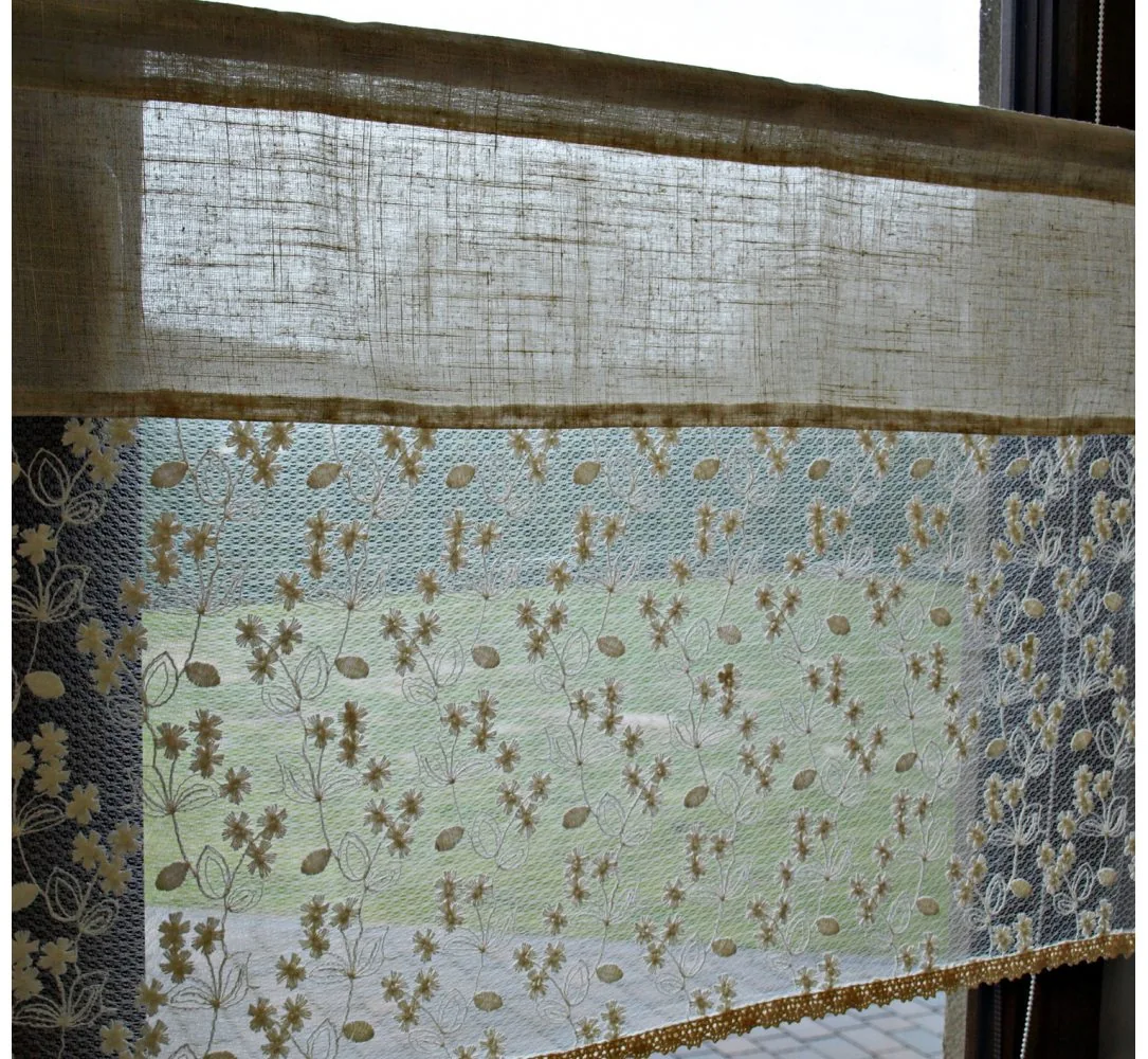 Kolekcja firan z organtyną to wyjątkowe połączenie tkaniny w kolorze lnu oraz dekoracyjnej organtyny z haftowanymi uroczymi kwiatkami, dół firanki zakończony delikatną koronką.