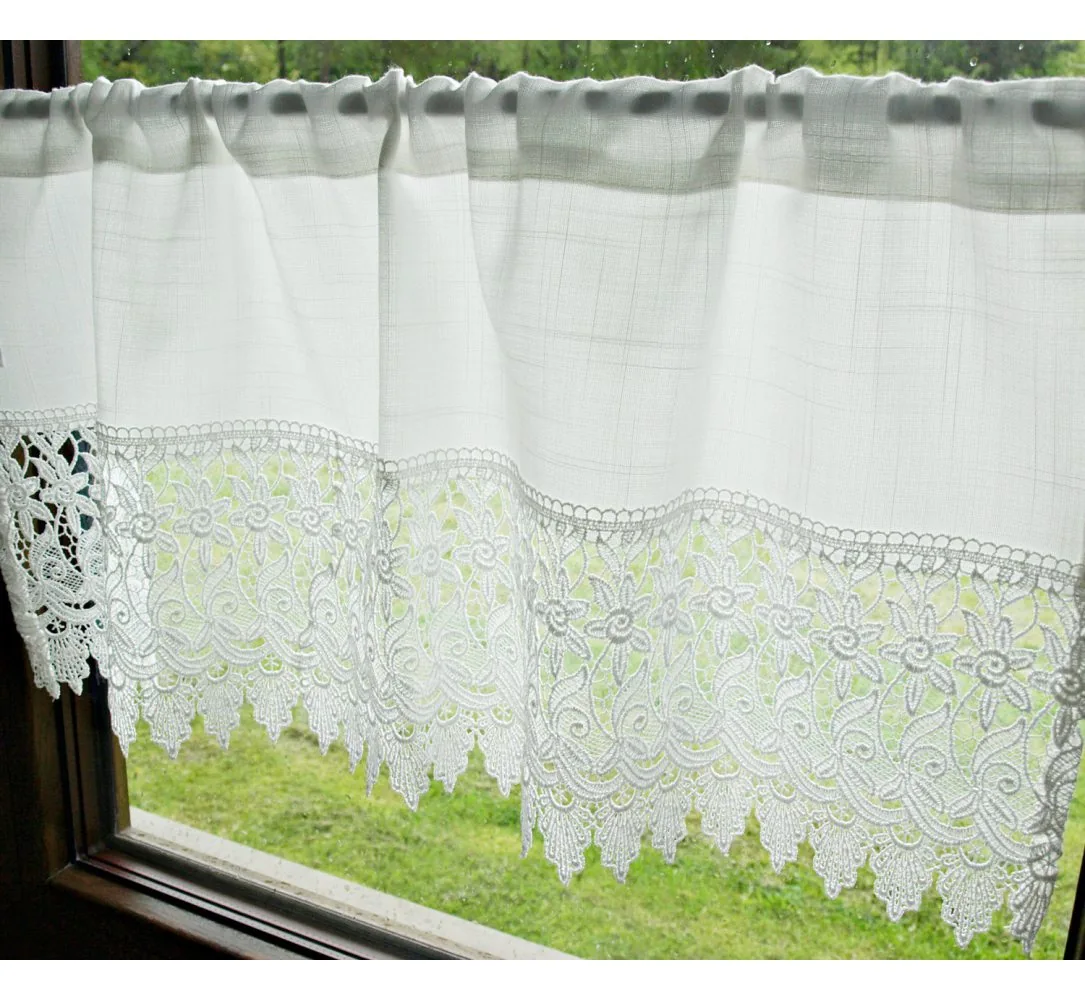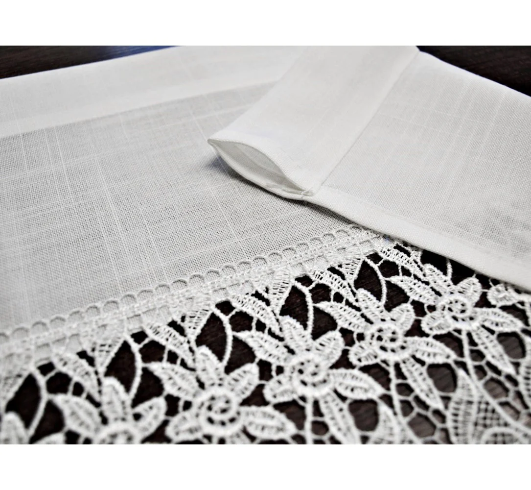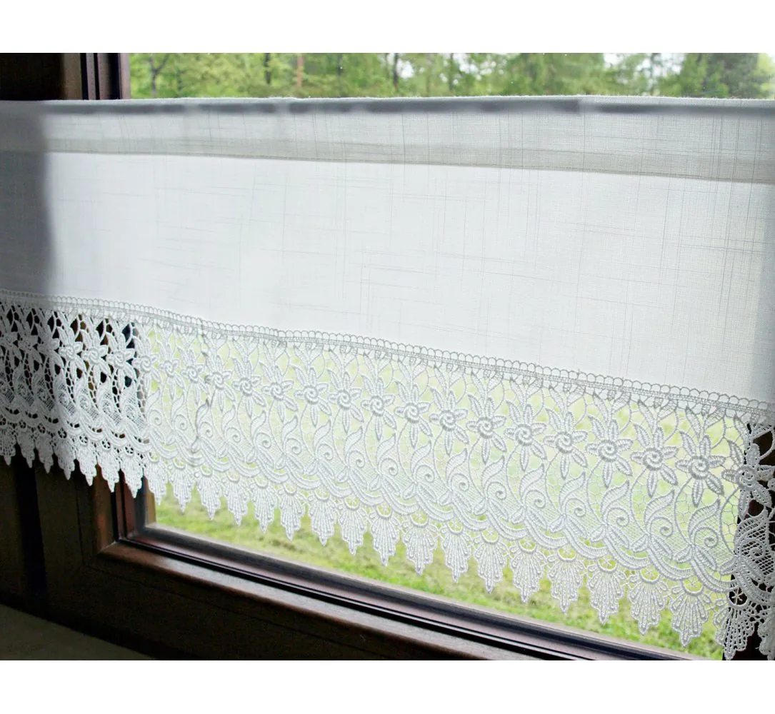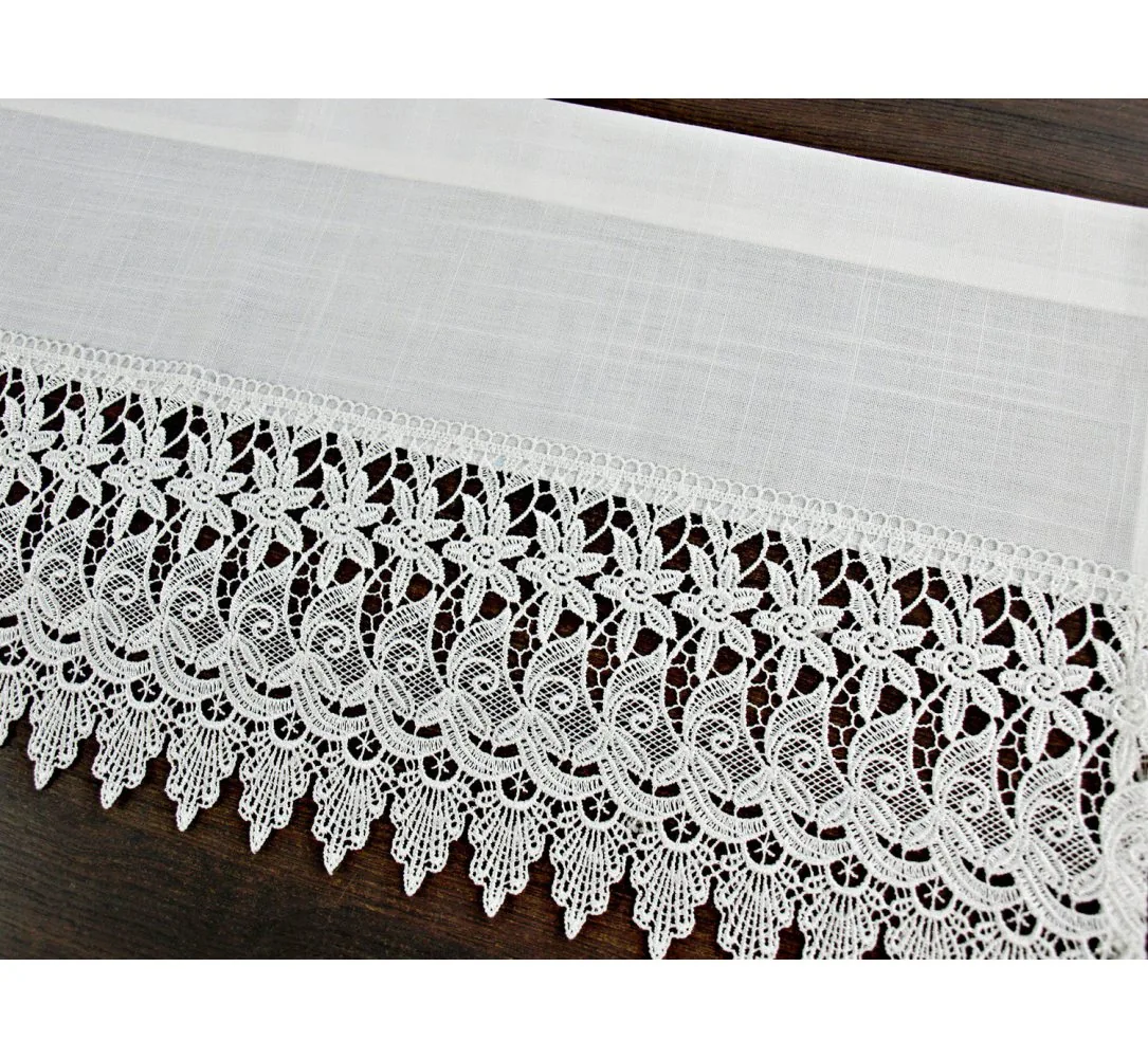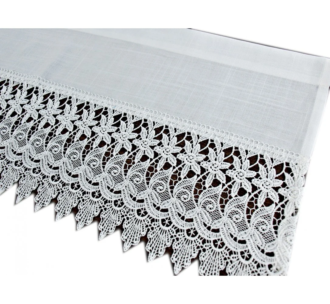 Dekoracyjna zazdrostka z gipiurą o wymiarach 50 x 150 cm (wysokość x szerokość) w eleganckim kolorze złamanej bieli (odcień jasnego kremu). Wykończona ozdobną, bogatą koronką, stanowi idealne rozwiązanie dla osób szukających wyższej firanki, która łączy prywatność z unikalnym stylem.